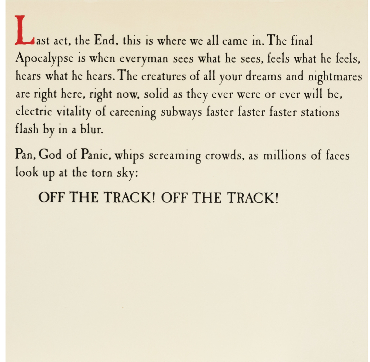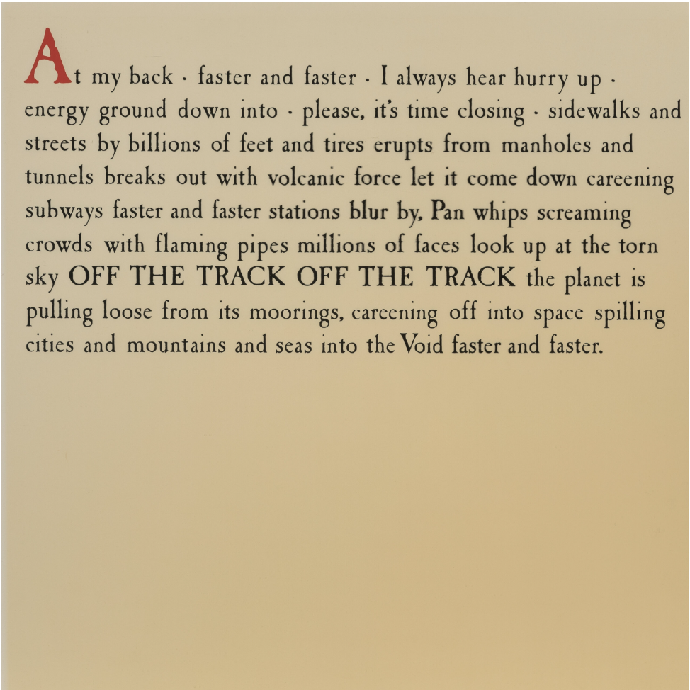 At my back . faster and faster . I always hear hurry up . energy ground down into . please, it’s time closing . sidewalks and streets by billions of feet and tires erupts from manholes and tunnels break out with volcanic force let it come down careening subways faster and faster stations blur by, Pan whips screaming crowds with flaming pipes millions of faces look up at the torn sky OFF THE TRACK OFF THE TRACK the planet is pulling loose from its moorings, careening off into space spilling cities and mountains and seas into the Void faster and faster.