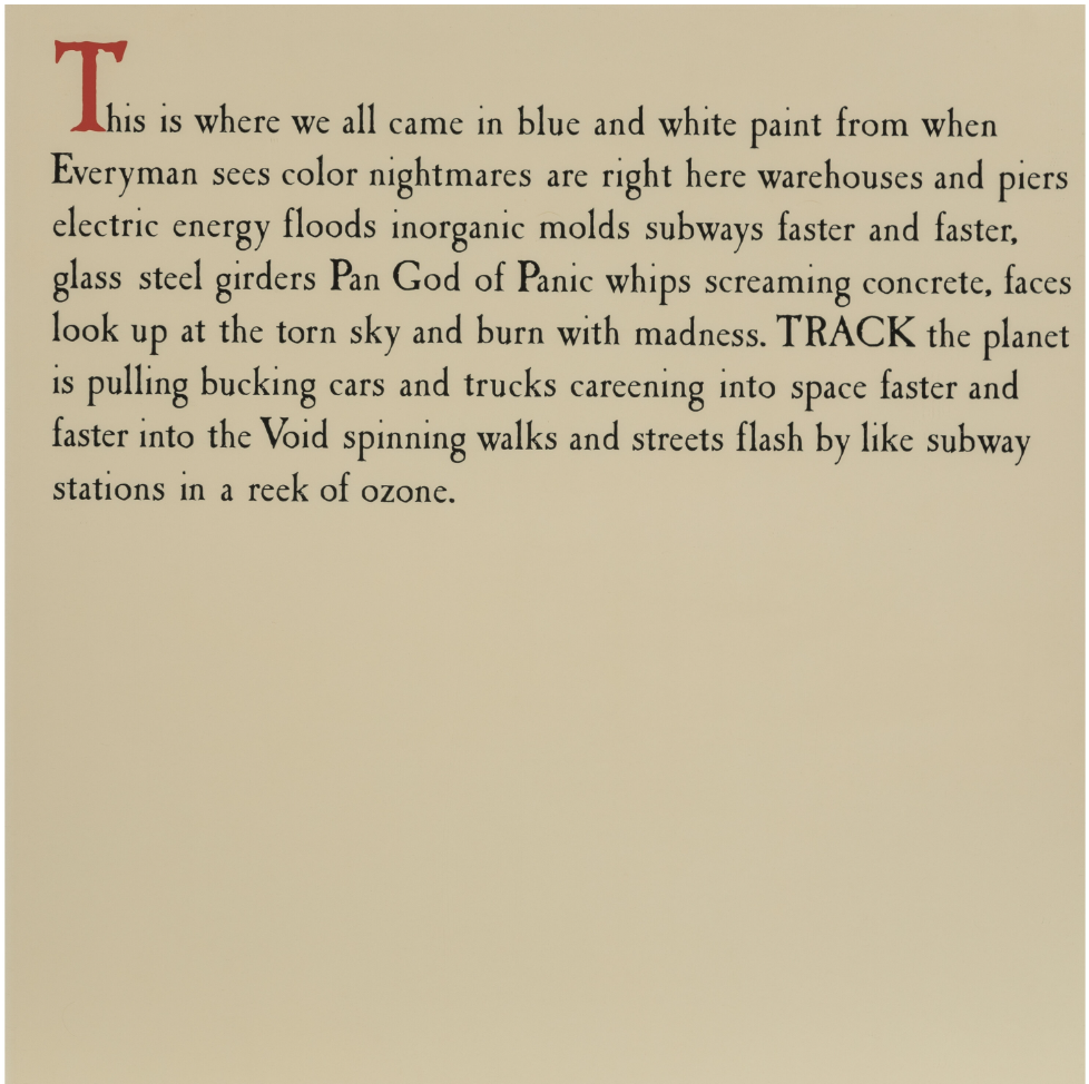 This is where we all came in blue and white paint from when Everyman sees color nightmares are right here warehouse and piers electric energy floods inorganic molds subways faster and faster, glass steel girders Pan God of Panic whips screaming concrete, faces look up at the torn sky and burn with madness. TRACK the planet is pulling bucking cars and trucks careening into space faster and faster into the Void spinning walks and streets flash by like subway stations in a reek of ozone.