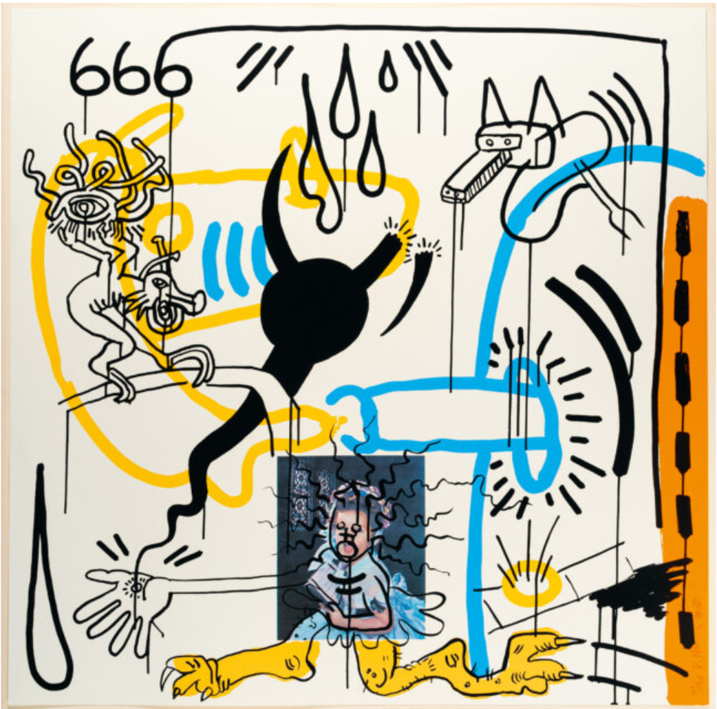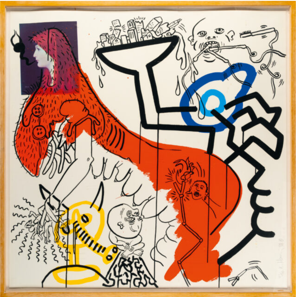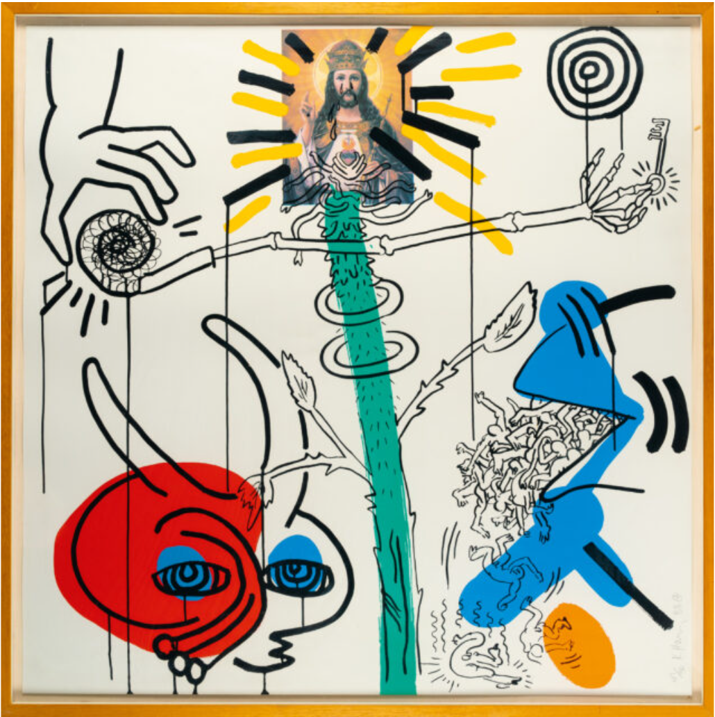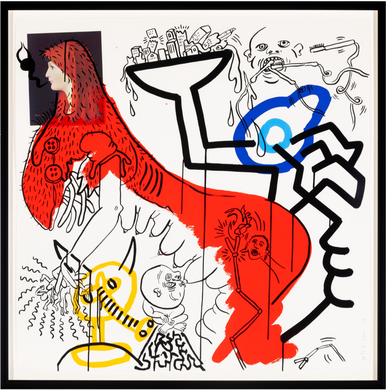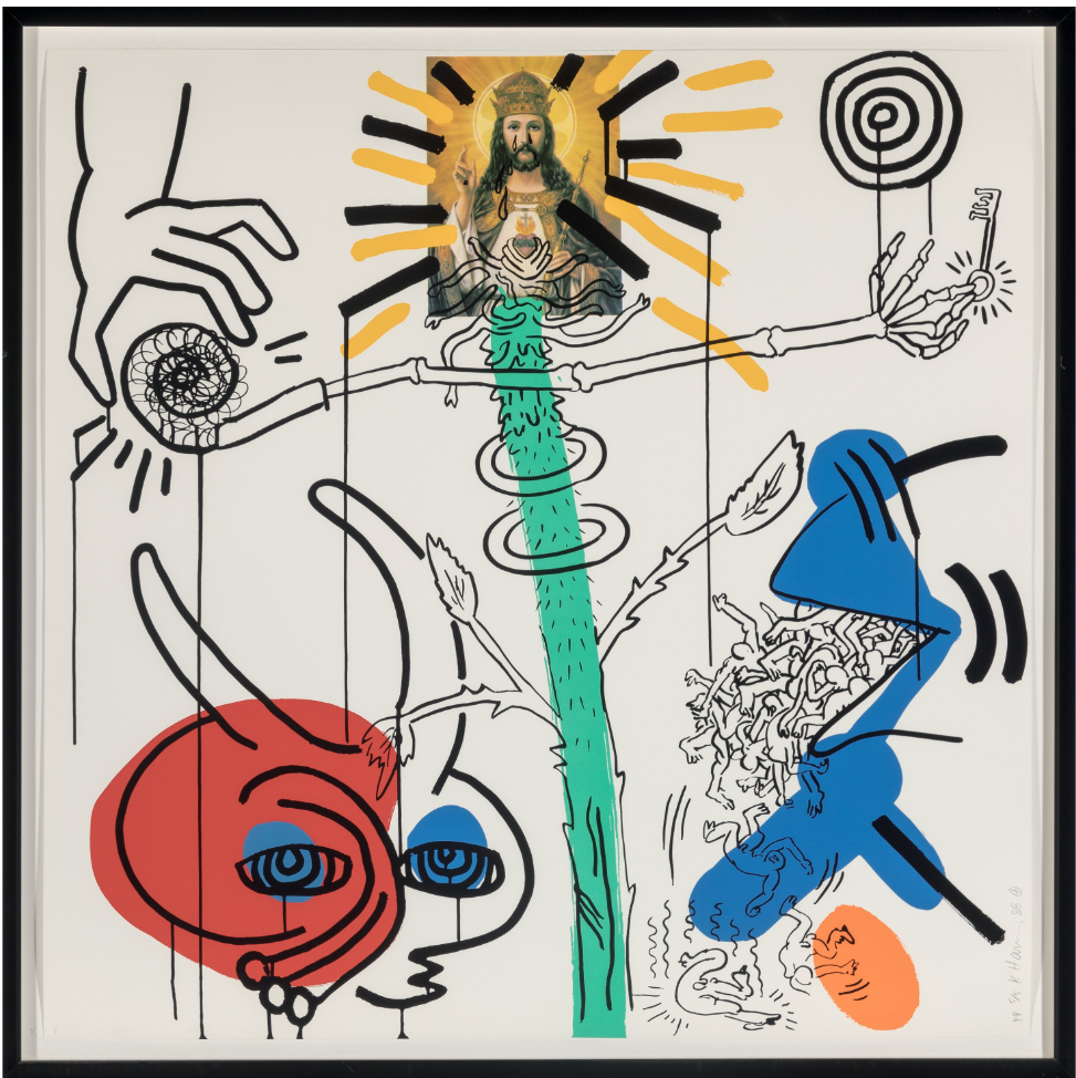 For their 1988 collaboration of Apocalypse, Haring appropriated and collaged symbols of mass consumerism, religion, art and advertisements in response to Burrough’s free-form text. 1988 was also the year that Haring was diagnosed with AIDS, which had already begun to ravage New York’s downtown community.