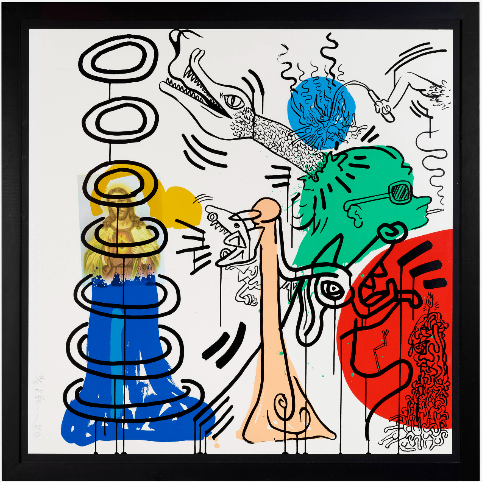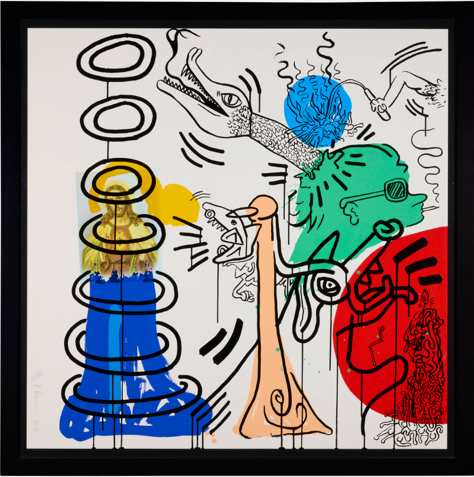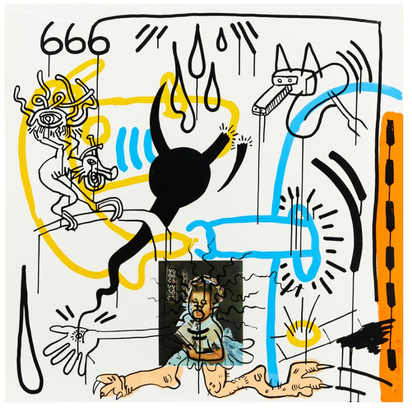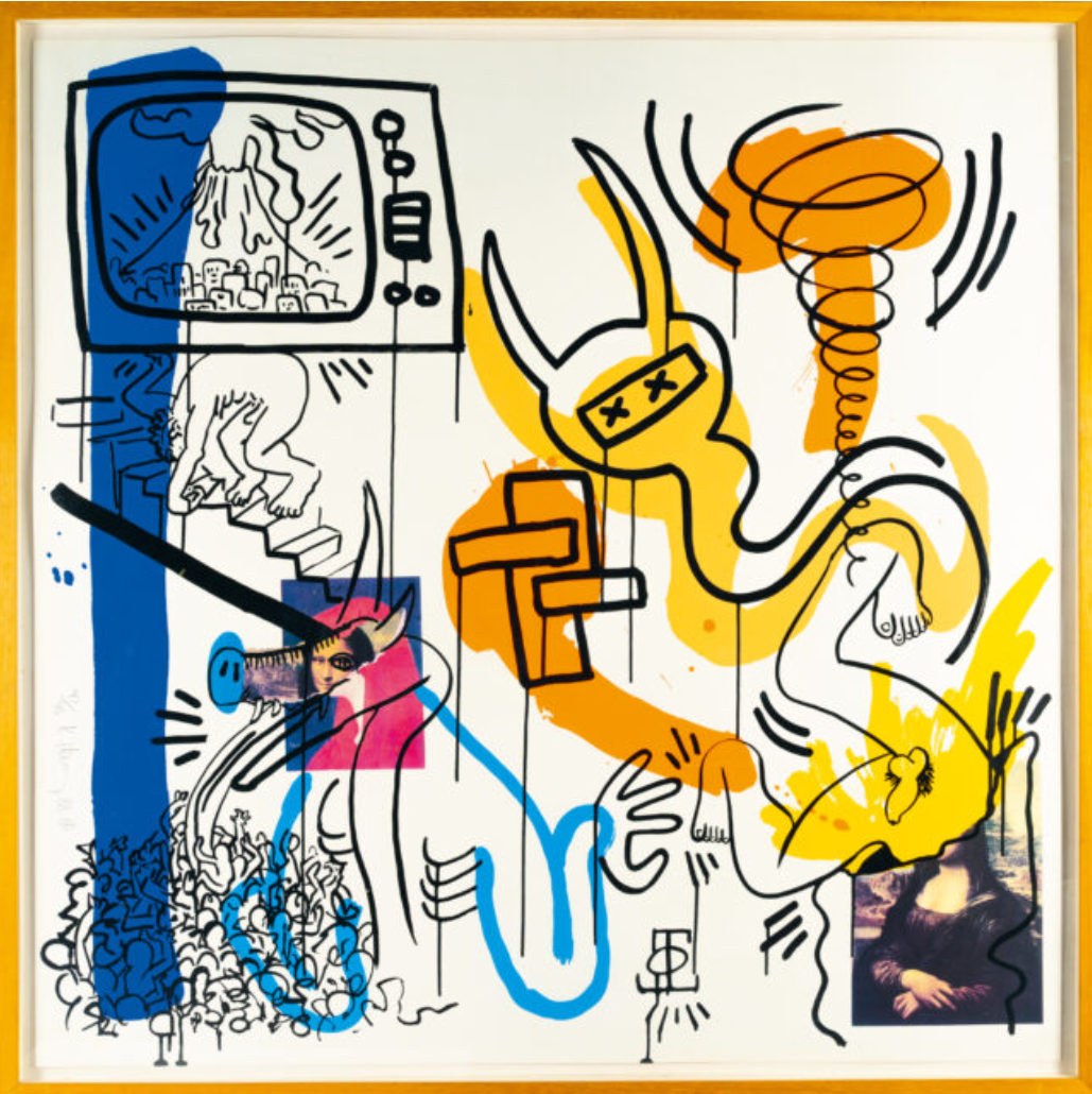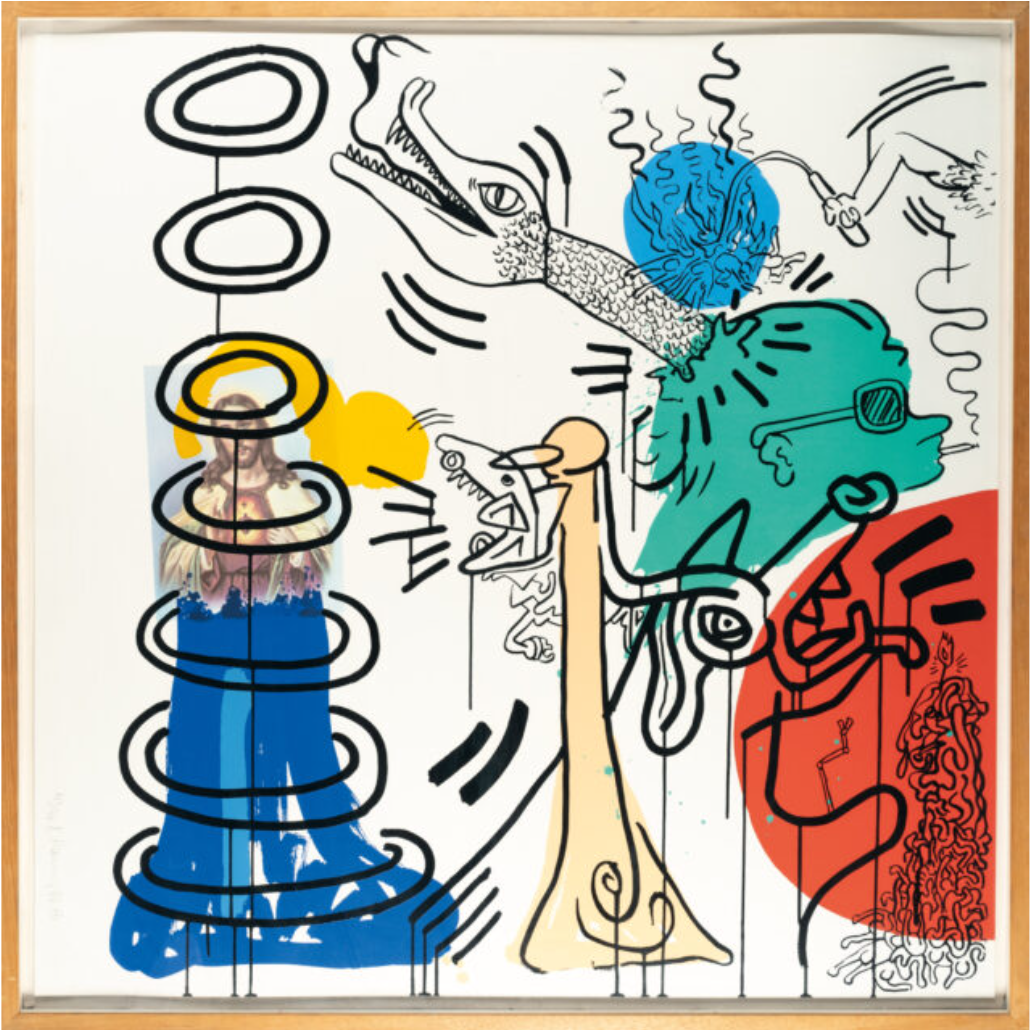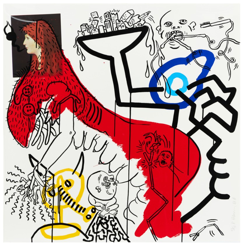 For their 1988 collaboration of Apocalypse, Haring appropriated and collaged symbols of mass consumerism, religion, art and advertisements in response to Burrough’s free-form text. 1988 was also the year that Haring was diagnosed with AIDS, which had already begun to ravage New York’s downtown community.