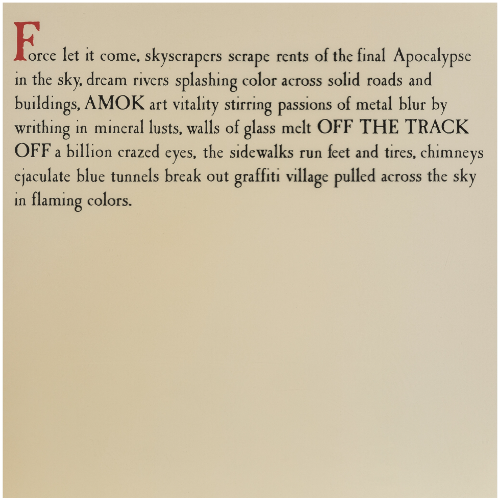 Force let it come, skyscrapers scrape rents of the final Apocalypse in the sky, dream rivers splashing color across solid roads and buildings, AMOK art vitality stirring passions of metal blur by writhing in mineral lusts, walls of glass melt OFF THE TRACK OFF a billion crazed eyes, the sidewalks run feet and tires, chimneys ejaculate blue tunnels break out graffiti village pulled across the sky in flaming colors.