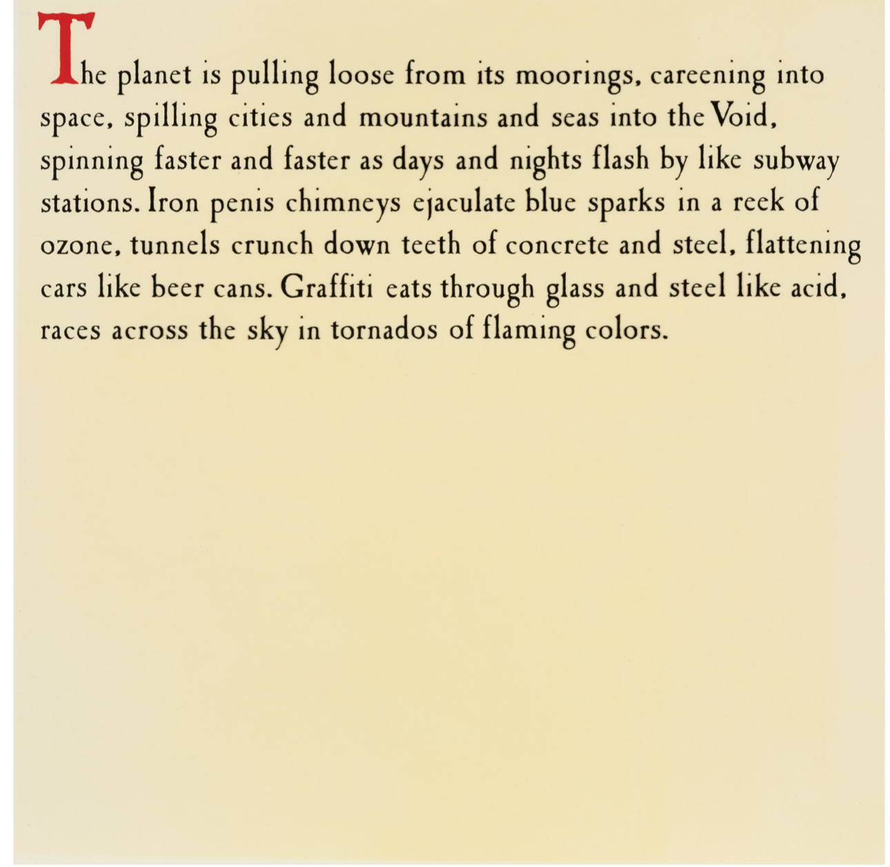 The planet is pulling loose from the moorings, careening into space, spilling cities and mountains and seas into the Void, spinning faster and faster as days and nights flash by like subway stations. Iron penis chimneys ejaculate blue sparks in a reek of ozone, tunnels crunch down teeth of concrete and steel, flattening cars like beer cans. Graffiti eats through glass and steel like acid, races across the sky in tornados of flaming colors.