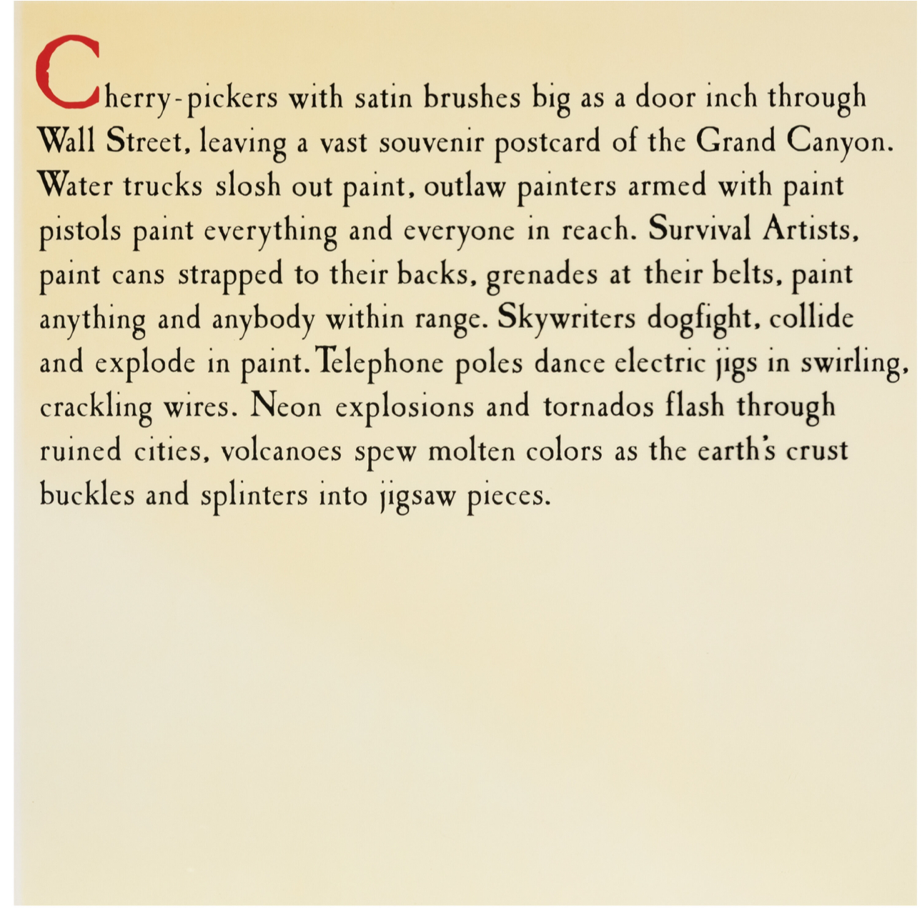 Cherry-pickers with satin brushes big as a door inch through Wall Street, leaving a vast souvenir postcard of the Grand Canyon. Water trucks slosh out paint, outlaw painters armed with paint pistols paint everything and everyone in reach. Survival Artists, paint cans strapped to their backs, grenades at their belts, paint anything and anybody within range. Skywriters dogfight, collide and explode in paint. Telephone poles dance electric jigs in swirling, crackling wires. Neon explosions and tornados flash through ruined cities, volcanoes spew molten colors as the earth’s crust buckles and splinters into jigsaw pieces.