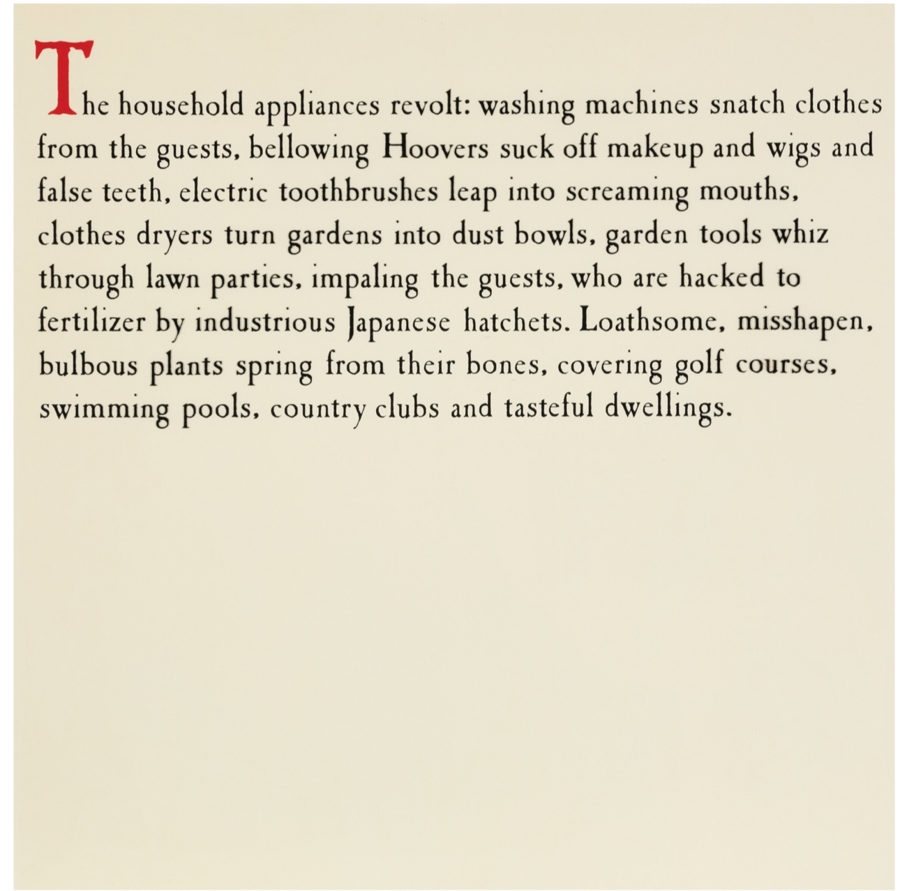 The household appliances revolt: washing machines snatch clothes from the guests, bellowing Hoovers suck off makeup and wigs and false teeth, electric toothbrushes leap into screaming mouths, clothes dryers turn gardens into dust bowls, garden tools whiz through lawn parties, impaling the guests, who are hacked to fertilizer by industrious Japanese hatchets. Loathsome, misshapen, bulbous plants spring from their bones, covering golf courses, swimming pools, country clubs and tasteful dwellings.