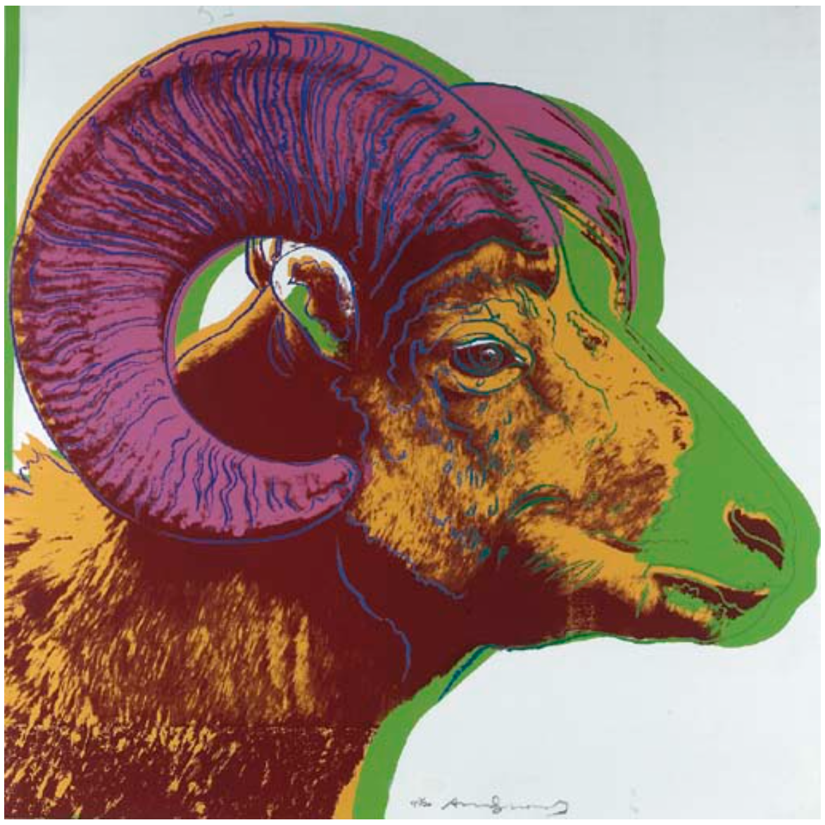 However, by 1900 the population had crashed to several thousand. Efforts established in 1930 by the Boy Scouts of America created two Bighorn game ranges in Arizona. Through an increased program of reintroductions, national parks, and reduced hunting, together with a decrease in domesticated sheep near the end of World War II, allowed the Bighorn sheep to make a further comeback. Though it is currently unknown if the population of Bighorn sheep has risen since Warhol’s creation, the animal continues to be an iconic image for many Native populations, and is know the official mascot for the Arizona Boy Scouts.
