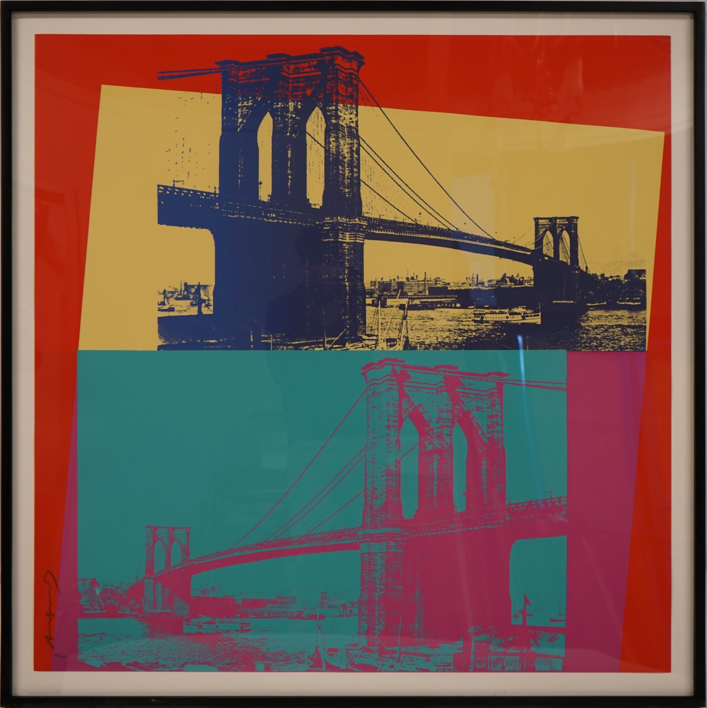 Warhol used an offset printing technique that is aesthetically different from many of his other works. The composition features two overlapping, mirrored images of the bridge, which creates a complex, almost surrealistic, 3D effect on a 2D medium. This juxtaposition makes the bridge appear to jet off into the distance, blurring the lines between reality and representation. Warhol’s characteristic use of bold, vibrant, and contrasting colors (such as yellow, navy, pink, and cyan on a red background in one variation) transforms a familiar architectural landmark into a distinctly Pop Art image. The image is based on a photograph from the permanent collection of the Museum of the City of New York.