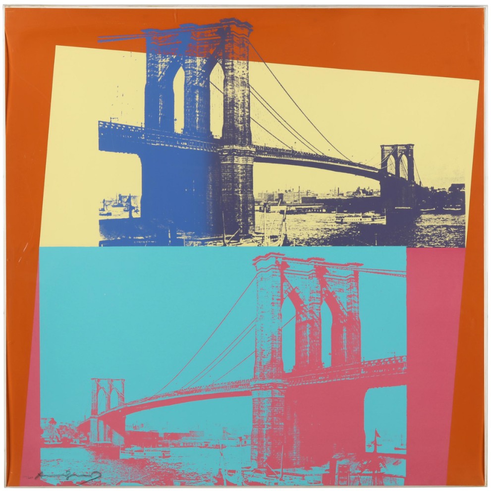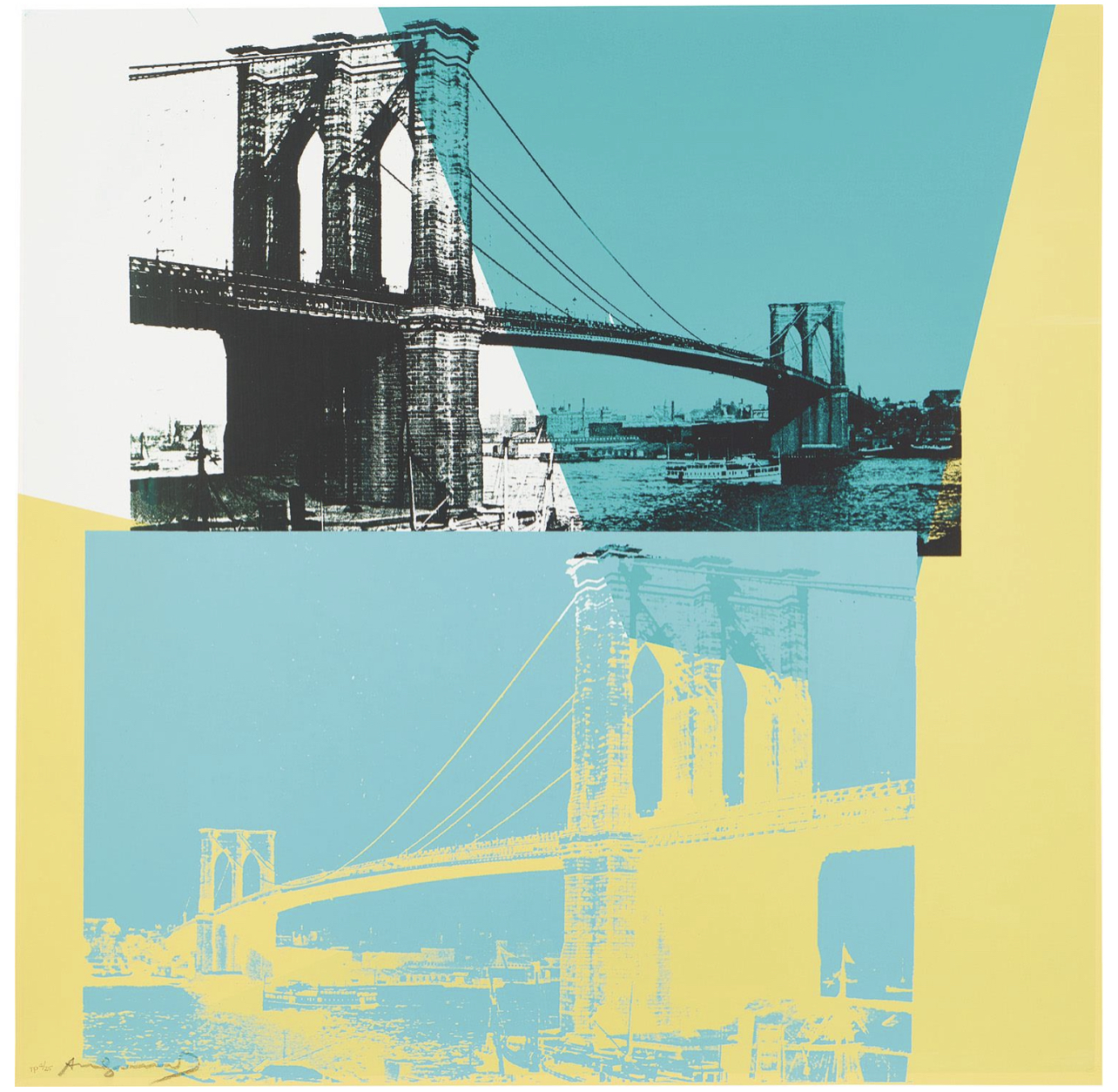 In the 1980’s, Andy Warhol went beyond contemporary pop culture and turned toward imagery rooted in the past, finding inspiration in a wide variety of subject matter, from old master paintings to famous longstanding structures like the Cologne Cathedral and the Brooklyn Bridge. King of the New York art scene, Warhol was an obvious choice for the city to approach to make a series of prints in honor of the 100th anniversary of the city’s beloved Brooklyn Bridge in 1983. Warhol found his source imagery for the edition in the archives of Museum of the City of New York, choosing a photo that highlighted the rich history of the city and brought another New York institution into the conversation of such a monumental event.