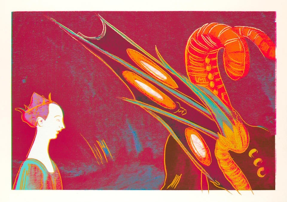 The story of Saint George and the Dragon belongs to a popular collection of saint’s lives written by Jacopo de Vorgine in the 13th century, titled The Golden Legend. The original masterpiece by Uccello features two episodes from the story of Saint George: his defeat of the plague-bearing dragon that had been terrorizing the city, and the rescued princess bringing the dragon to heel using the belt from her dress as a leash. Warhol crops Uccello’s mythical scene down to the princess’s simple yet stoic profile and the dragon’s all-encompassing spotted wing at a drastically enlarged scale, essentially elevating a fraction of this art historical masterpiece into a Pop art model. The subtle and darker palette of Uccello’s original painting is replaced by a cacophony of striking fluorescent colors and asymmetrical linework which delightfully guide the eye and disguise the origins of the source image.