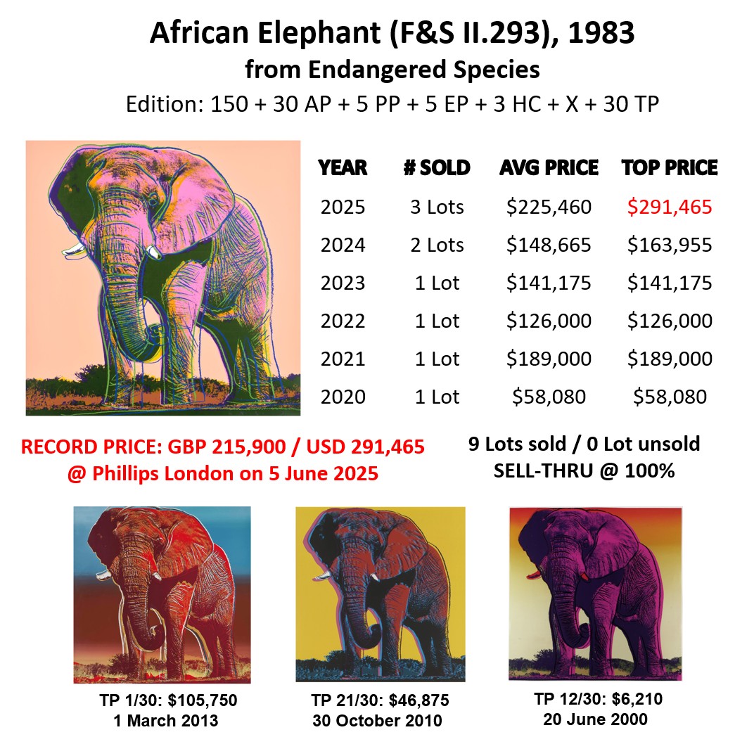 The highest price was achieved by African Elephant that sold at Phillips in London, on 5 June 2025 for GBP 215,900 (USD 291,465), setting a new auction record for this print. In fact African Elephant sold 3 times at auction in 2025, at an average price of USD 225,458.