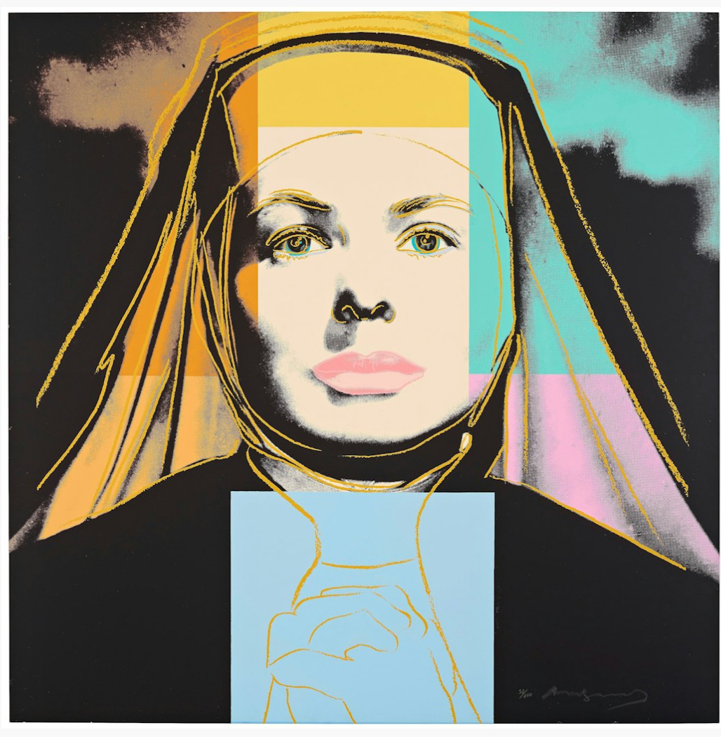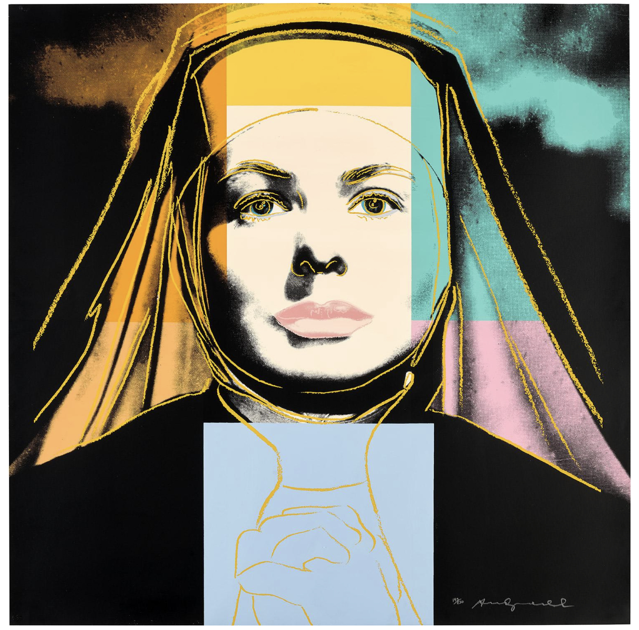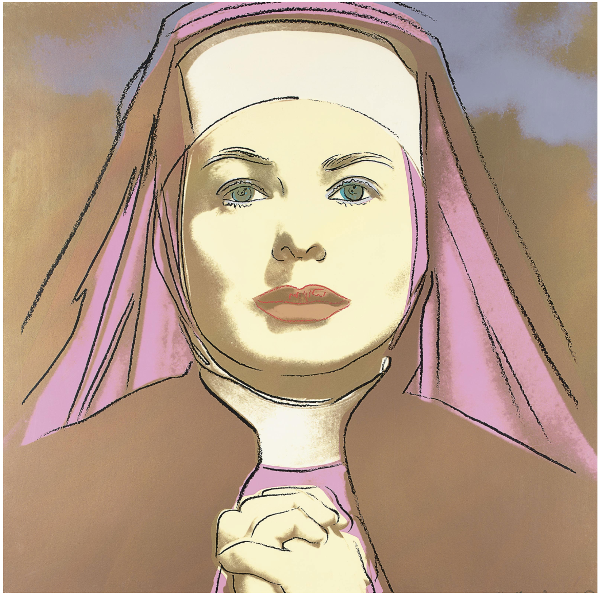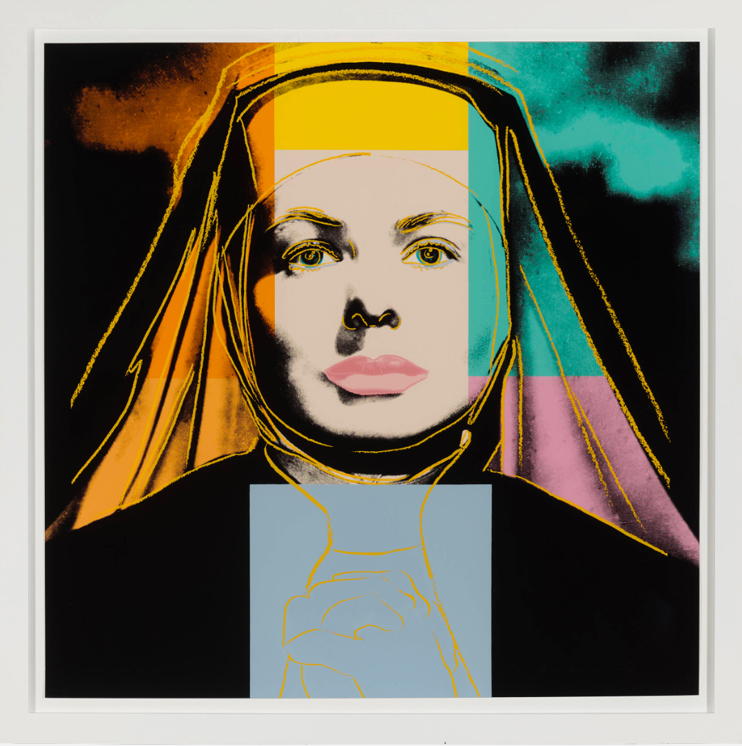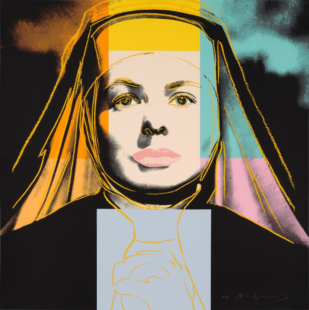 As well as adding his characteristic blocks of bright color Warhol picks out certain features with elegant colored lines that are reminiscent of his early career as a fashion illustrator. This is put to most striking effect in The Nun which sees Bergman’s famous features looking out at the viewer from behind the tight contours of a traditional nun’s wimple that only serves to make her seem more striking, if not a little distant. As well as the wimple, her face is also framed by blocks of bright color that conspicuously divert from the seriousness of her face and costume. Her lips are given a soft pink hue, not at all in keeping with her habit, while the menacing sky behind her is transformed by shades of orange and turquoise.