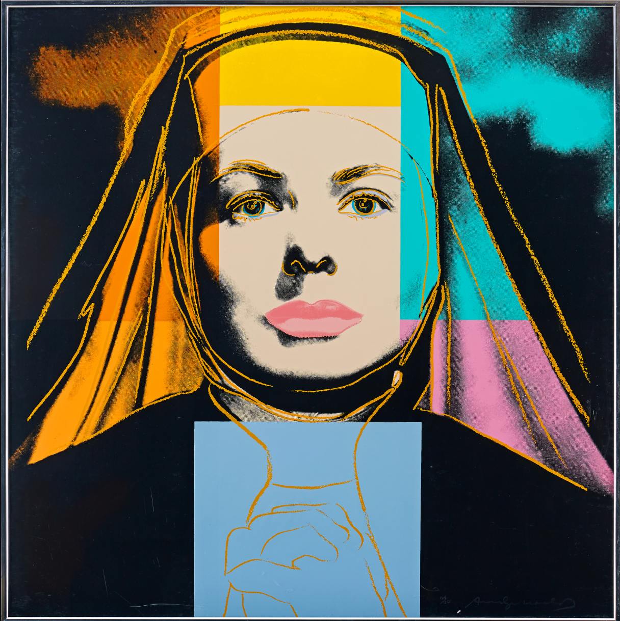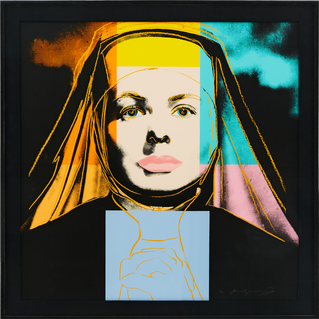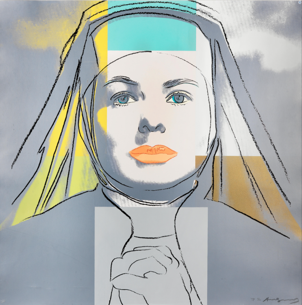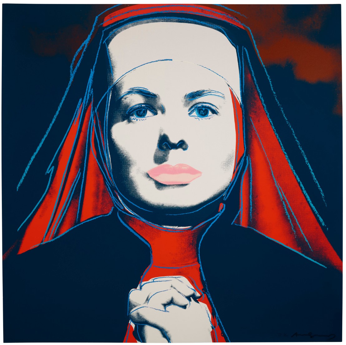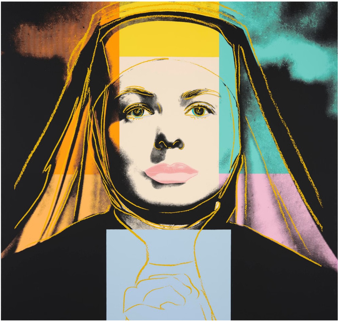 As well as adding his characteristic blocks of bright color Warhol picks out certain features with elegant colored lines that are reminiscent of his early career as a fashion illustrator. This is put to most striking effect in The Nun which sees Bergman’s famous features looking out at the viewer from behind the tight contours of a traditional nun’s wimple that only serves to make her seem more striking, if not a little distant. As well as the wimple, her face is also framed by blocks of bright color that conspicuously divert from the seriousness of her face and costume. Her lips are given a soft pink hue, not at all in keeping with her habit, while the menacing sky behind her is transformed by shades of orange and turquoise.