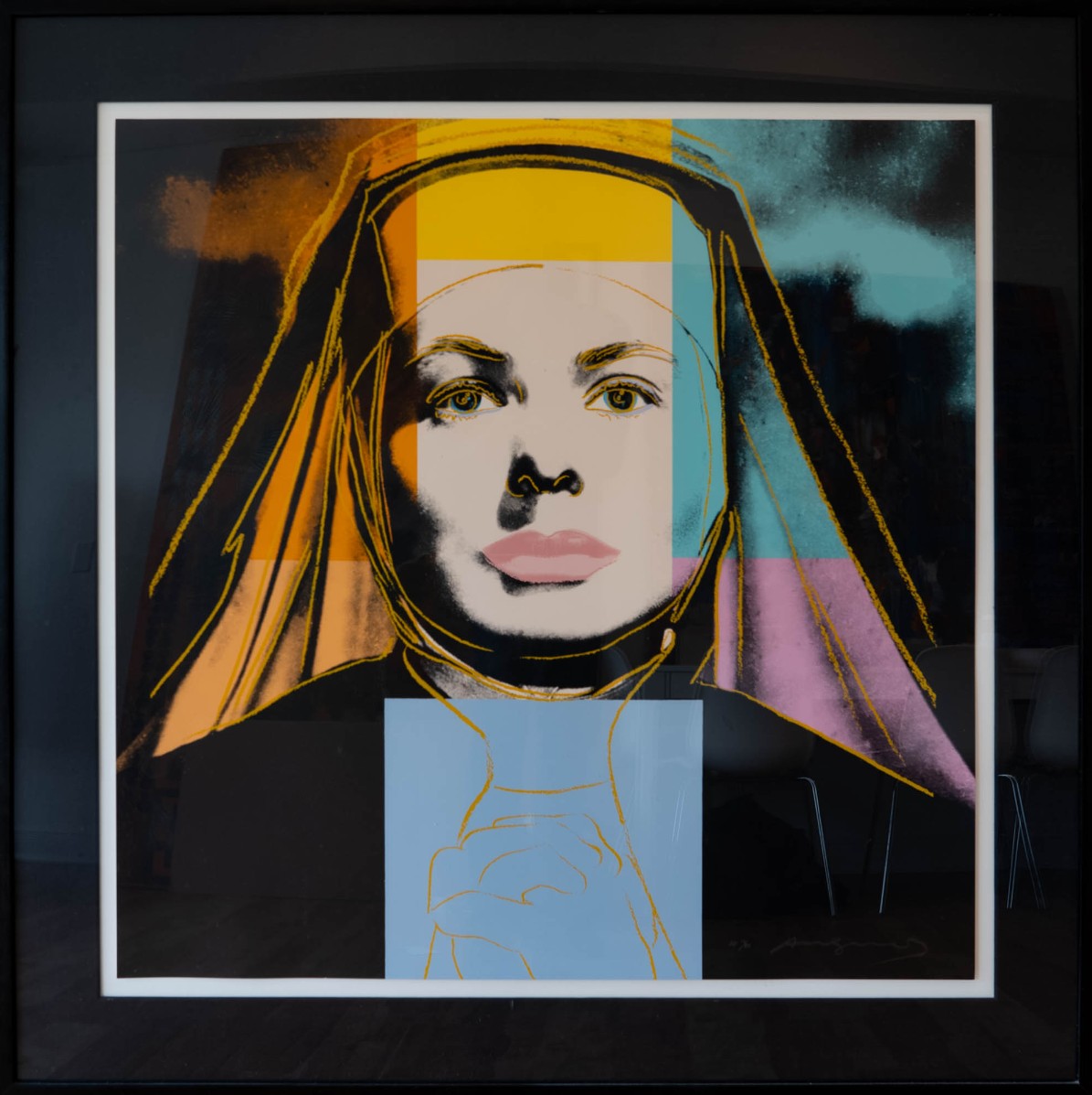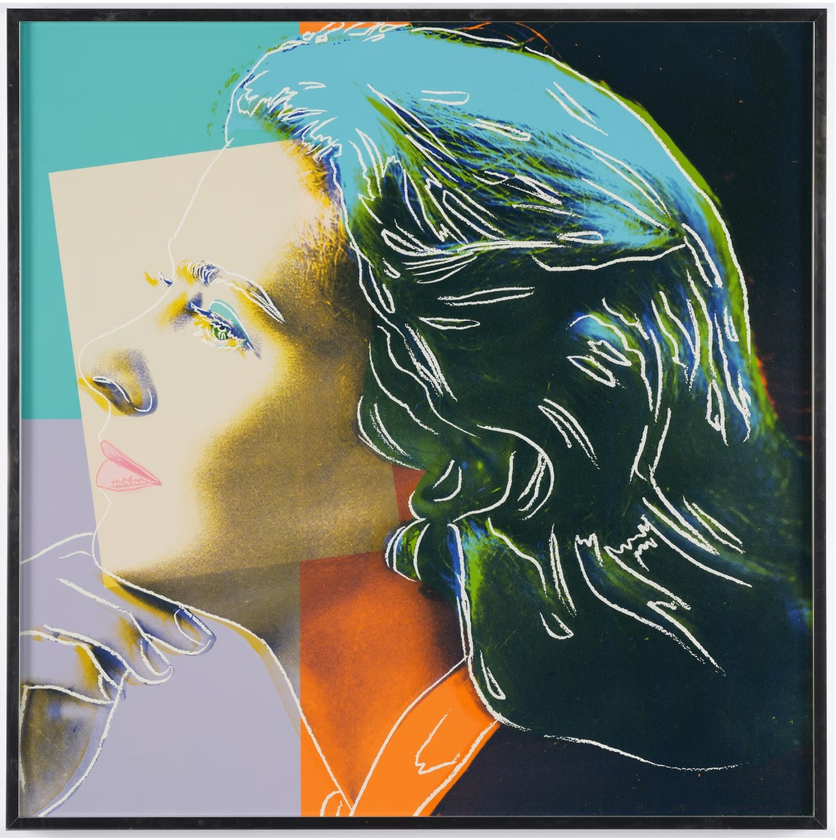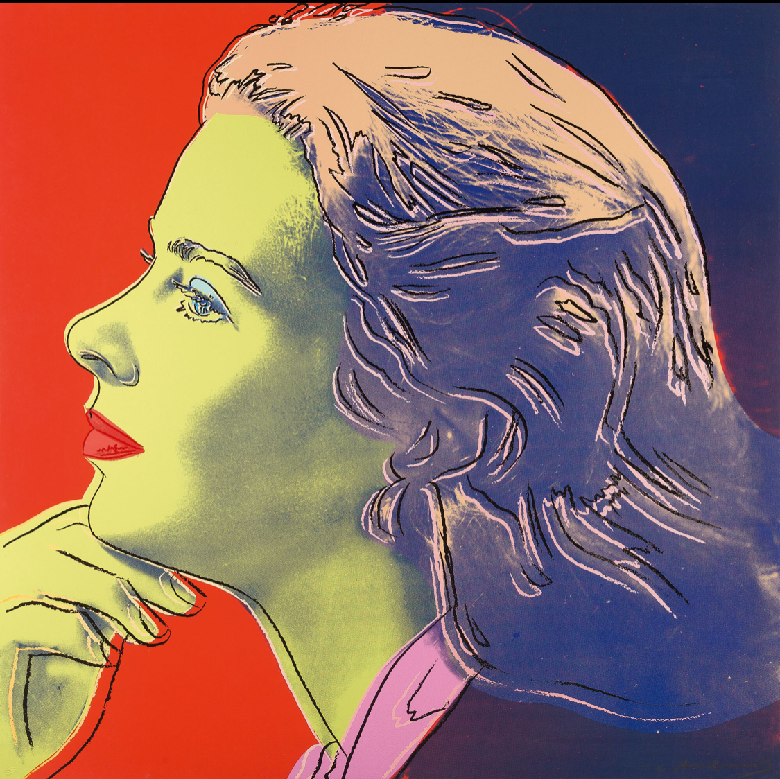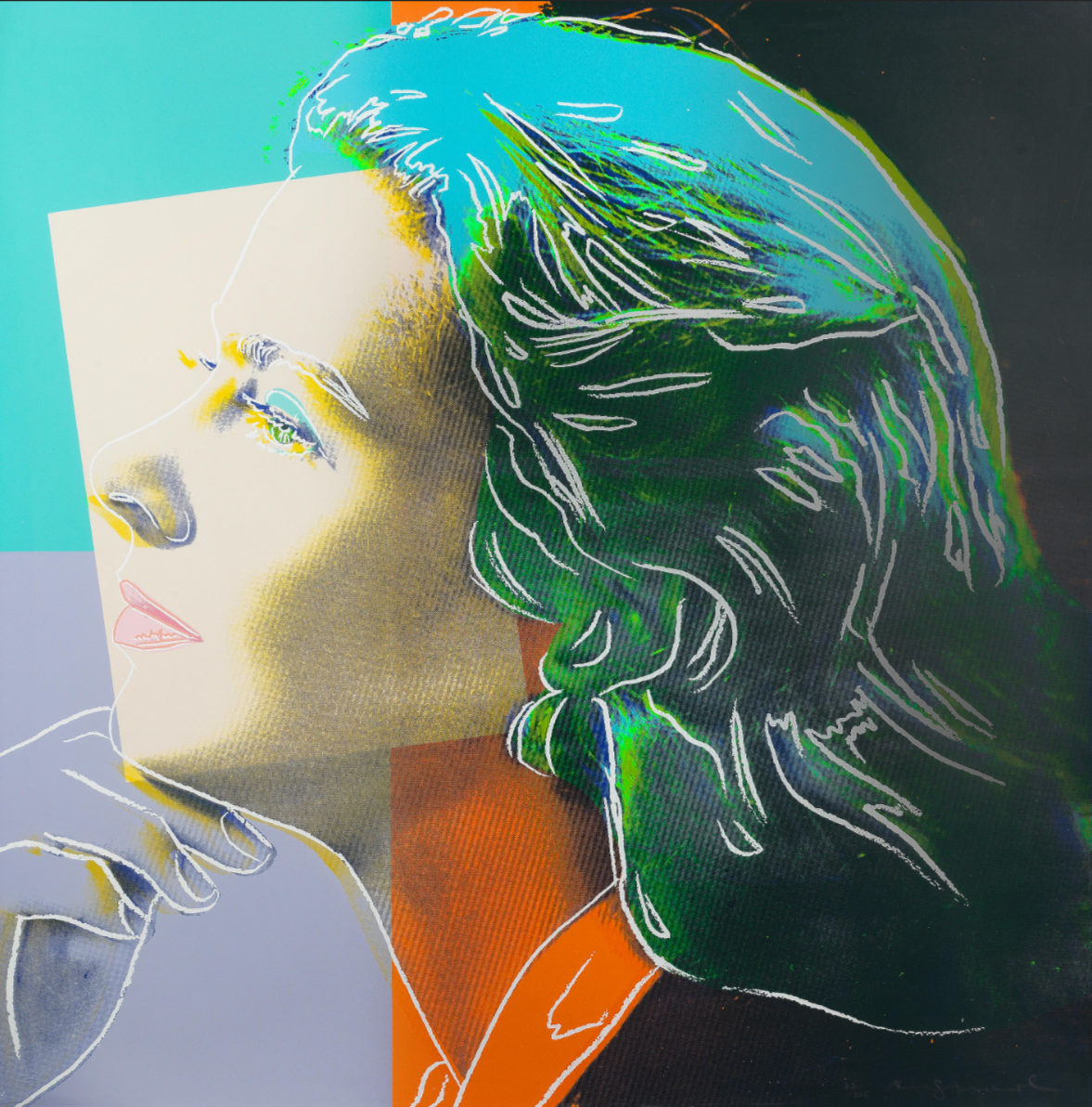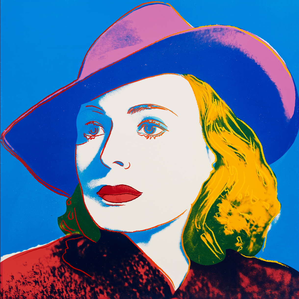 As well as adding his characteristic blocks of bright color Warhol picks out certain features with elegant colored lines that are reminiscent of his early career as a fashion illustrator. This is put to most striking effect in The Nun which sees Bergman’s famous features looking out at the viewer from behind the tight contours of a traditional nun’s wimple that only serves to make her seem more striking, if not a little distant. As well as the wimple, her face is also framed by blocks of bright color that conspicuously divert from the seriousness of her face and costume. Her lips are given a soft pink hue, not at all in keeping with her habit, while the menacing sky behind her is transformed by shades of orange and turquoise.