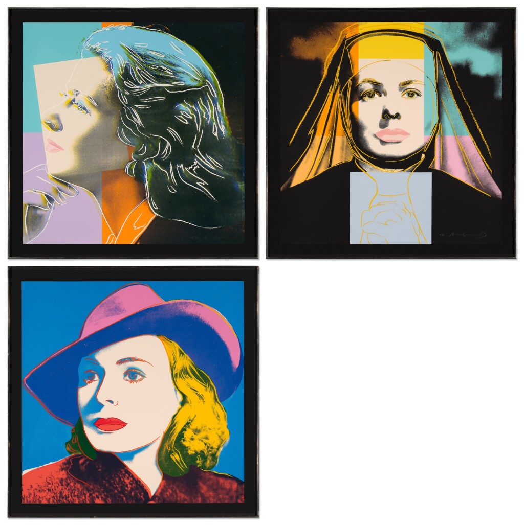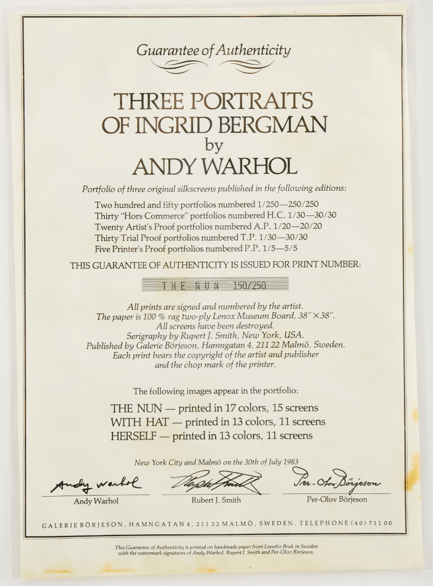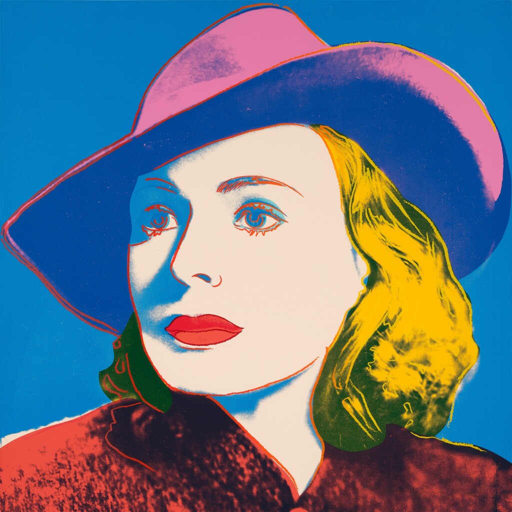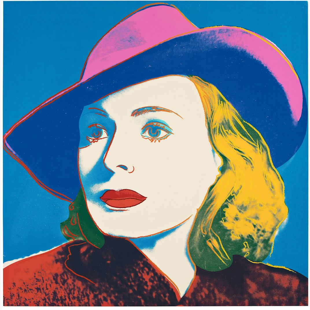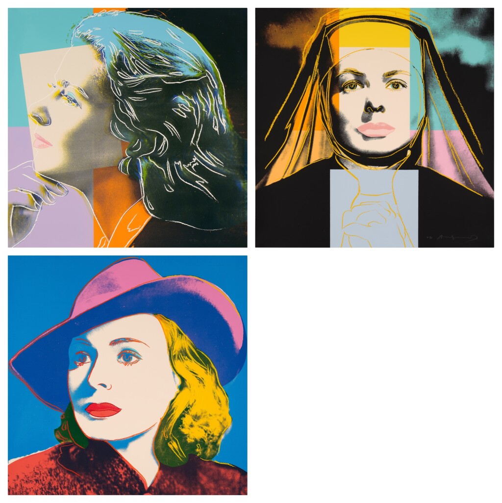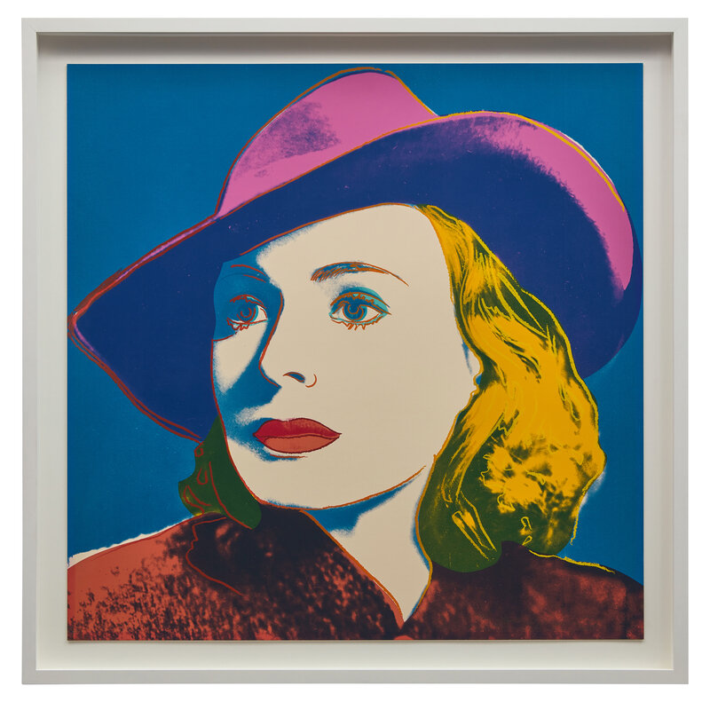 Andy Warhol created a series of three prints dedicated to Ingrid Bergman at the request of Galerie Börjeson, a Swedish gallery who later published the suite. The series, produced towards the end of Warhol’s life, showcases the artist’s enduring fascination with celebrity and the way in which fame could elevate a mere mortal to the status of goddess.