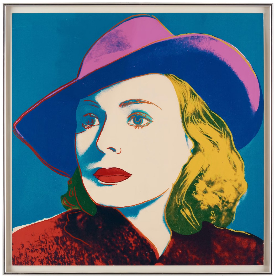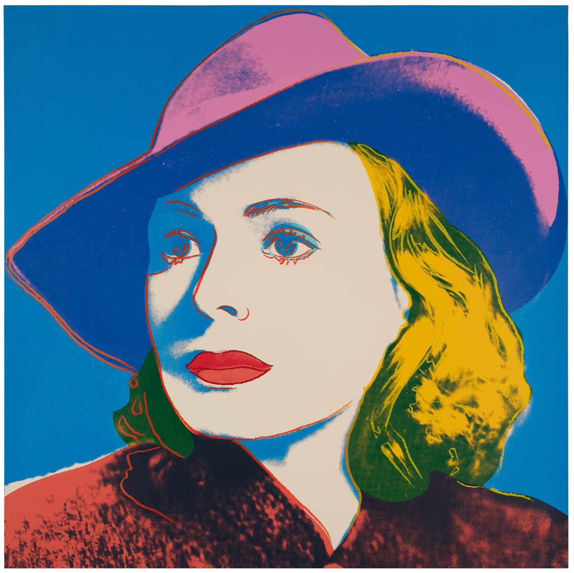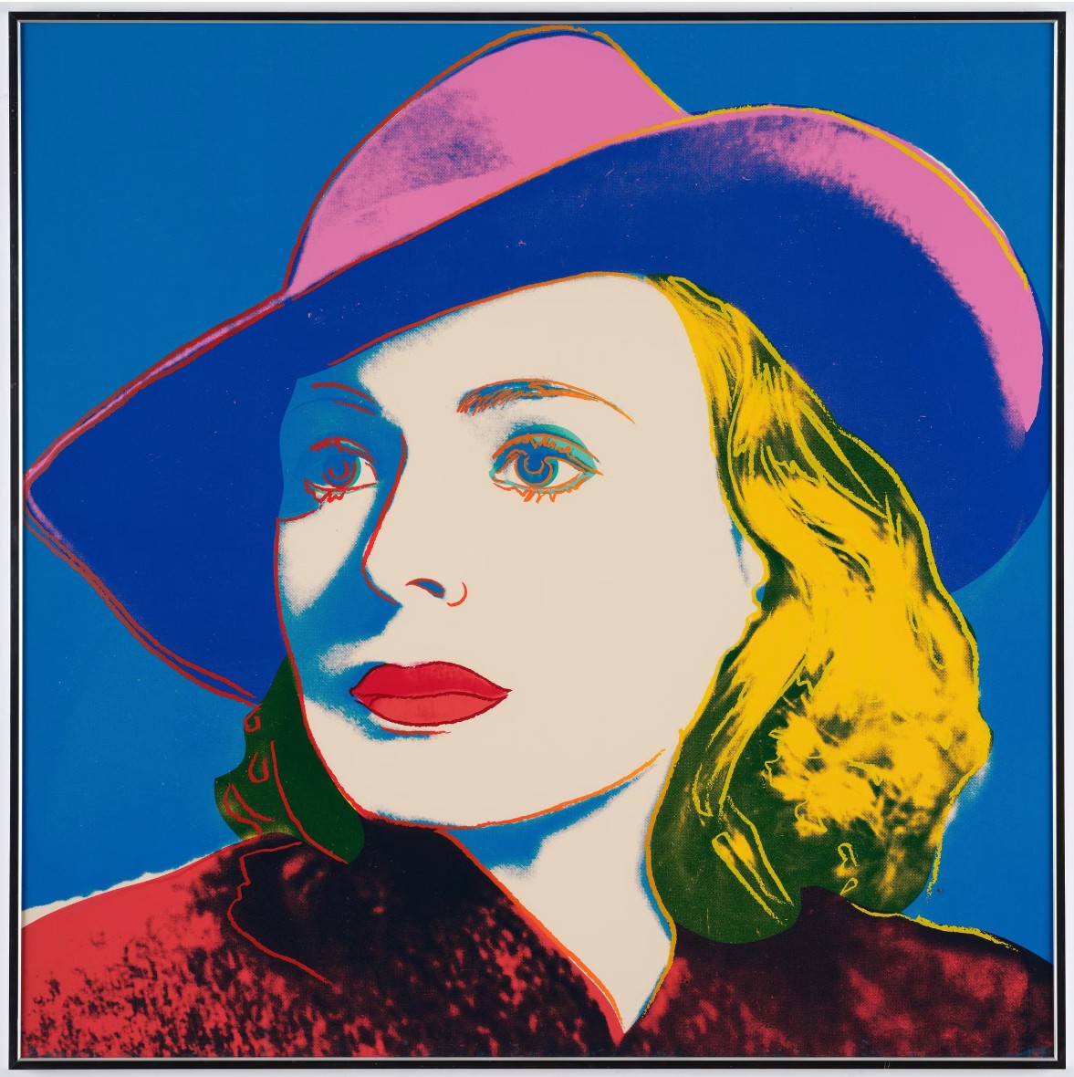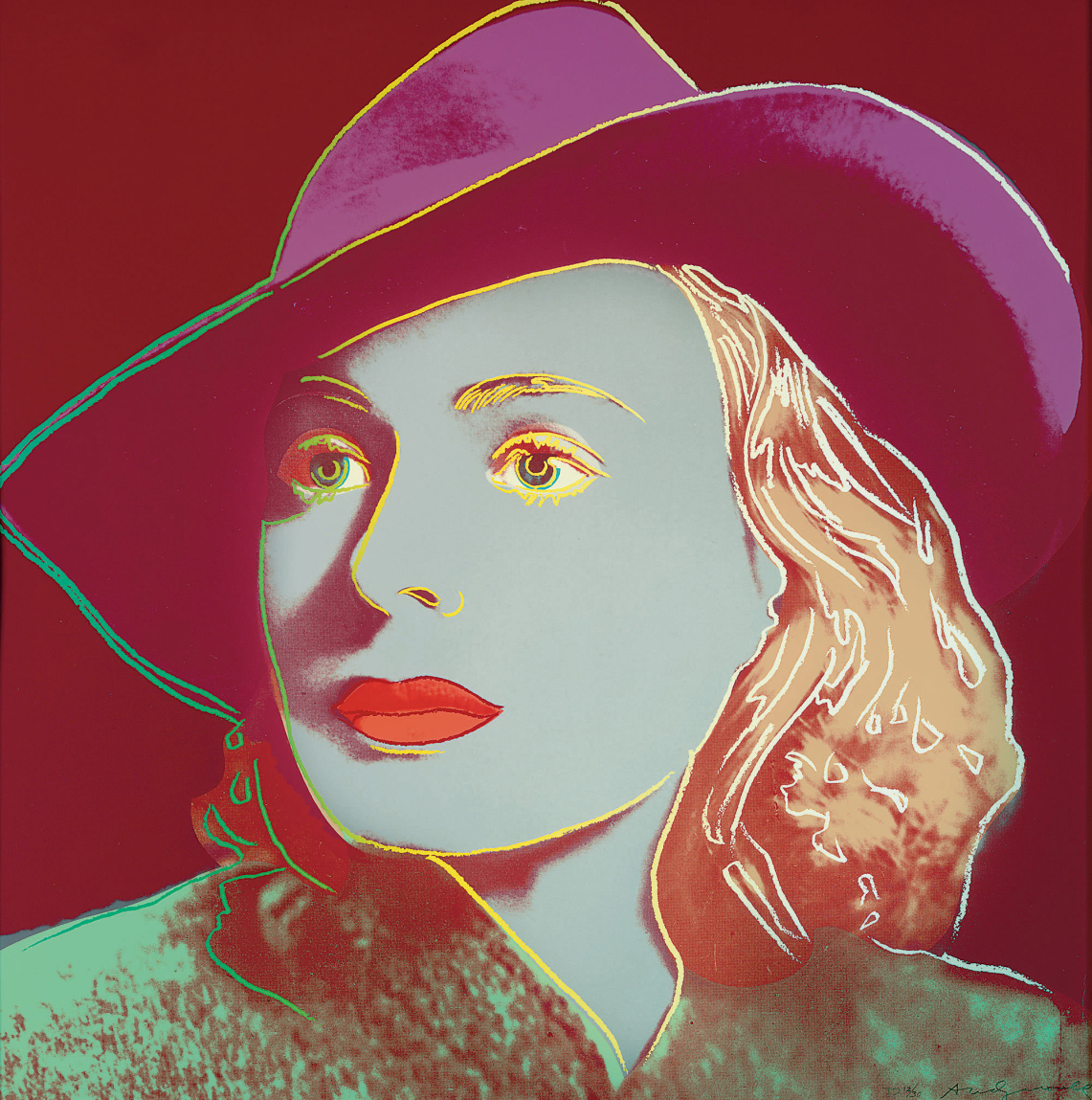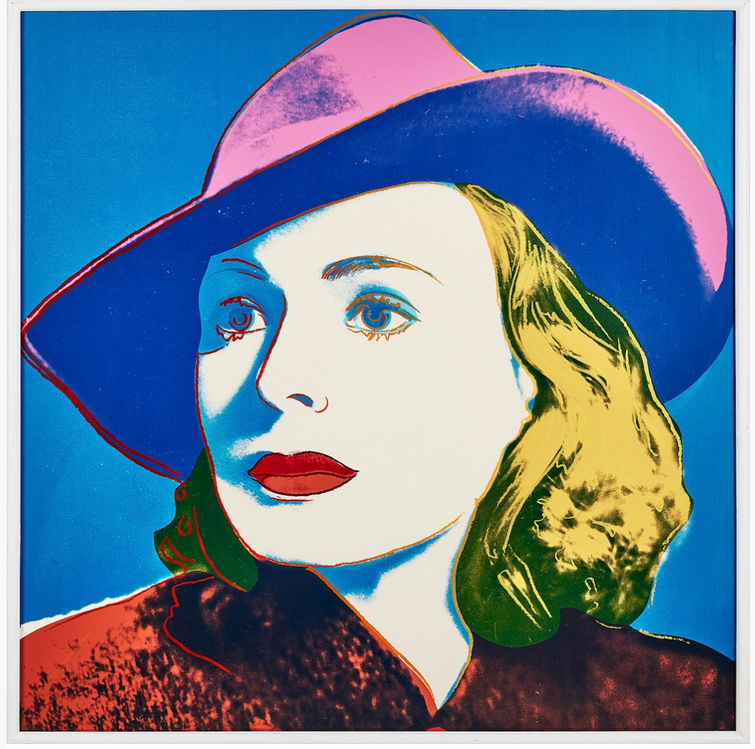 Andy Warhol created a series of three prints dedicated to Ingrid Bergman at the request of Galerie Börjeson, a Swedish gallery who later published the suite. The series, produced towards the end of Warhol’s life, showcases the artist’s enduring fascination with celebrity and the way in which fame could elevate a mere mortal to the status of goddess.