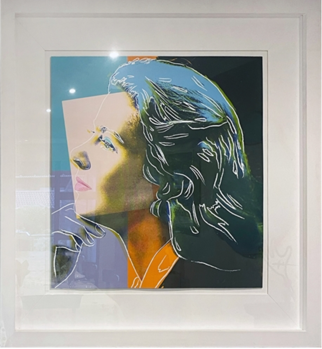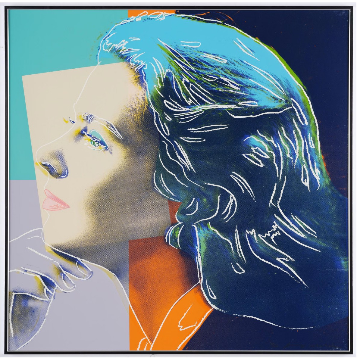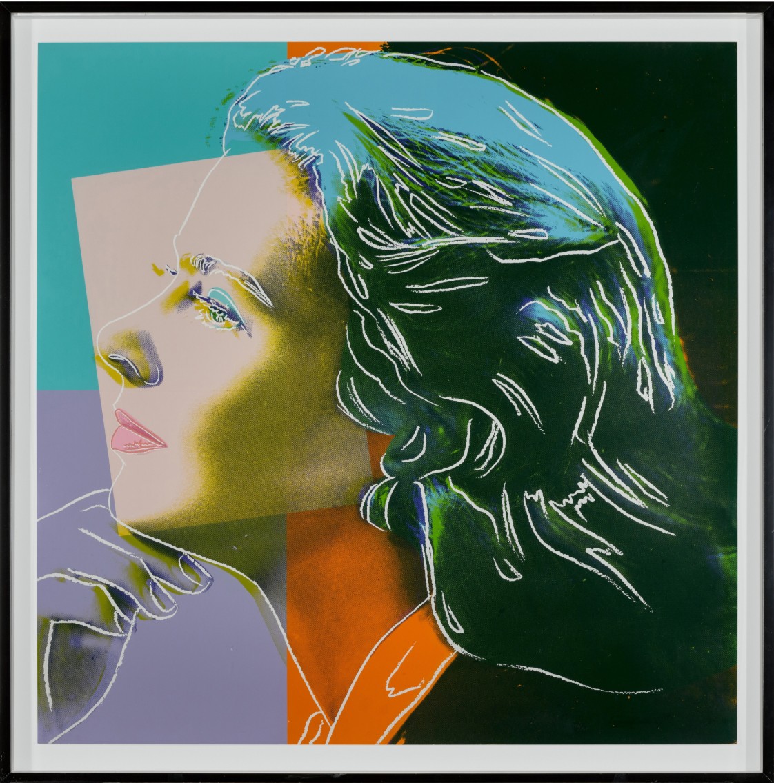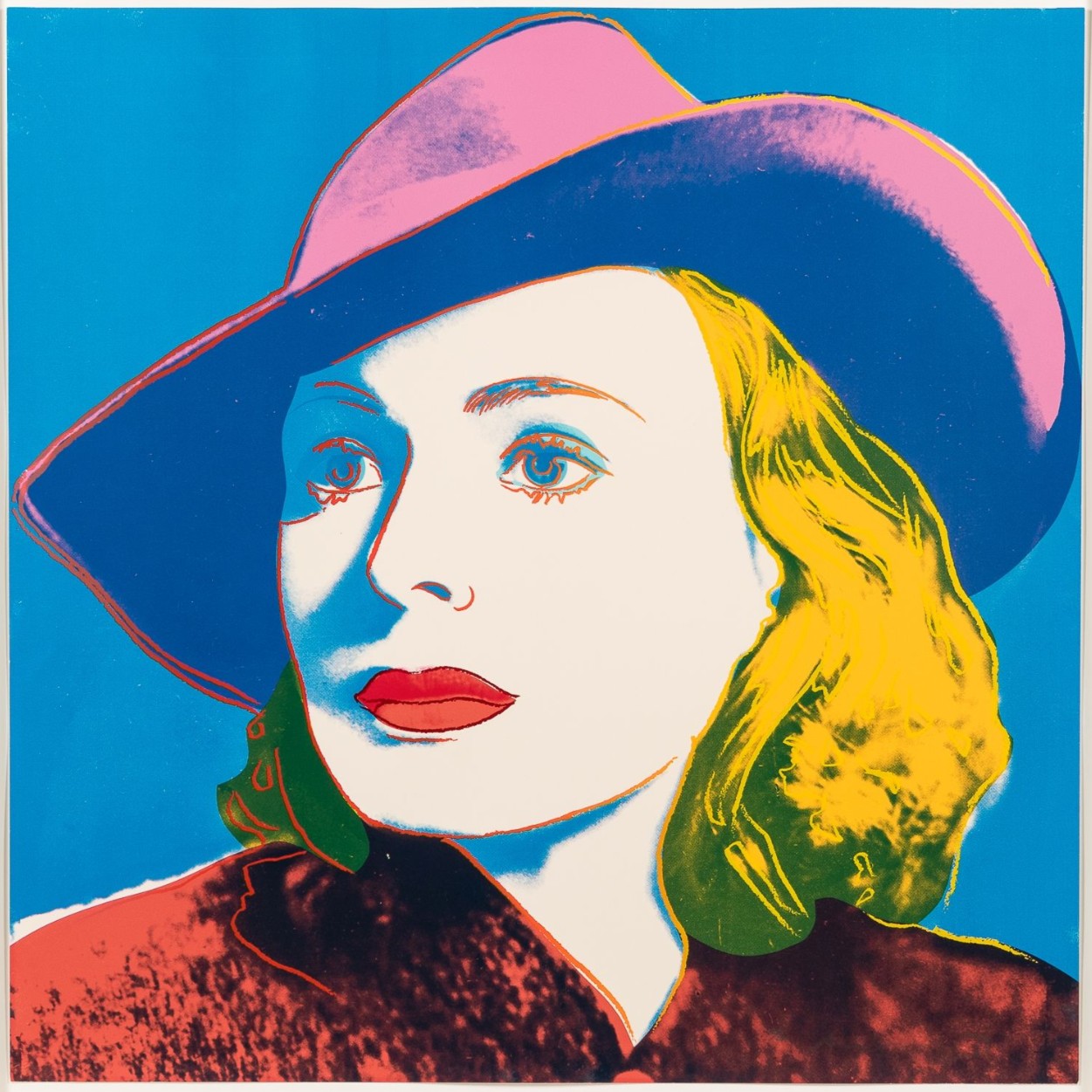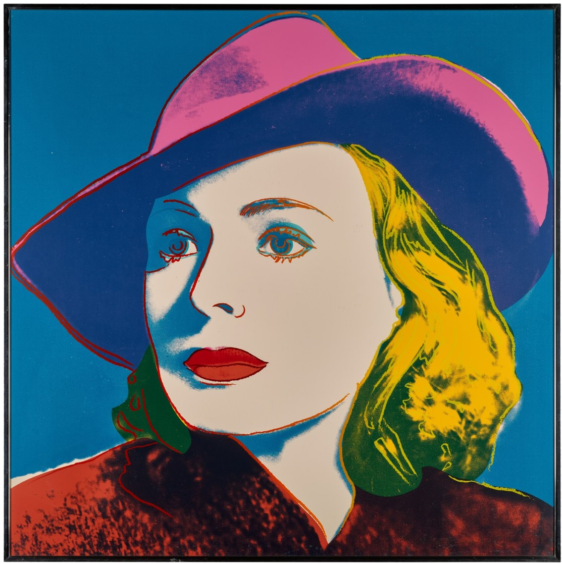 Andy Warhol created a series of three prints dedicated to Ingrid Bergman at the request of Galerie Börjeson, a Swedish gallery who later published the suite. The series, produced towards the end of Warhol’s life, showcases the artist’s enduring fascination with celebrity and the way in which fame could elevate a mere mortal to the status of goddess.