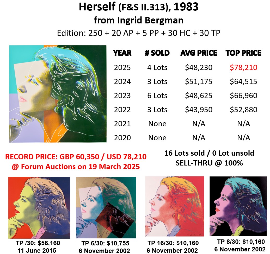 Herself sold 4 times at auction in 2025, at an average price of USD 48,230. It sold at Forum Auctions in London, on 19 March 2025 for GBP 60,350 (USD 78,210), setting a new auction record for this print.