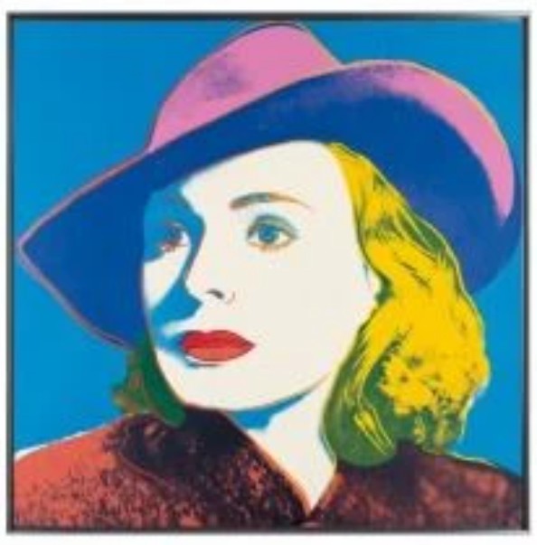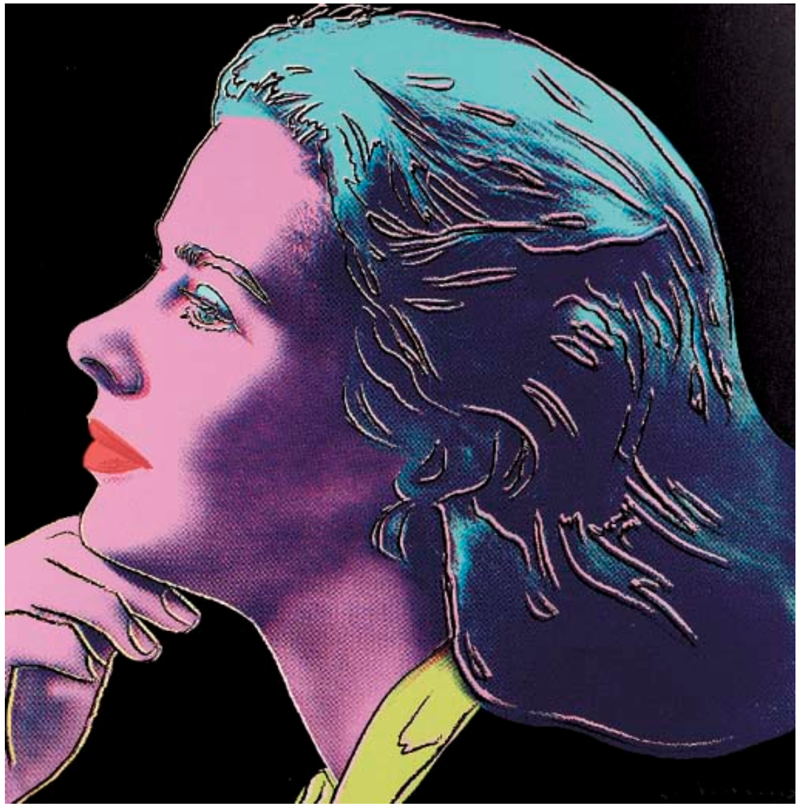 In With Hat, the actress is turned away from the viewer in a show of disdain as the bright colors contrast harshly to keep the viewer at arm’s length from this unattainable beauty. Herself, however, offers a softer touch. Bergman’s face, though still tilted upwards and away from the viewer, is now lost in thought. Her eyes are softened and Warhol’s complementary colors overlay, suggesting a serenity that is harder to find in the other two images.