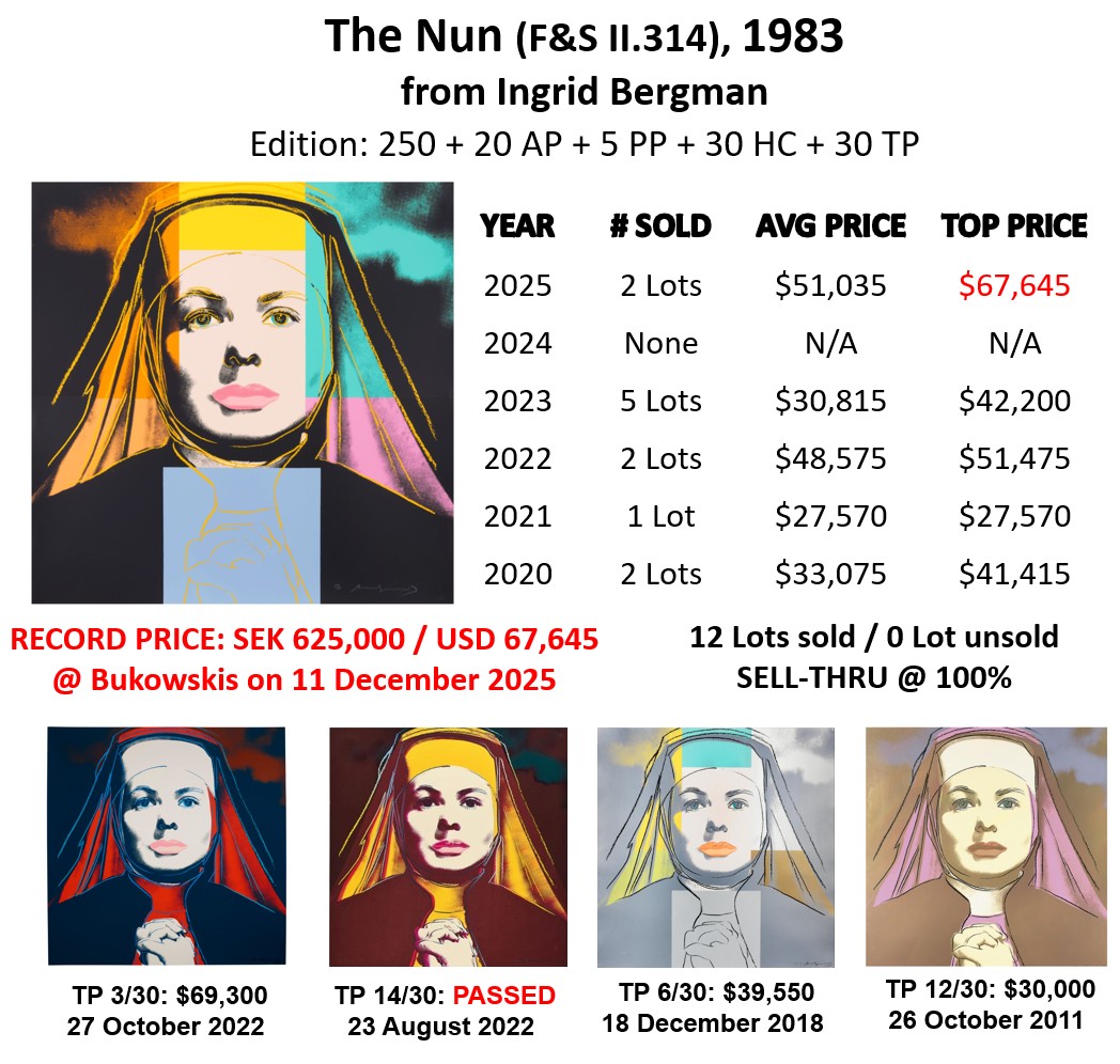 The Nun sold twice at auction in 2025, at an average price of USD 51,035. It sold at Bukowskis in Stockholm, on 11 December 2025 for SEK 625,000 (USD 67,645), setting a new auction record for this print.