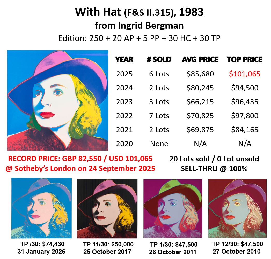 With Hat sold 6 times at auction in 2025, at an average price of USD 85,680. It sold at Sotheby’s in London, on 24 September 2025 for GBP 82,550 (USD 101,065), setting a new auction record for this print.