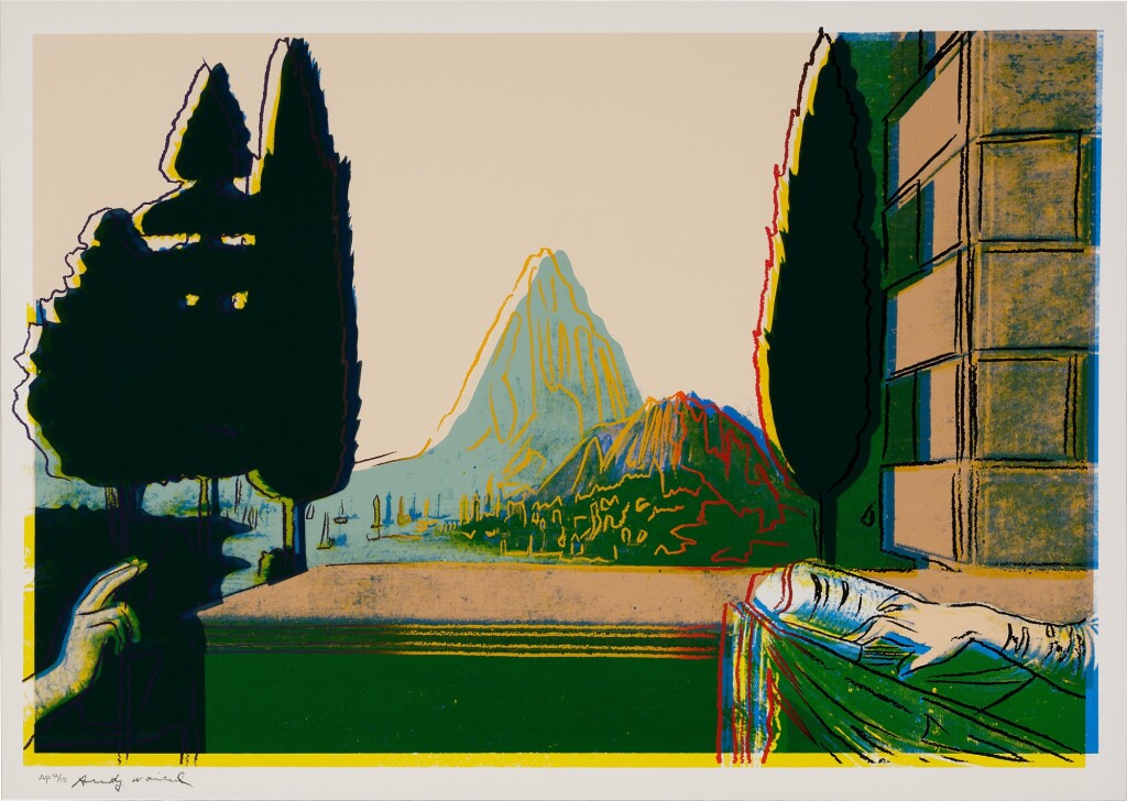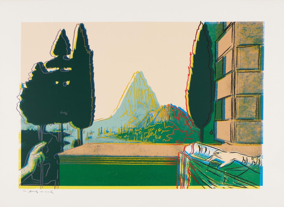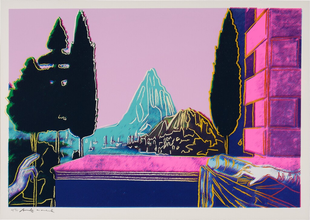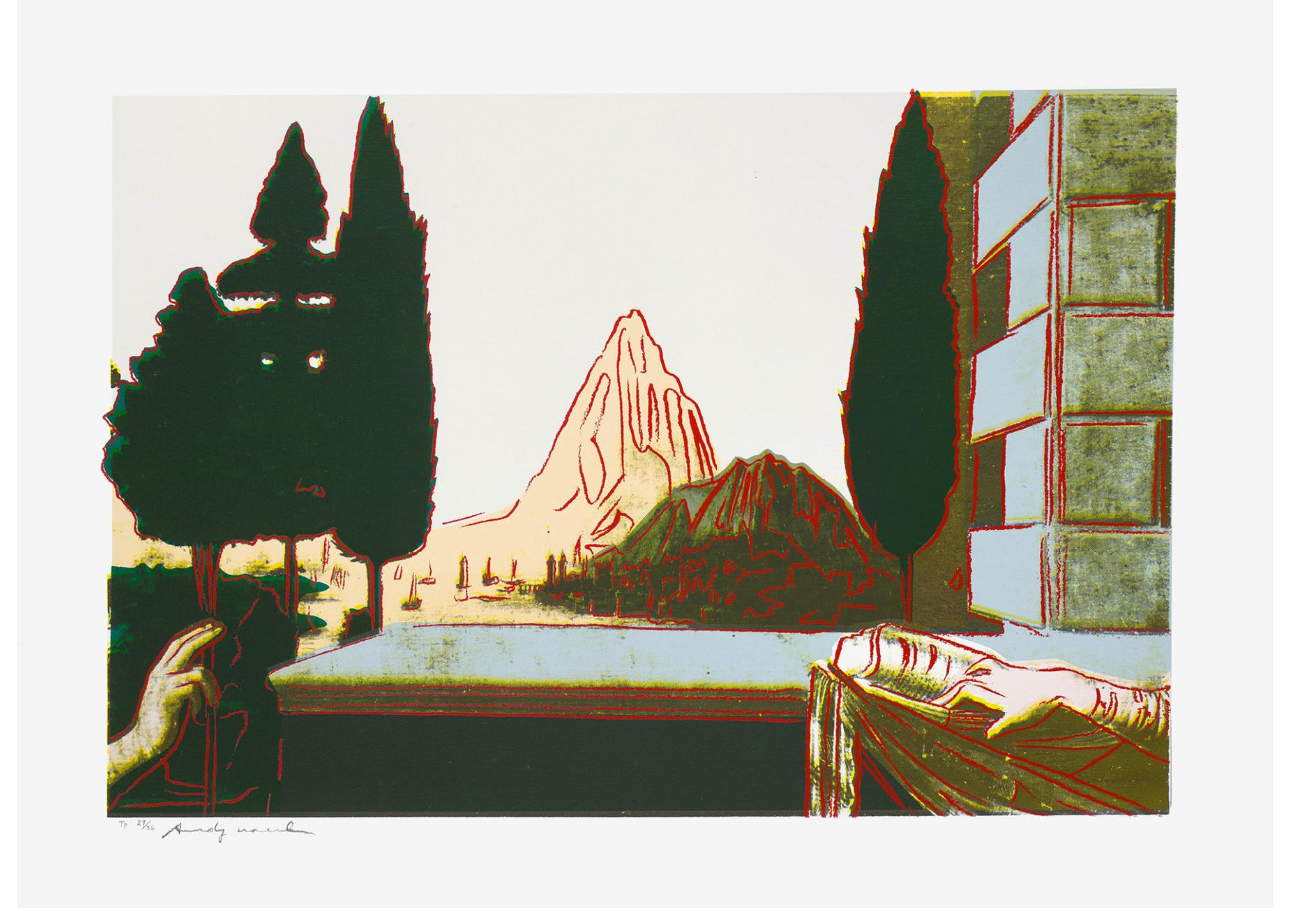 Warhol flattens the composition drastically: the mountain that once served as the central vanishing point in da Vinci’s pioneering example of perspective, is brought to the fore and highlighted with the same democratizing red line that Warhol uses to silhouette the hands of Mary and angel Gabriel. Through the central positioning of the mountain, the landscape in the background becomes of equal, if not higher, importance than the Biblical encounter. By directly appropriating da Vinci’s imagery, Warhol challenges the concept of originality and satirically undermines the work’s religious significance. Through his reproduction, flattening and cropping of the famous painting, Warhol demonstrates that not even the works of the Old Masters are protected from the commercial aesthetic of Pop art.