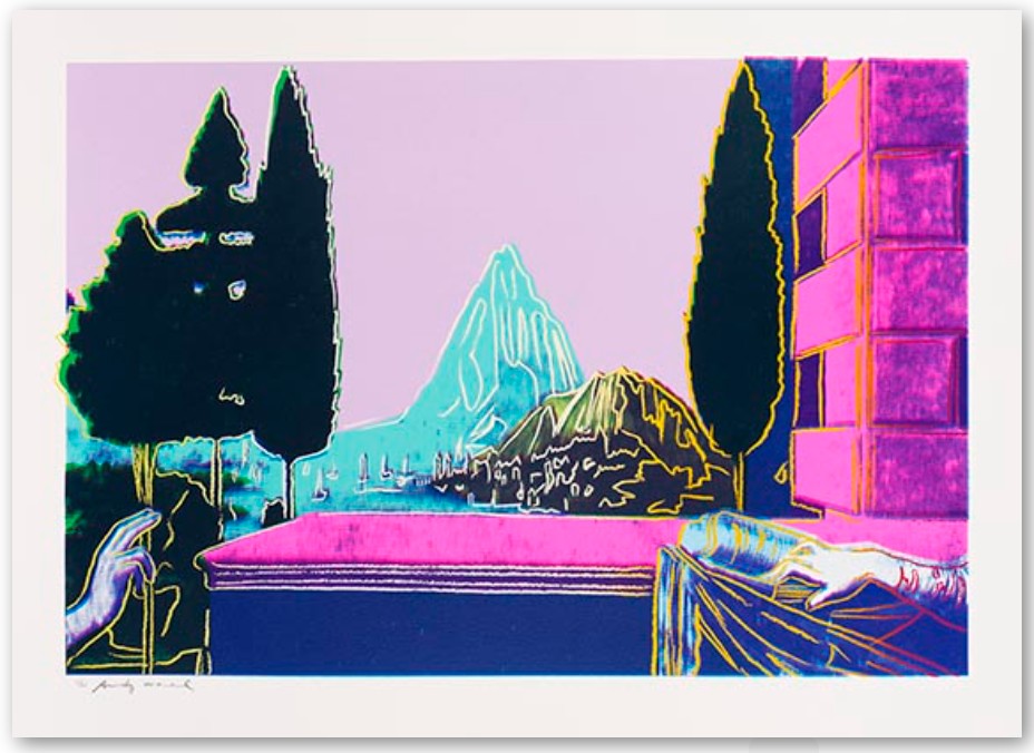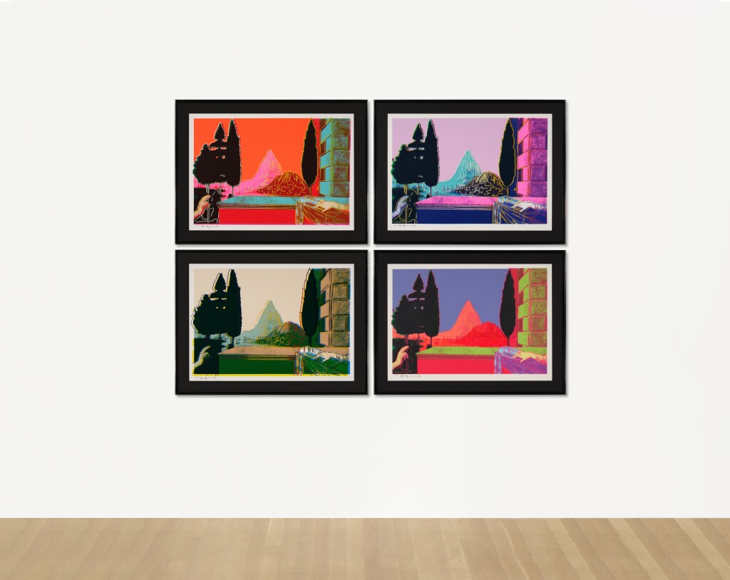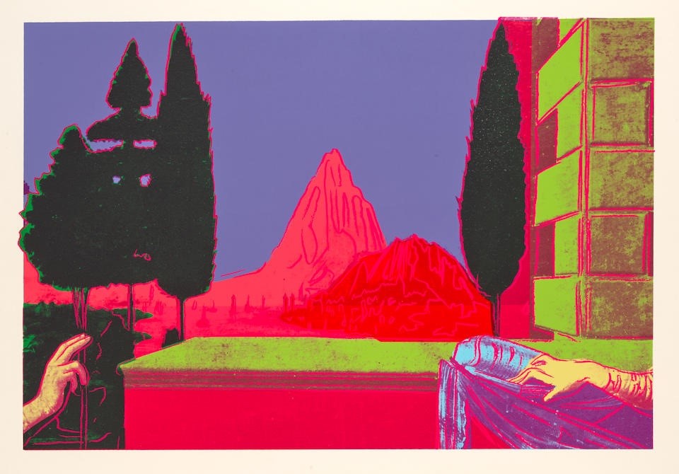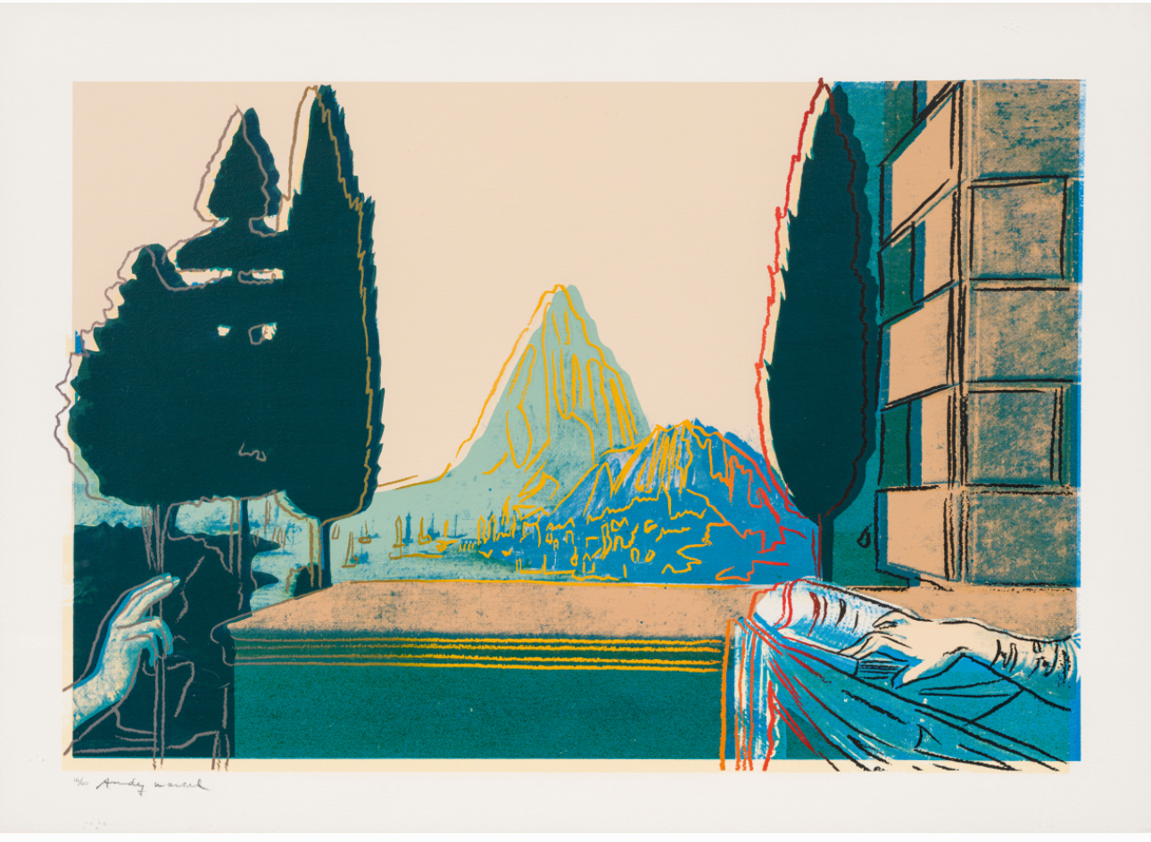 Warhol flattens the composition drastically: the mountain that once served as the central vanishing point in da Vinci’s pioneering example of perspective, is brought to the fore and highlighted with the same democratizing red line that Warhol uses to silhouette the hands of Mary and angel Gabriel. Through the central positioning of the mountain, the landscape in the background becomes of equal, if not higher, importance than the Biblical encounter. By directly appropriating da Vinci’s imagery, Warhol challenges the concept of originality and satirically undermines the work’s religious significance. Through his reproduction, flattening and cropping of the famous painting, Warhol demonstrates that not even the works of the Old Masters are protected from the commercial aesthetic of Pop art.