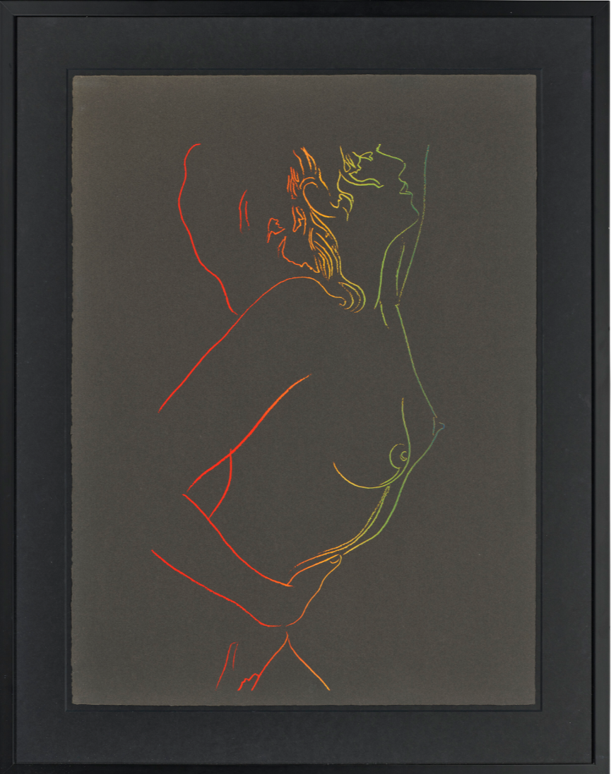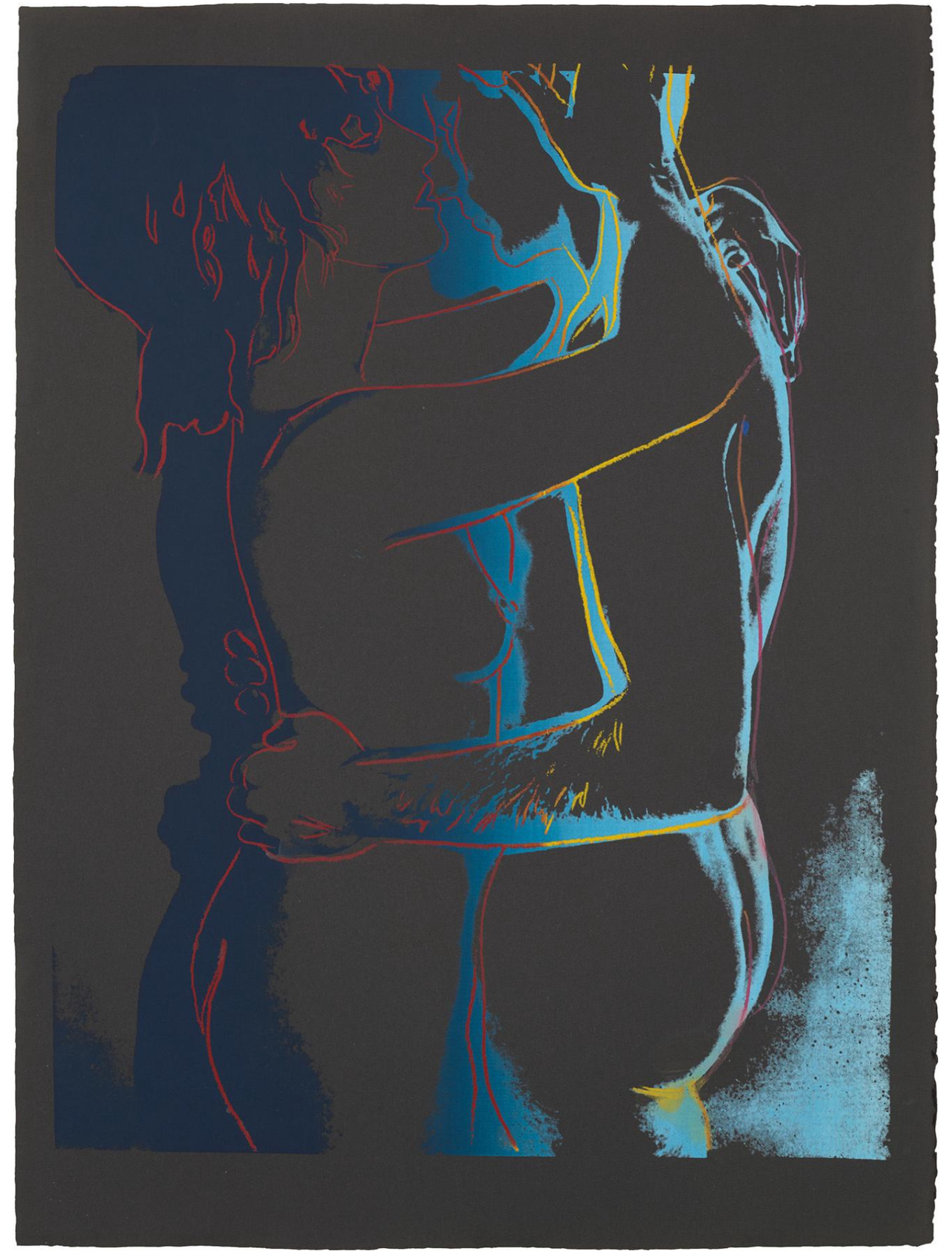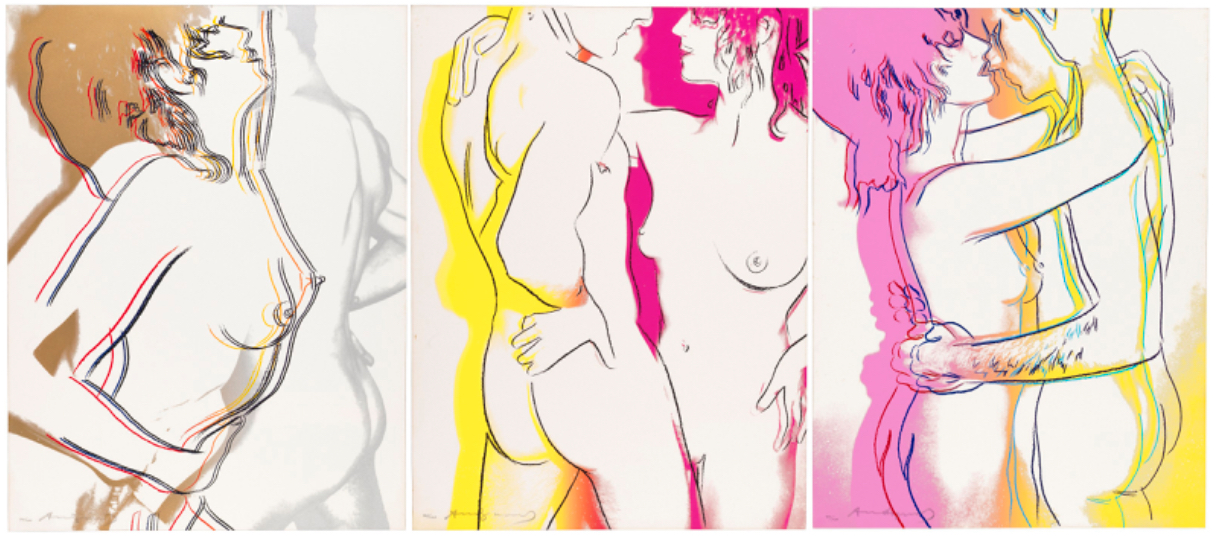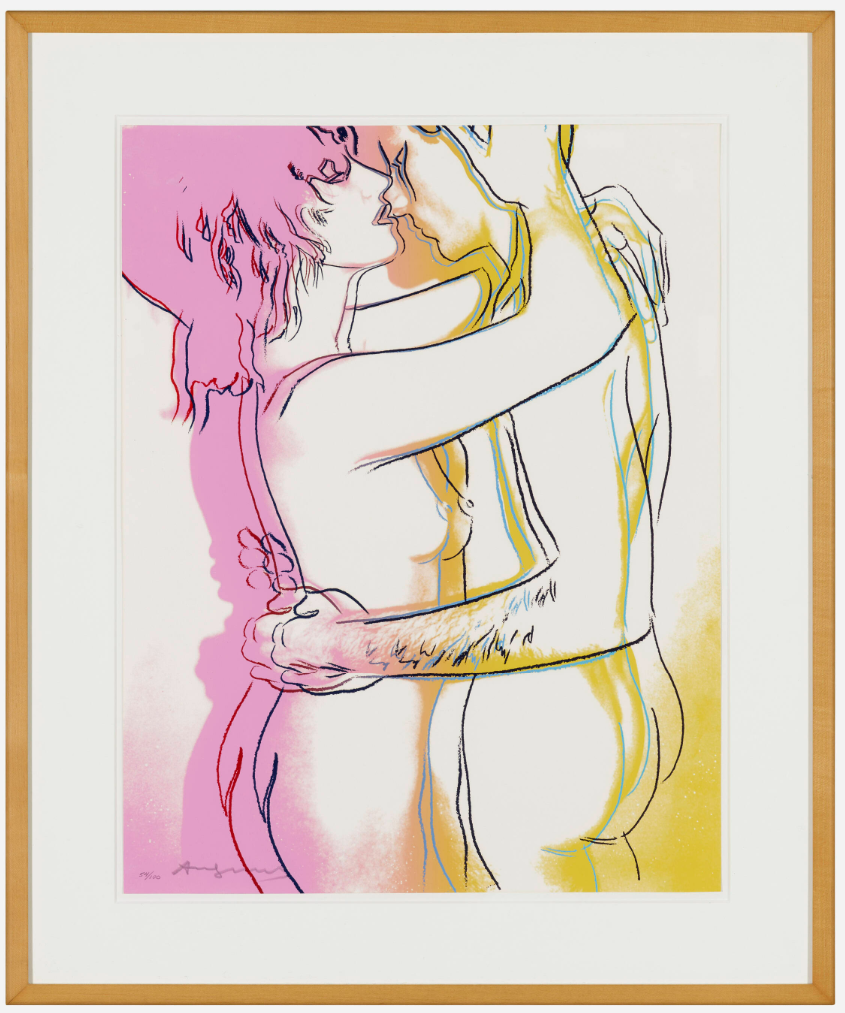The series consists of a portfolio of three screenprints, each depicting a nude couple in different stages of an intimate embrace. The couple’s embrace is enhanced by a colorful aura that surrounds their bodies, suggesting attraction and a fantasy-like quality. The colors bleed and mingle at the bottom of the composition, symbolizing the couple’s union. The compositions use broad areas of white space and gestural graphic lines to emphasize the tenderness of the interaction, a style that recalls Warhol’s early career as a commercial illustrator.