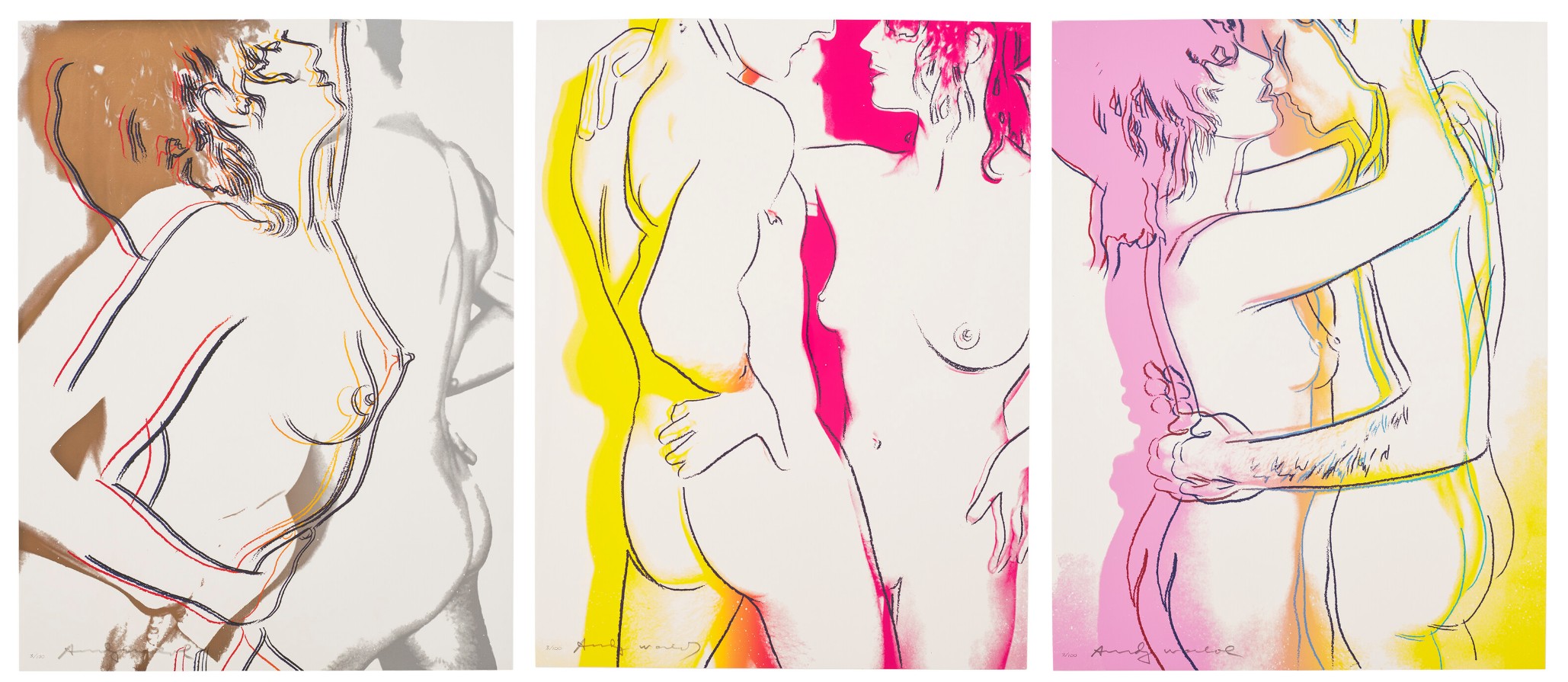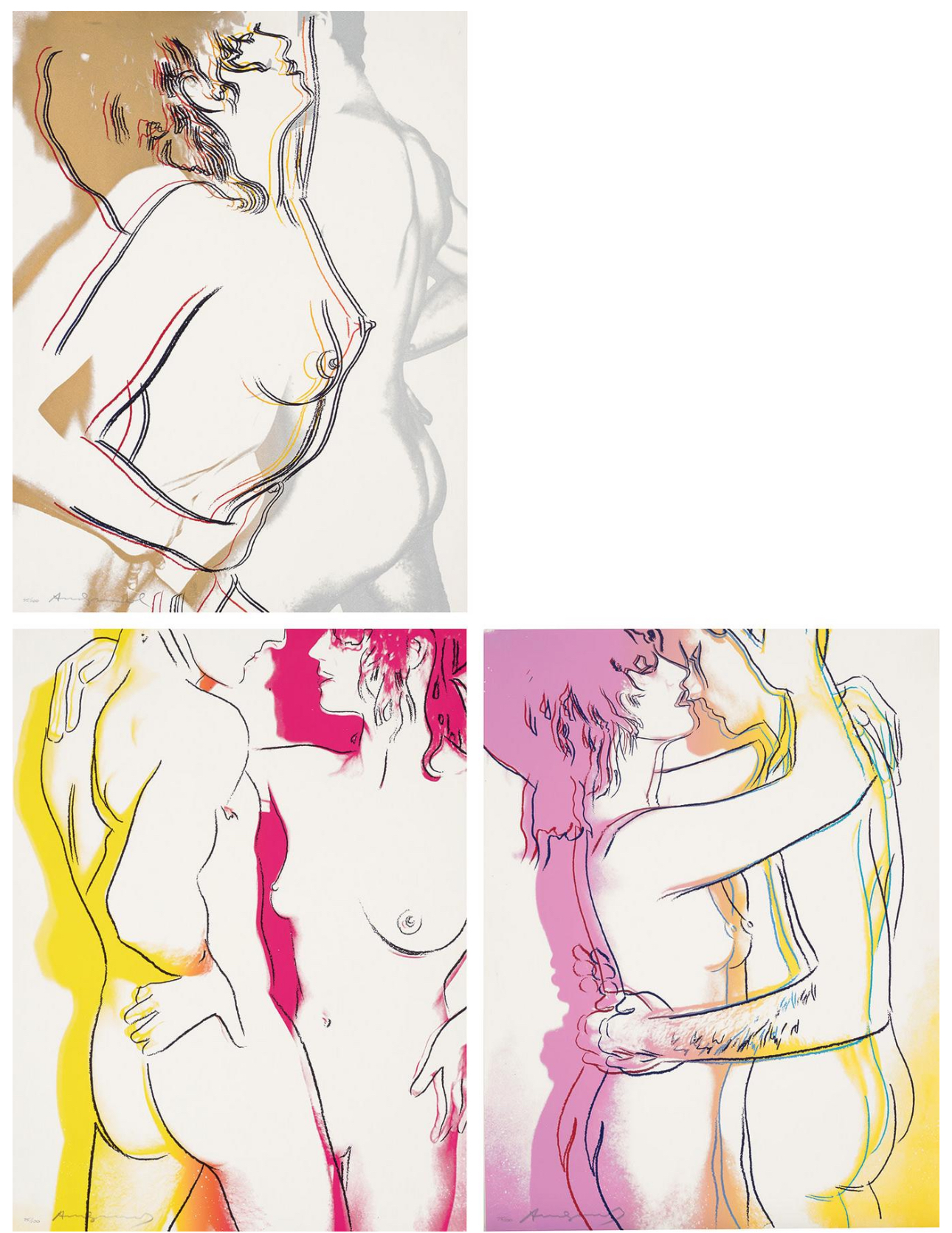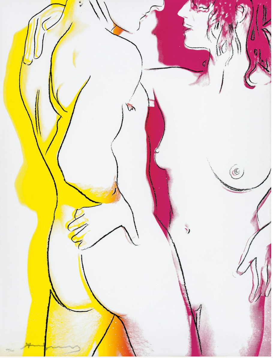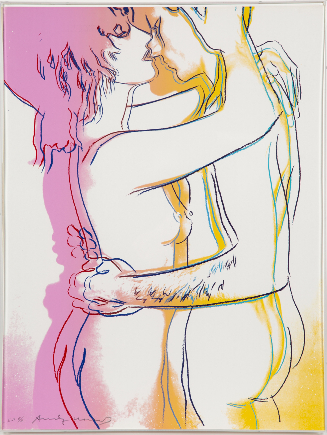 The series consists of a portfolio of three screenprints, each depicting a nude couple in different stages of an intimate embrace. The couple’s embrace is enhanced by a colorful aura that surrounds their bodies, suggesting attraction and a fantasy-like quality. The colors bleed and mingle at the bottom of the composition, symbolizing the couple’s union. The compositions use broad areas of white space and gestural graphic lines to emphasize the tenderness of the interaction, a style that recalls Warhol’s early career as a commercial illustrator.