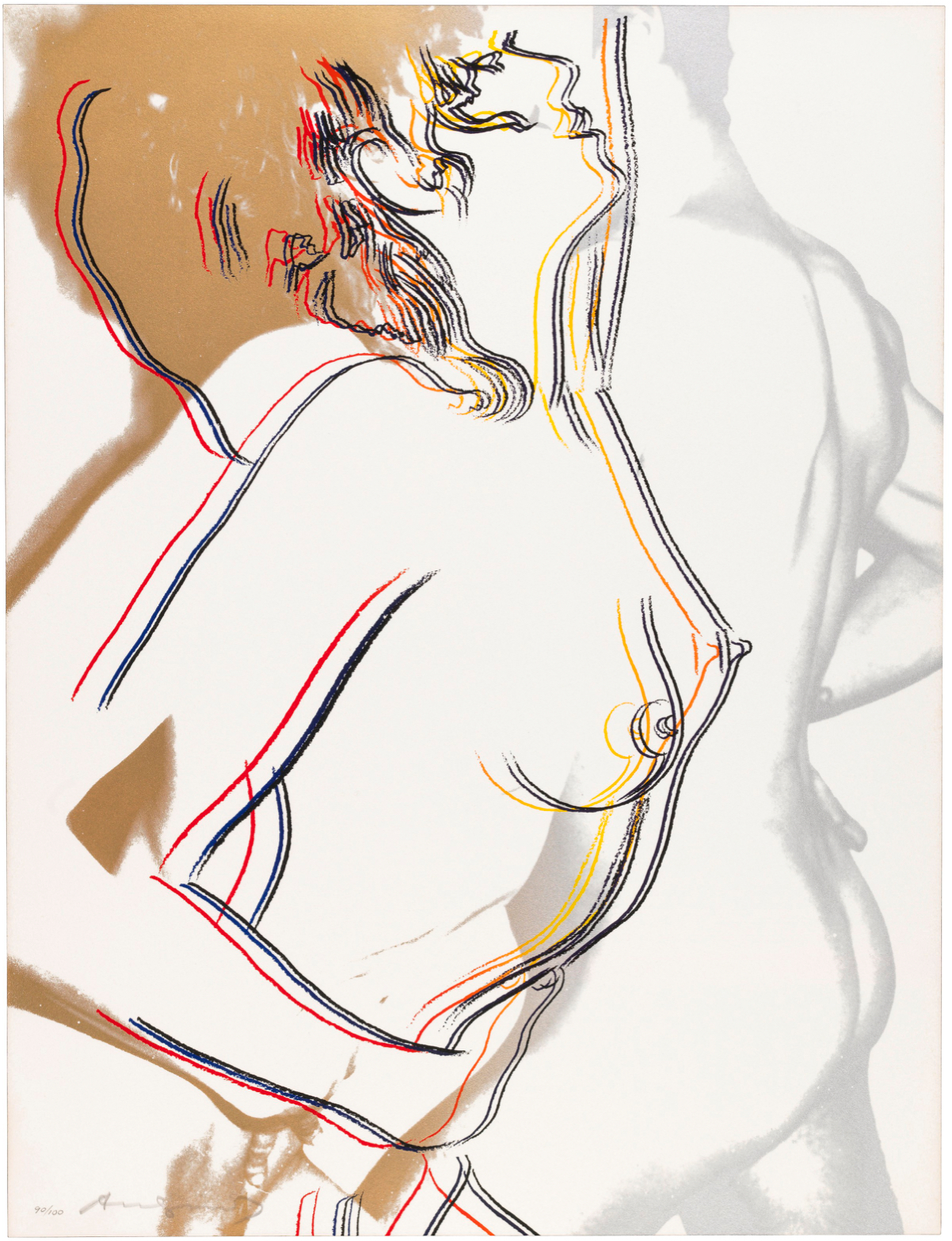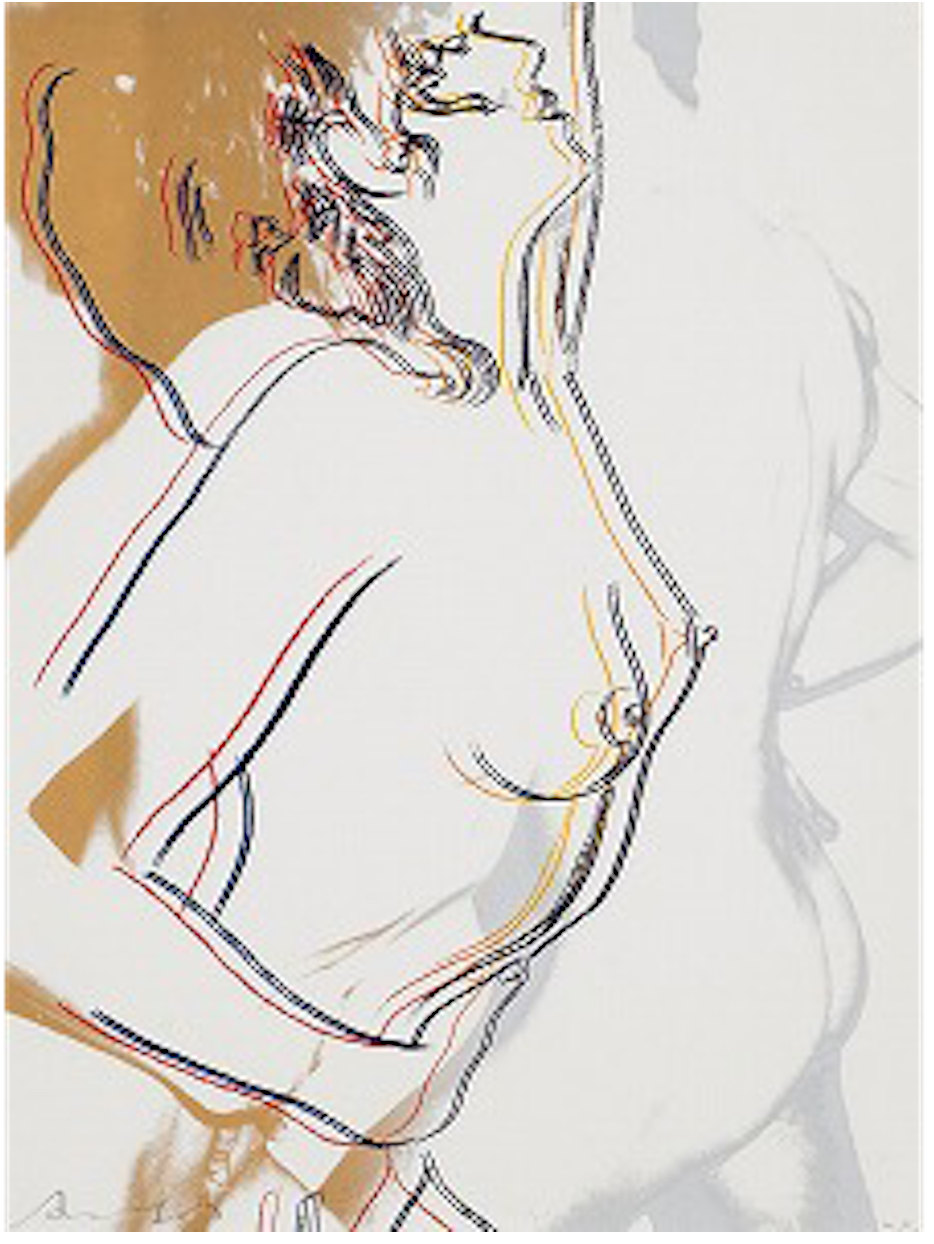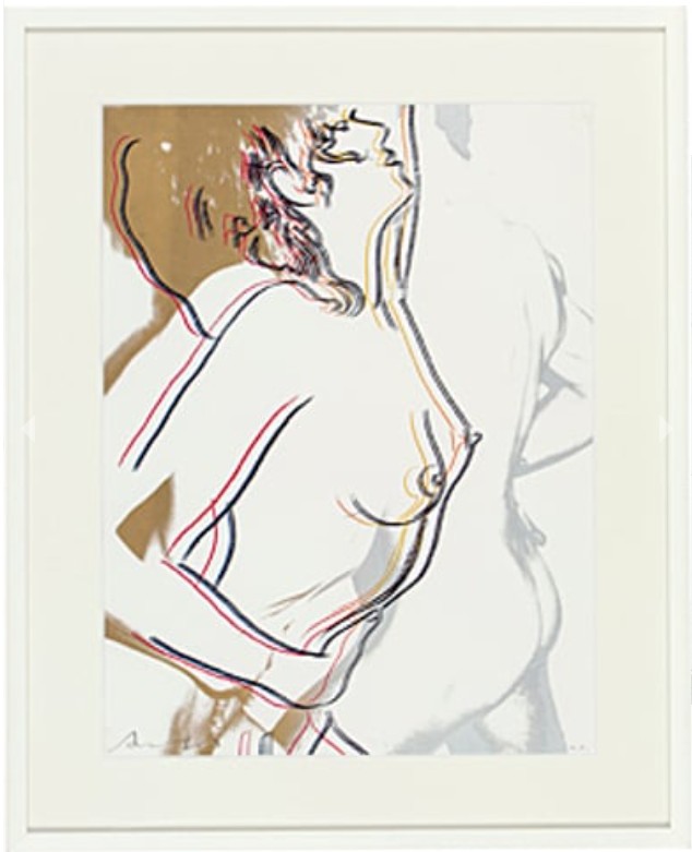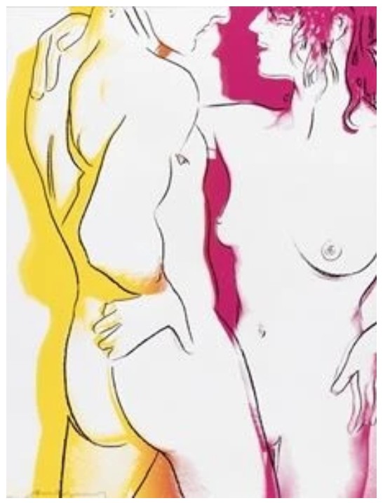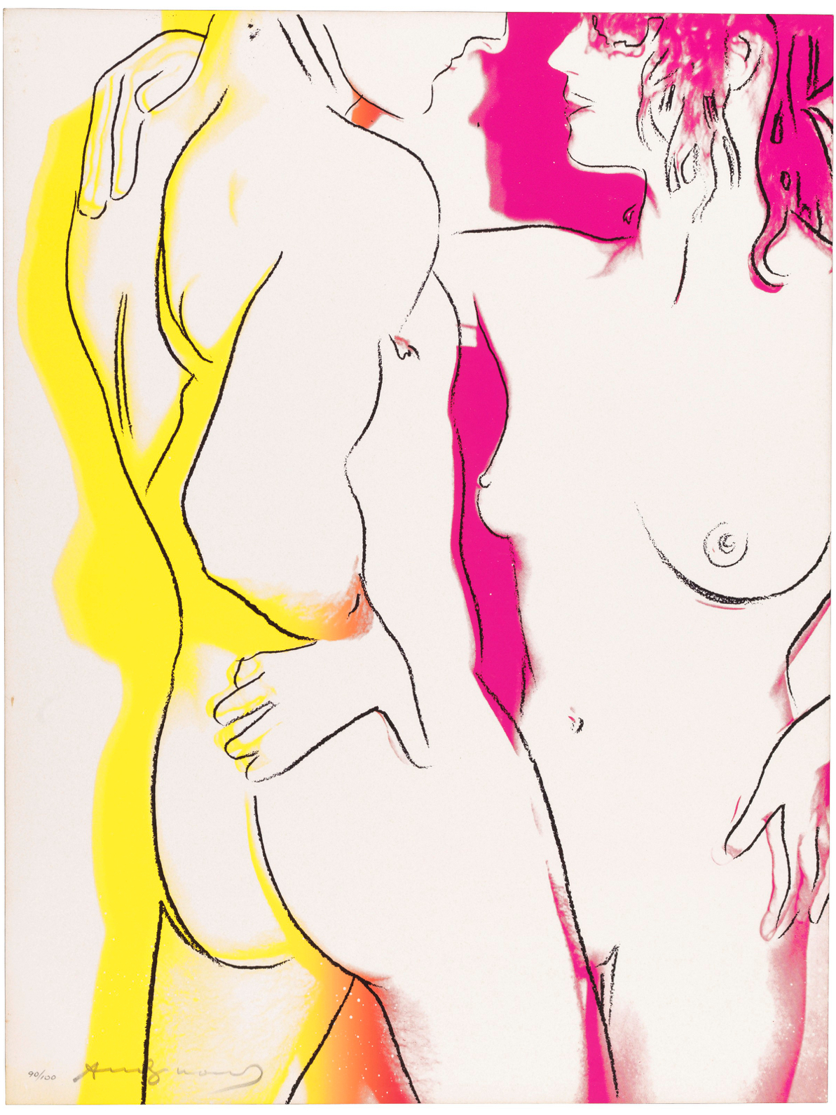 The series consists of a portfolio of three screenprints, each depicting a nude couple in different stages of an intimate embrace. The couple’s embrace is enhanced by a colorful aura that surrounds their bodies, suggesting attraction and a fantasy-like quality. The colors bleed and mingle at the bottom of the composition, symbolizing the couple’s union. The compositions use broad areas of white space and gestural graphic lines to emphasize the tenderness of the interaction, a style that recalls Warhol’s early career as a commercial illustrator.