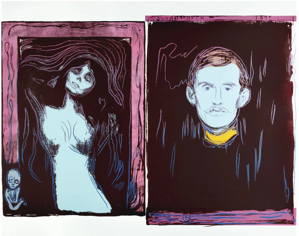 Reproduced many times in many different mediums and formats – at first by Munch himself, but then relayed by popular culture in the form of posters, gift shop mugs, calendars and so forth, Munch’s Madonna and Self-Portrait had already became mass-repeated icons by Warhol’s time. An image about images, the present work epitomizes Warhol’s remarkable feat of using available pictures from consumer culture as readymades, to ultimately instate – or, in this case, re-instate – them within the realm of high art. Superimposed with Warhol’s maximalist aesthetic, jagged lines and garish colours, Munch’s ominous and riveting works, thus appropriated as Warholian celebrity portraits, become Pop icons. “It is really a remarkably complex work” (Roland Augustine cited in: Exhibition Catalogue, New York, Scandinavia House, Munch/Warhol and the Multiple Image, 2013, p. 33).