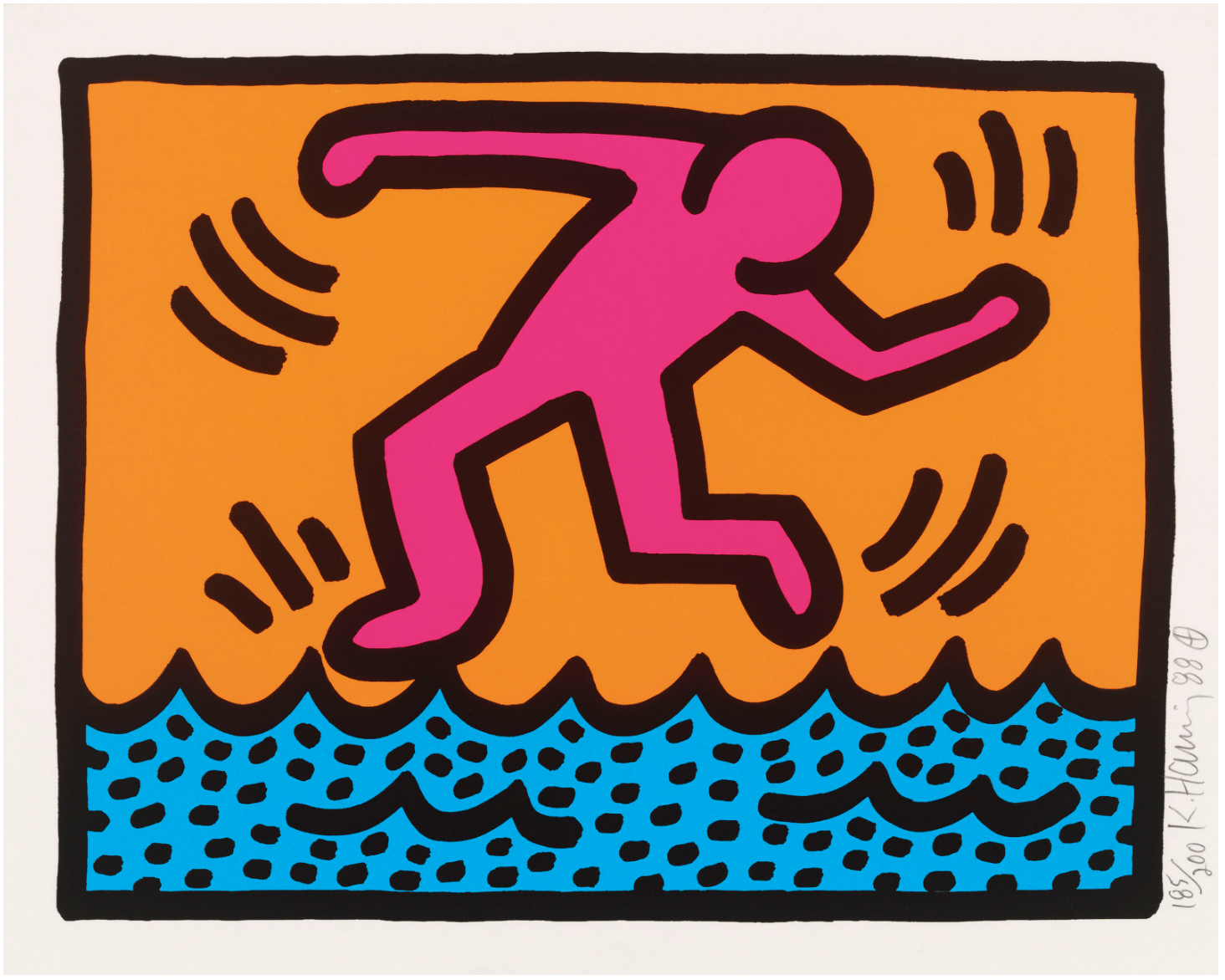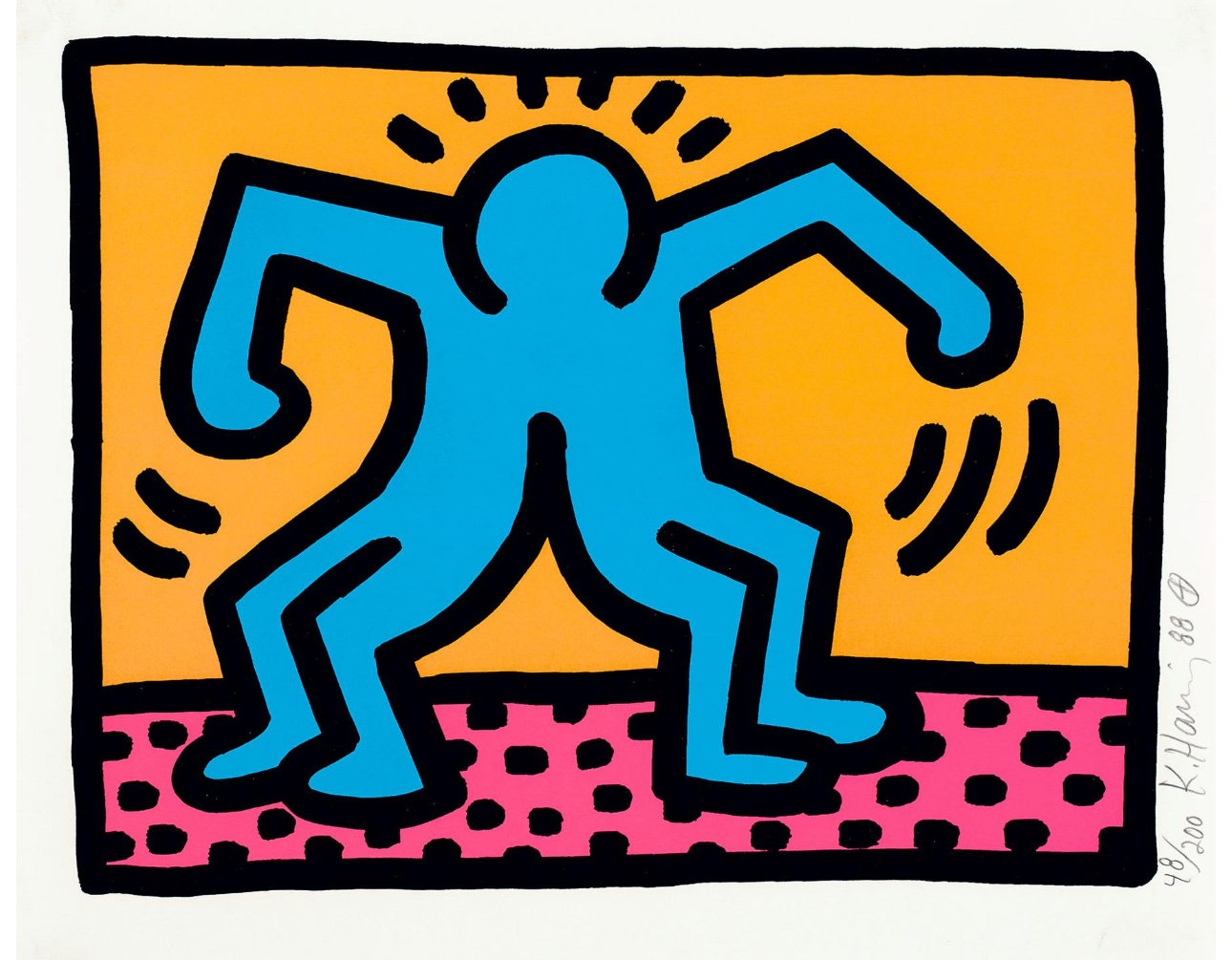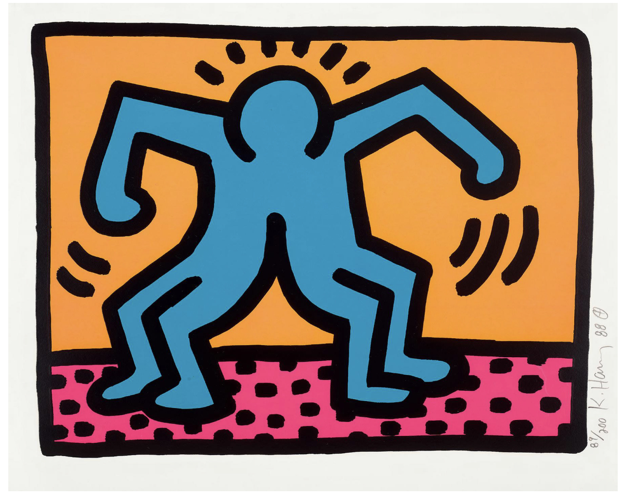 His love for commercial and Pop art was evident in his first experiments with street art which saw him creating signature figures he named ‘icons’, such as the barking dog, the radiant child and the winged superman. He would reproduce these figures over and over again, in bright colors reminiscent of advertising and later, just before his death from AIDS in 1990, in plain white embossings.