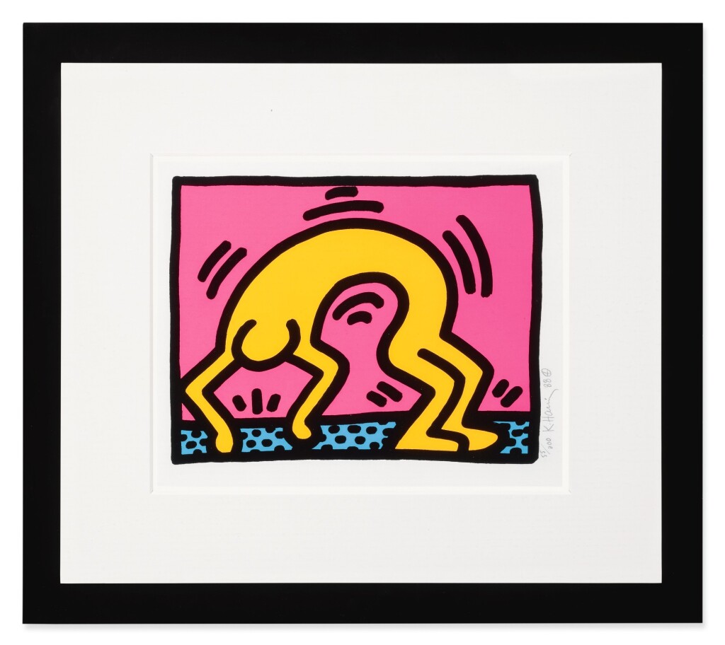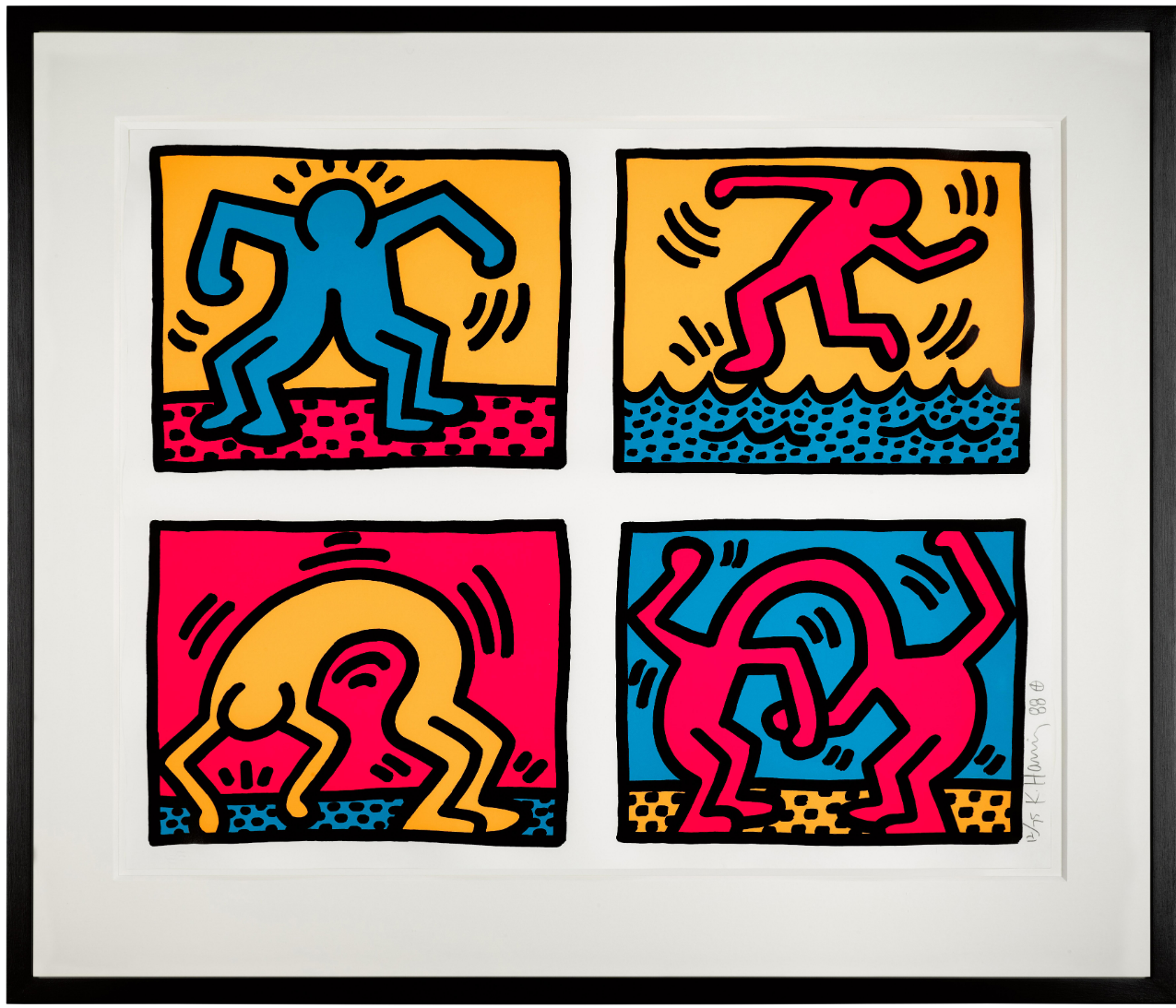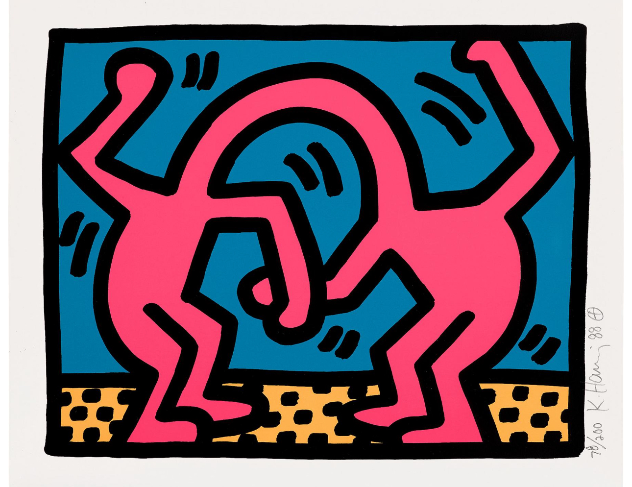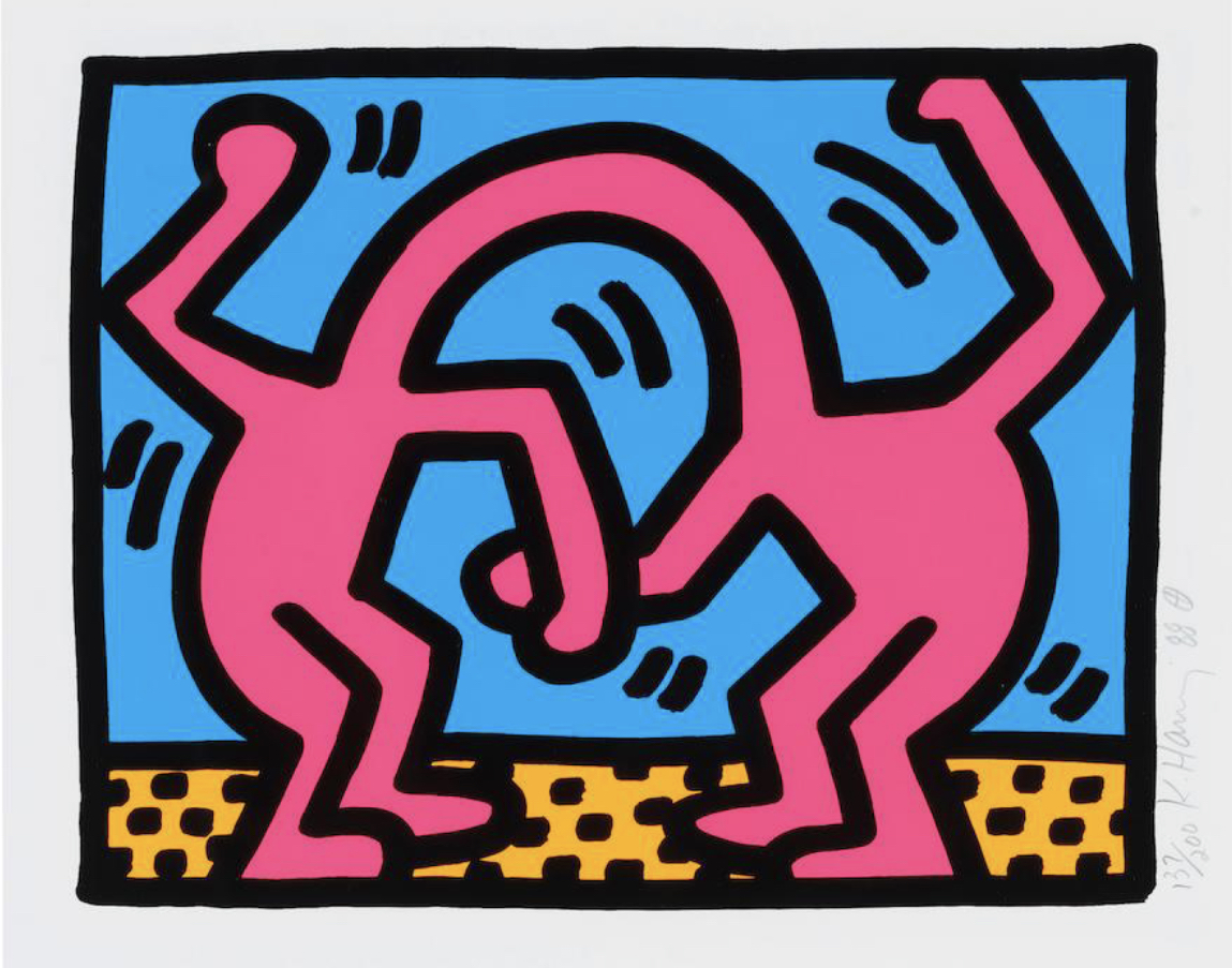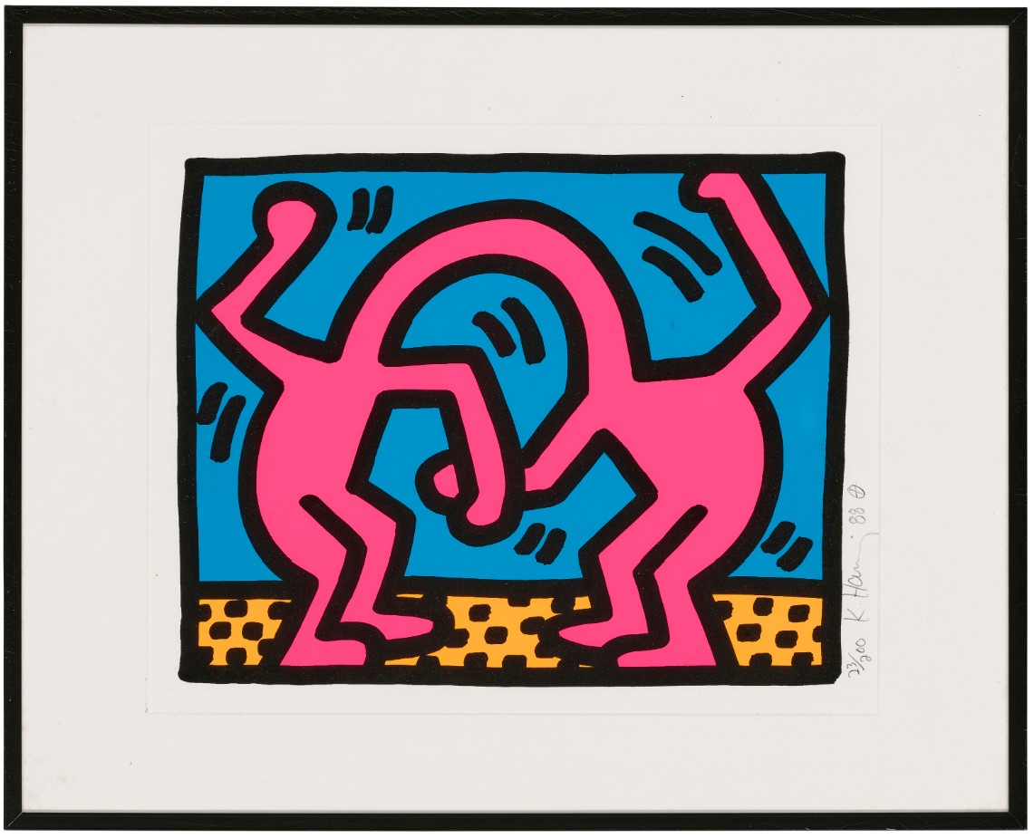 Haring’s iconic Pop Shop series is a testament to the artist’s ingenuity when it came to translating his drawings to the medium of screen printing. Pop Shop II features Haring’s characteristically cartoonish figures in various states of ecstasy, whether joined at the head or bending over backwards surrounded by joyful energy lines. The thick black outlines are typical of Haring’s street art style, developed in the subways and on the walls of New York in the early 80s.