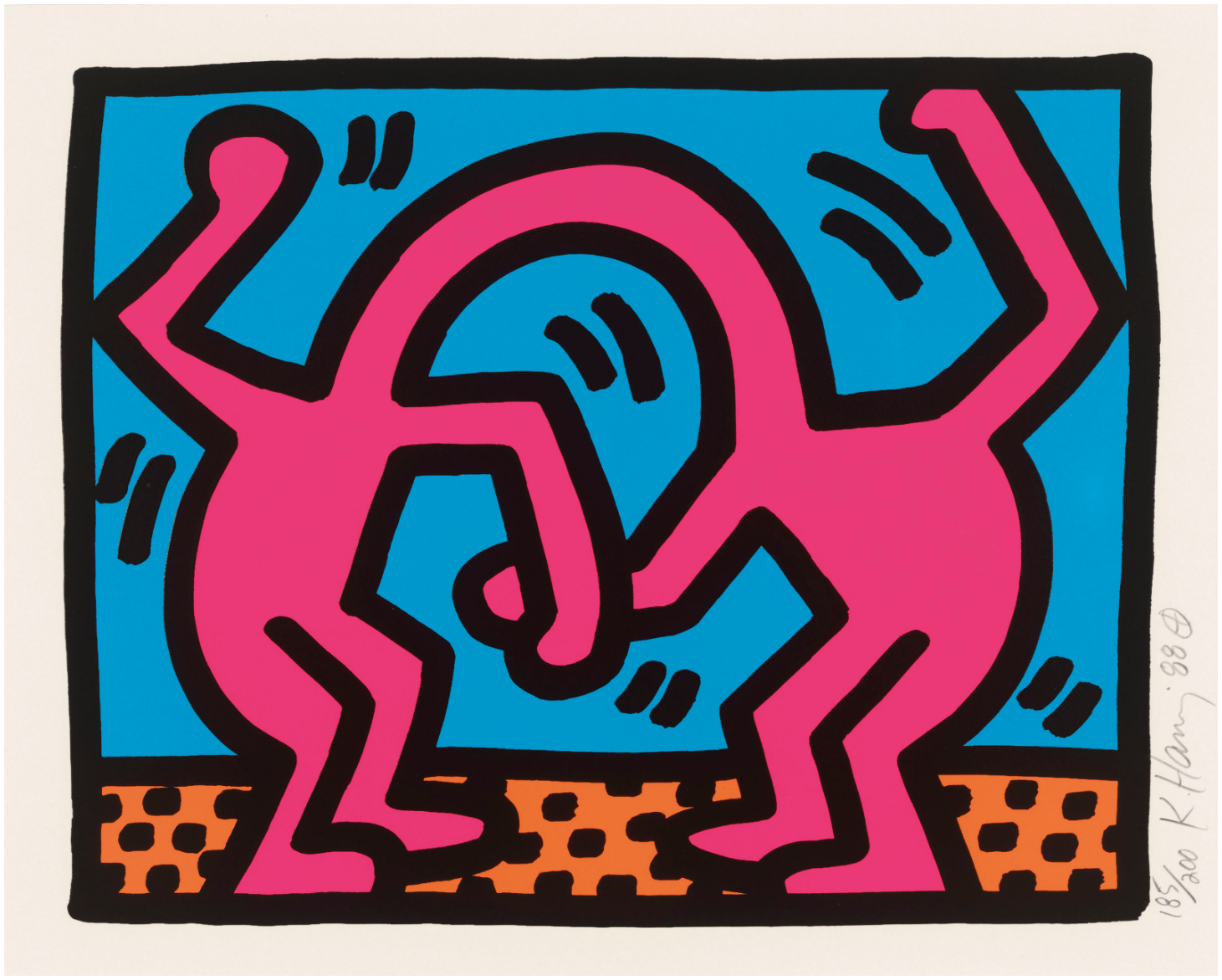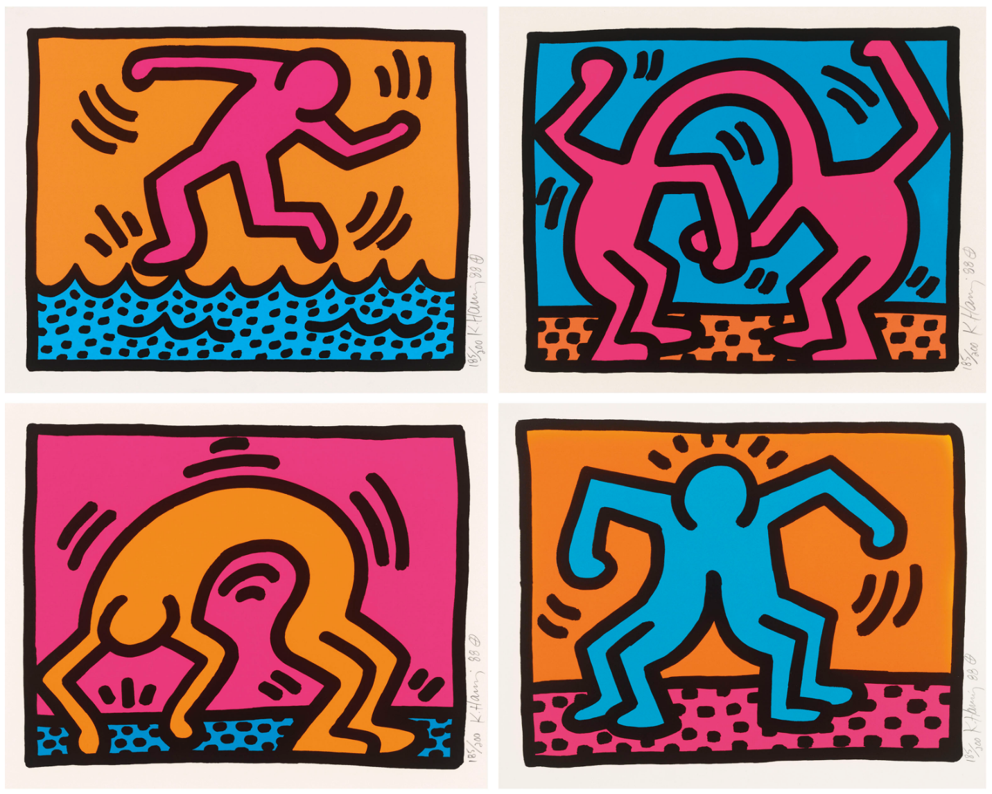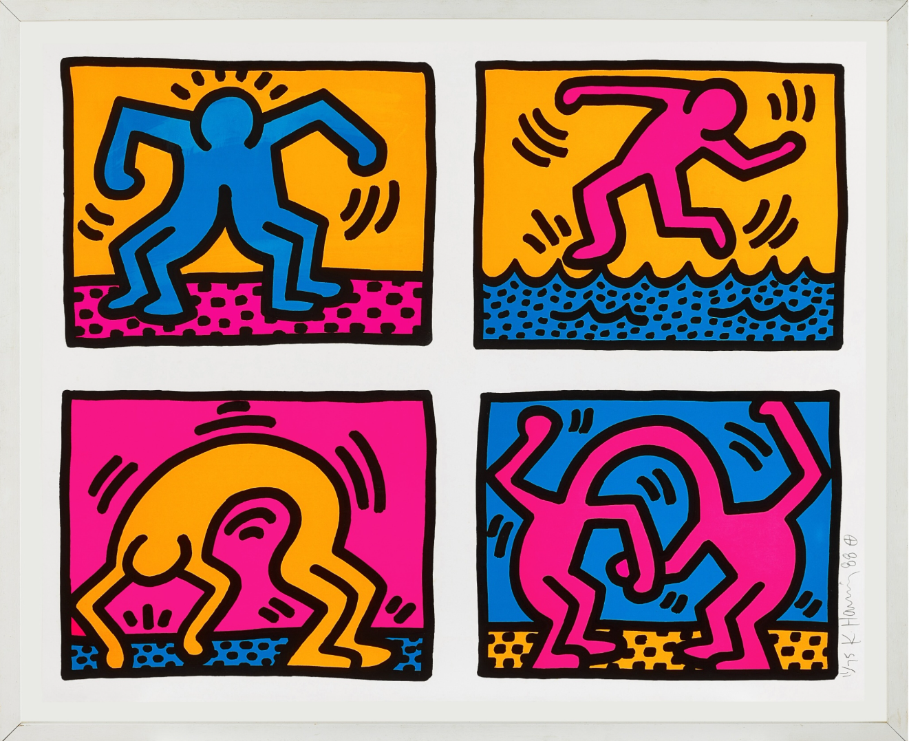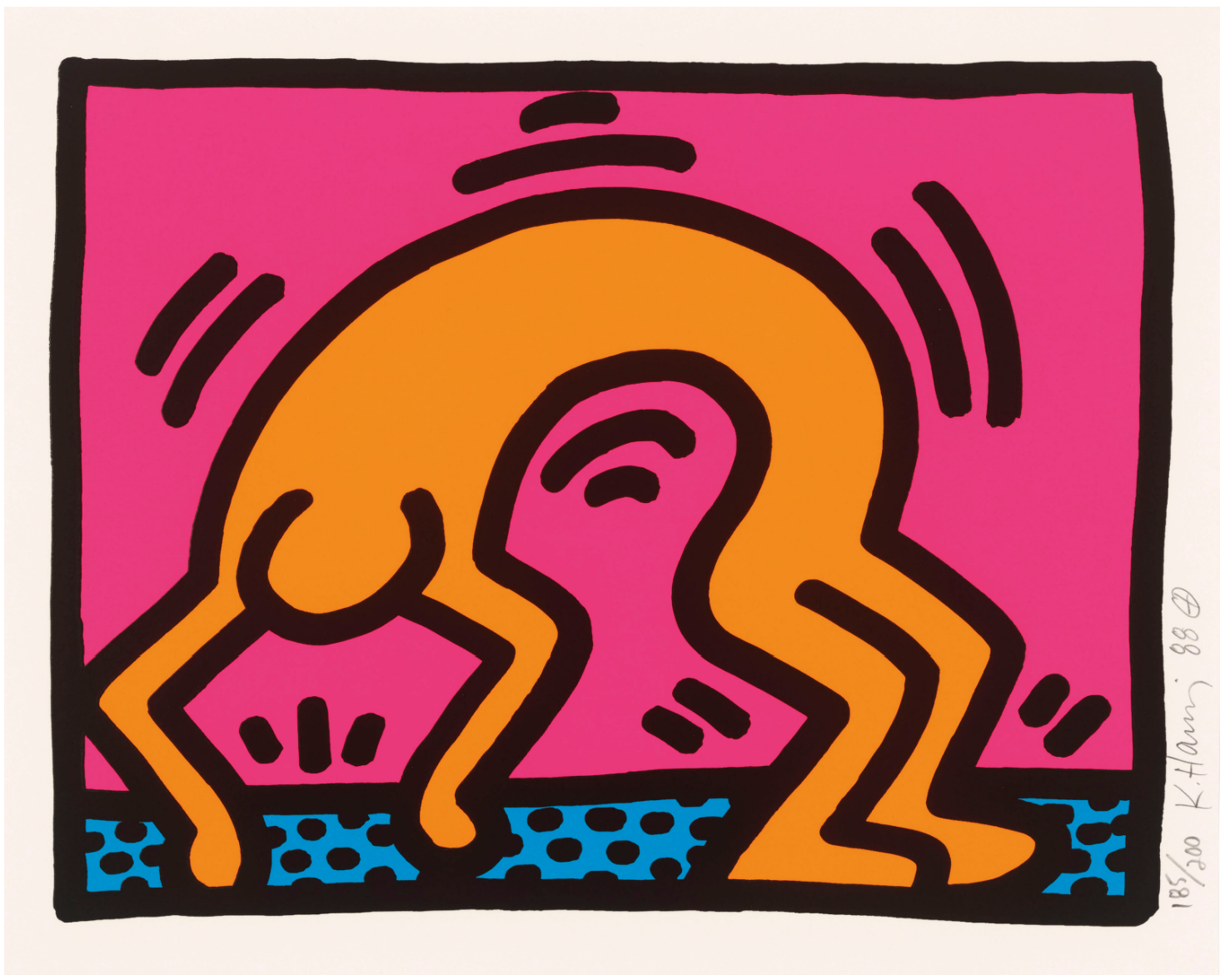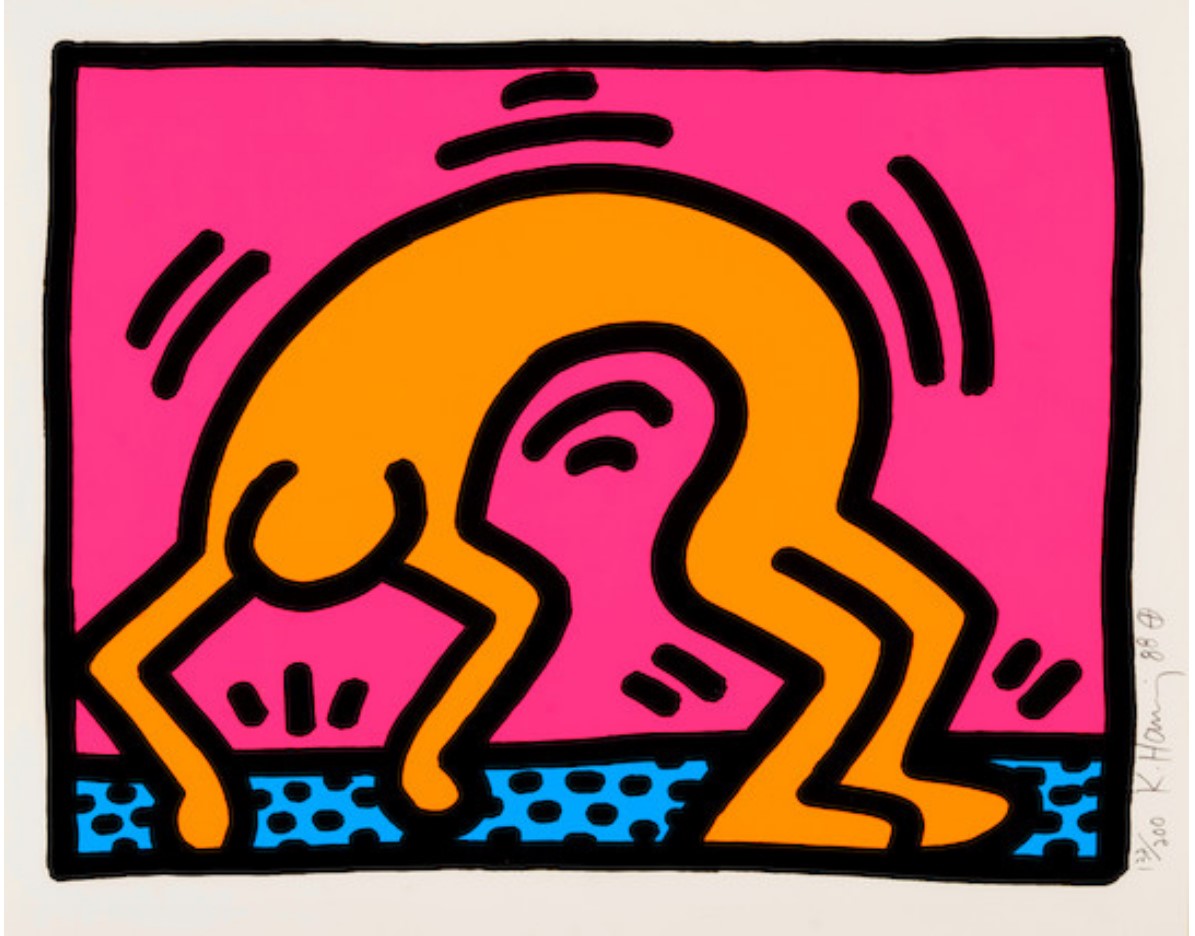 Printed in four layers of color (black, orange, blue and magenta), this portfolio shows Haring’s mastery of screen printing as a medium. Though he had experimented with print techniques such as lithography in the late 70s and 80s it wasn’t until 1983 that Haring began making screen prints, or serigraphs, which offered a way of creating multiple images, that artists had adopted from the world of commercial printing. This move to screen printing was undoubtedly due in part to the method being popularized by Warhol, one of Haring’s most important influences, and soon he was producing ever more inventive and daring work.