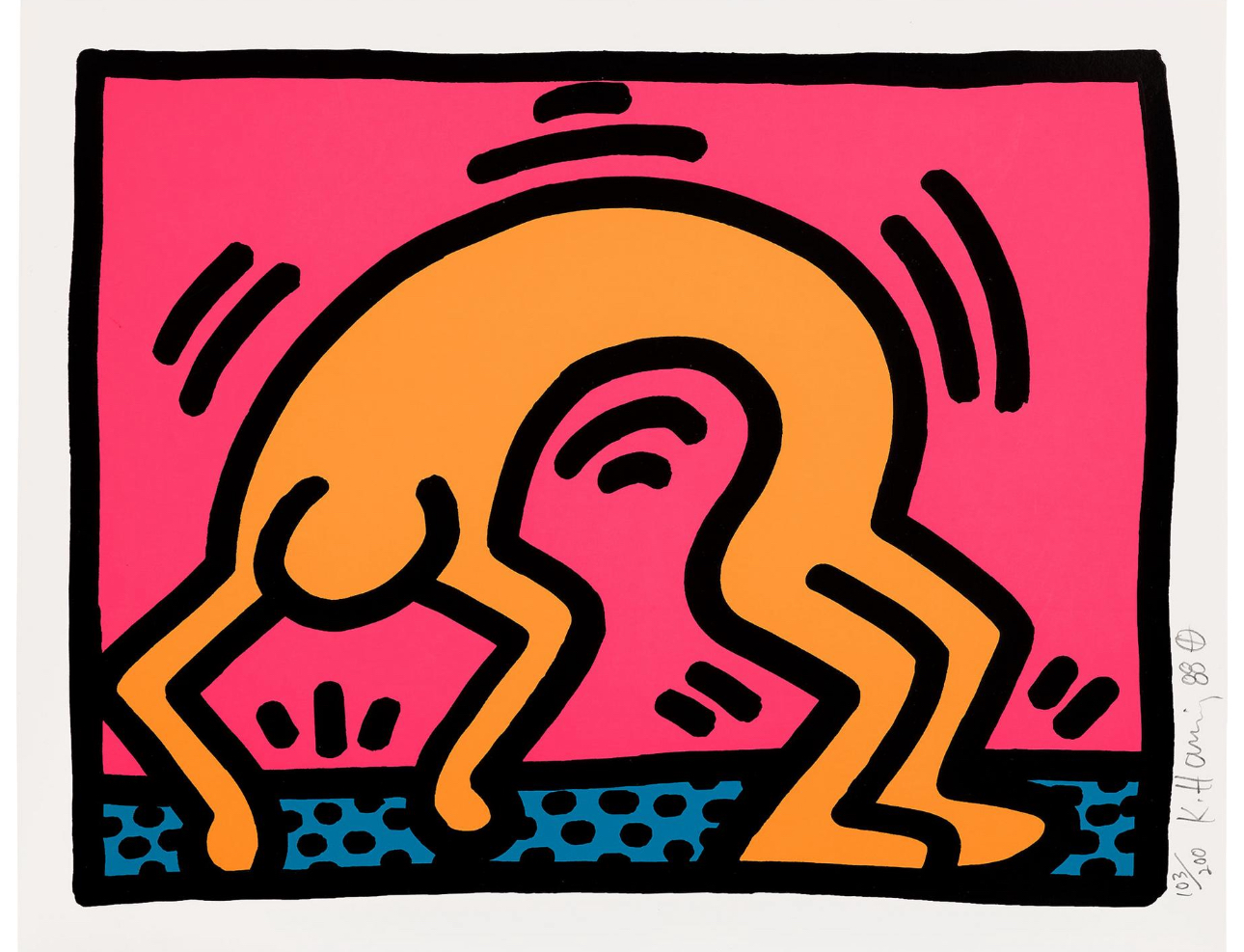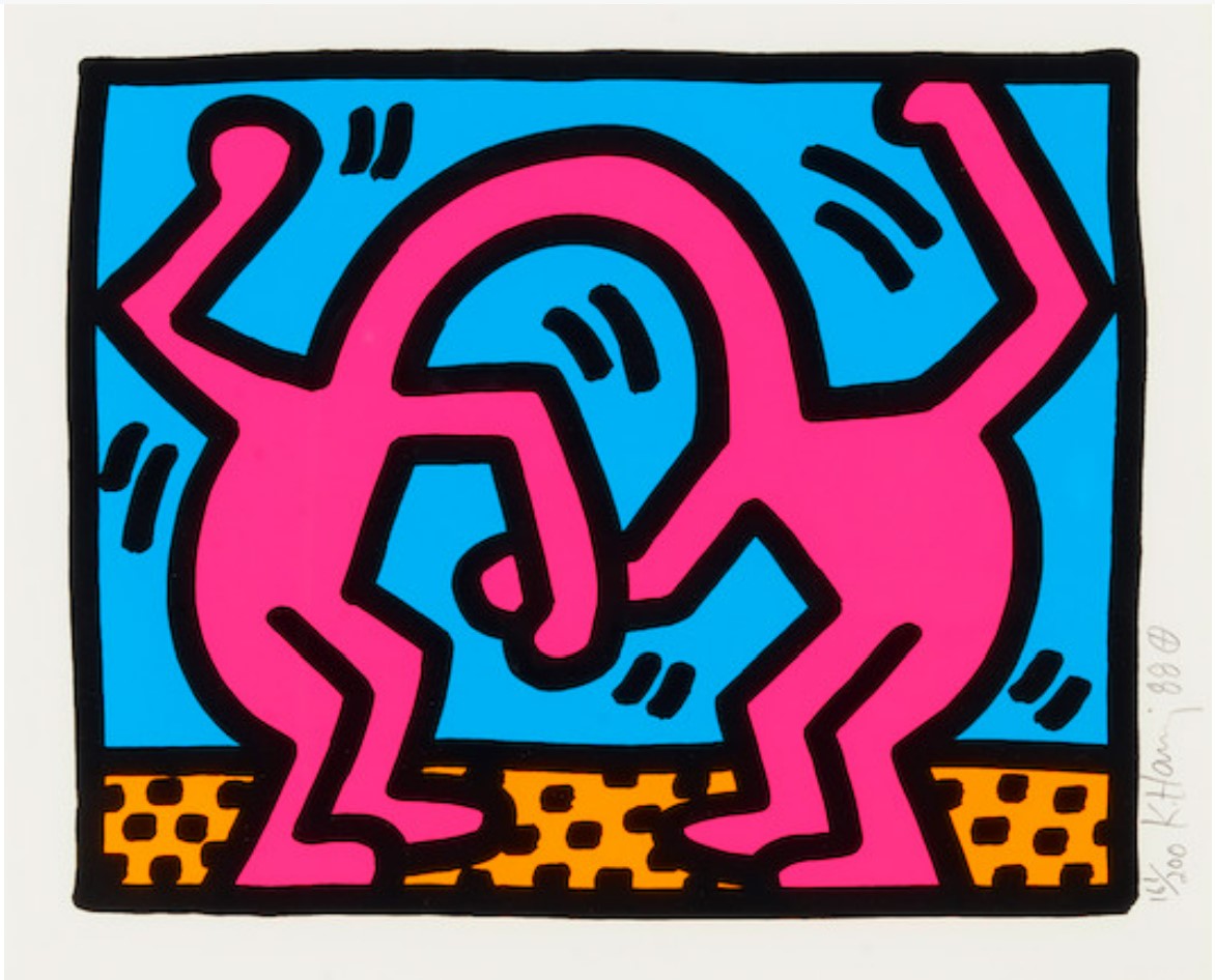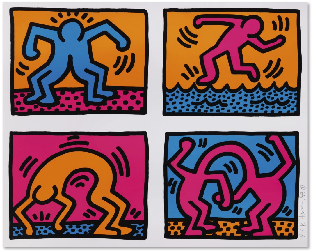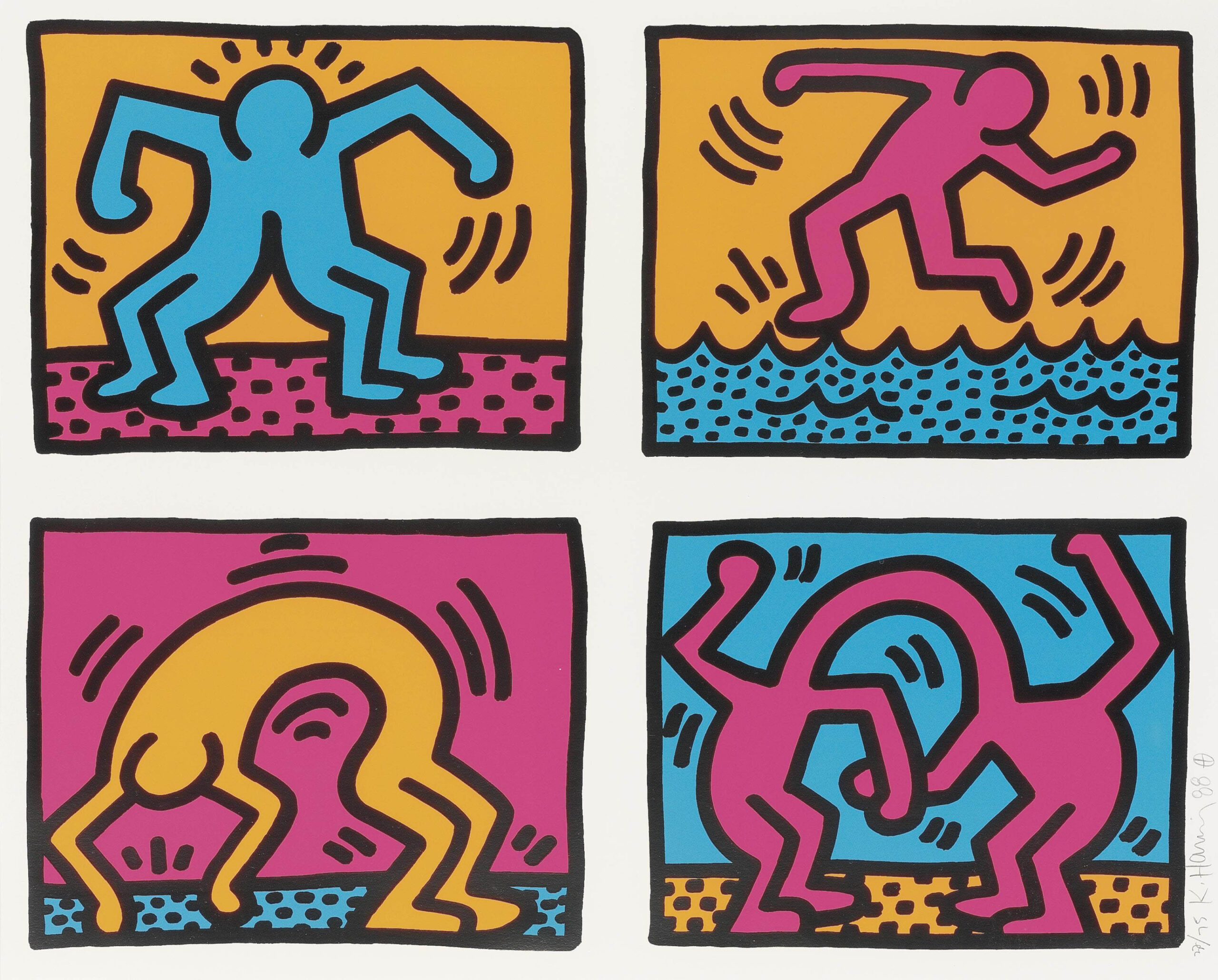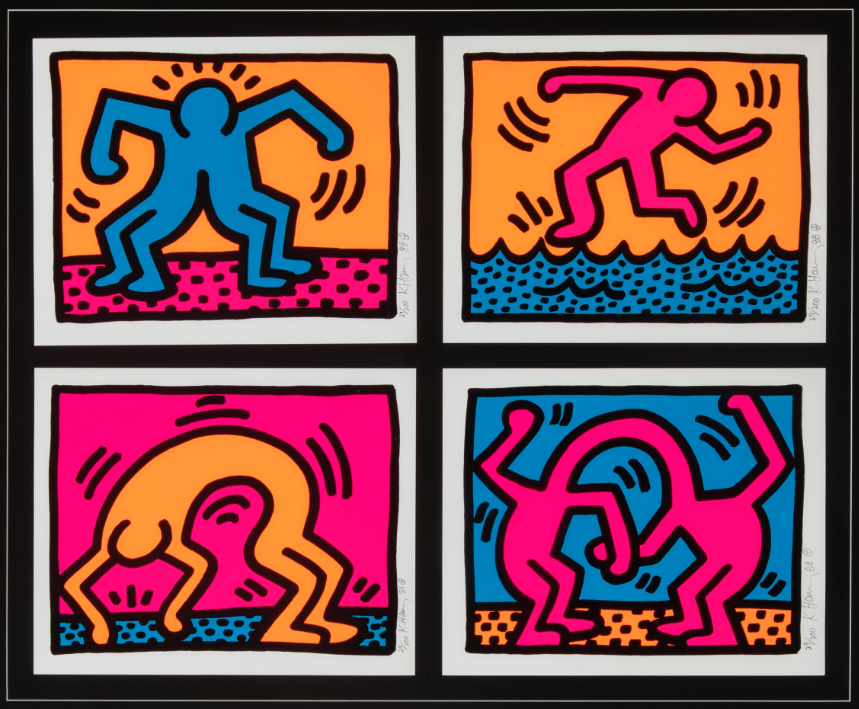 Printed in four layers of color (black, orange, blue and magenta), this portfolio shows Haring’s mastery of screen printing as a medium. Though he had experimented with print techniques such as lithography in the late 70s and 80s it wasn’t until 1983 that Haring began making screen prints, or serigraphs, which offered a way of creating multiple images, that artists had adopted from the world of commercial printing. This move to screen printing was undoubtedly due in part to the method being popularized by Warhol, one of Haring’s most important influences, and soon he was producing ever more inventive and daring work.