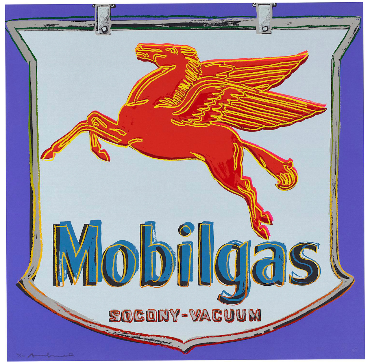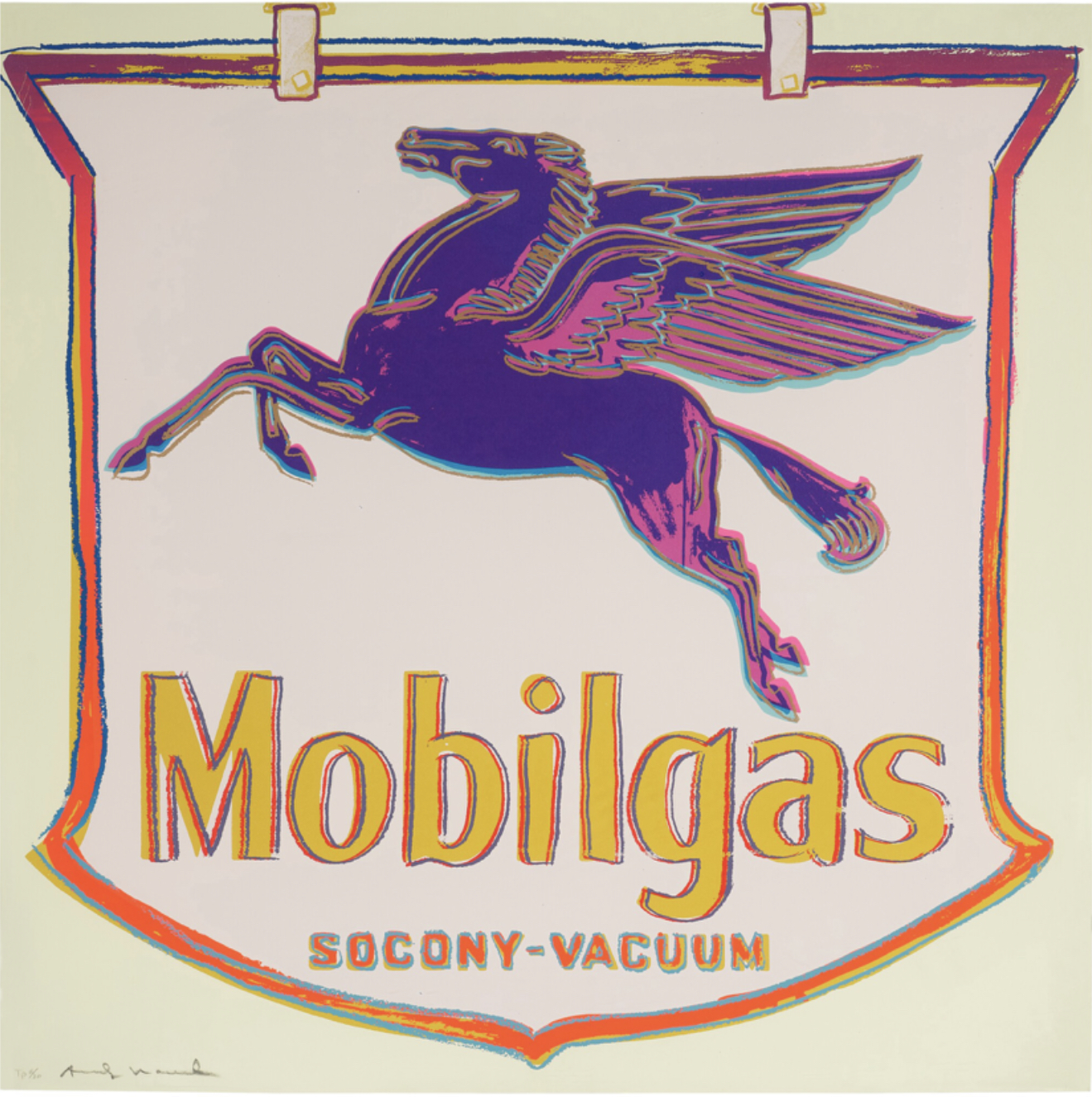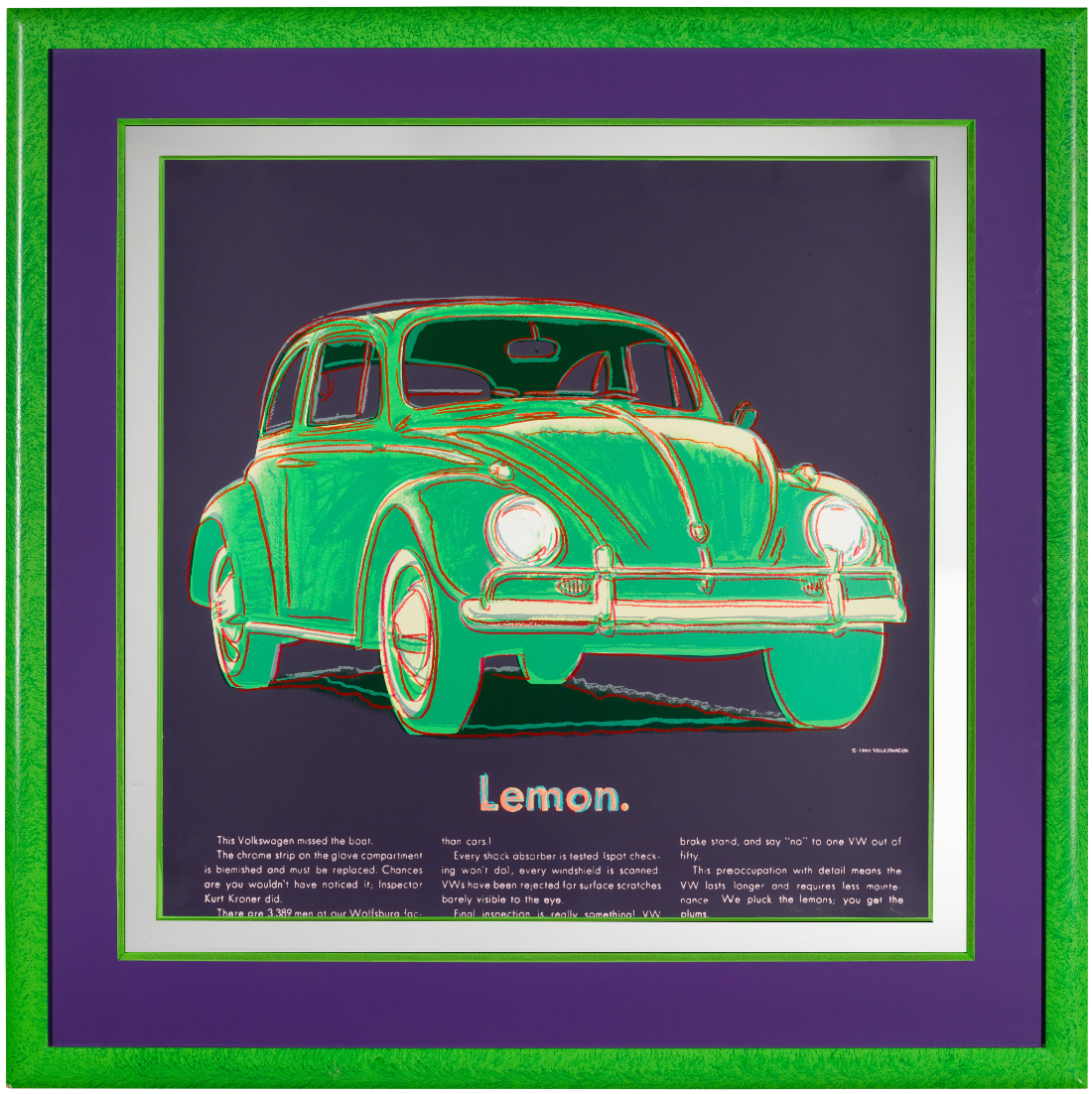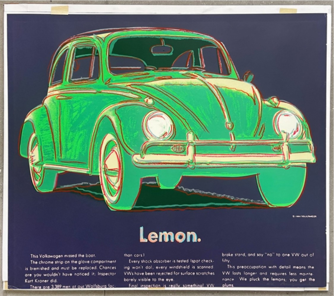 The Ads portfolio was printed in 1985, two years before Warhol’s death. It was commissioned by Feldman Fine Arts and is comprised of 10 screen prints on Lennox Museum Board: Mobil, Blackglama (Judy Garland), Paramount, Life Savers, Chanel, Rebel Without a Cause (James Dean), Van Heusen (Ronald Reagan), The New Spirit (Donald Duck), Volkswagen and Apple. The Ads portfolio is an acclaimed part of Warhol’s oeuvre as it depicts some of the icons of American consumer culture. Its subjects cover film, celebrity, glamour, fashion, television and advertising. By turning mass media imagery into art, Warhol elevated the everyday, celebrating the democratization of popular consumer culture. Whilst working on this portfolio Warhol created a series of different color versions of each image, before selecting one to be printed in an edition of 190. These initial ‘trial proofs’ were preserved and released as a formal component of the edition. Warhol also realized various works on canvas using the same visuals.