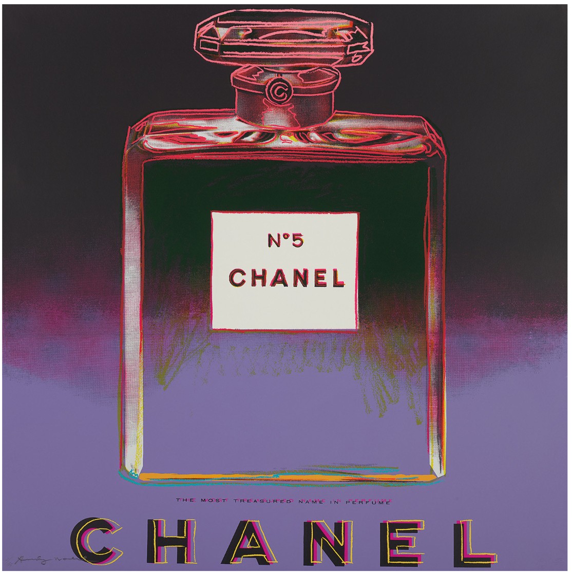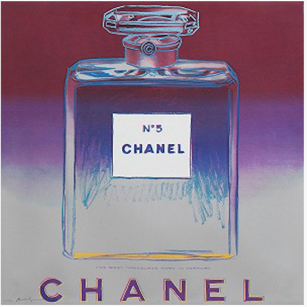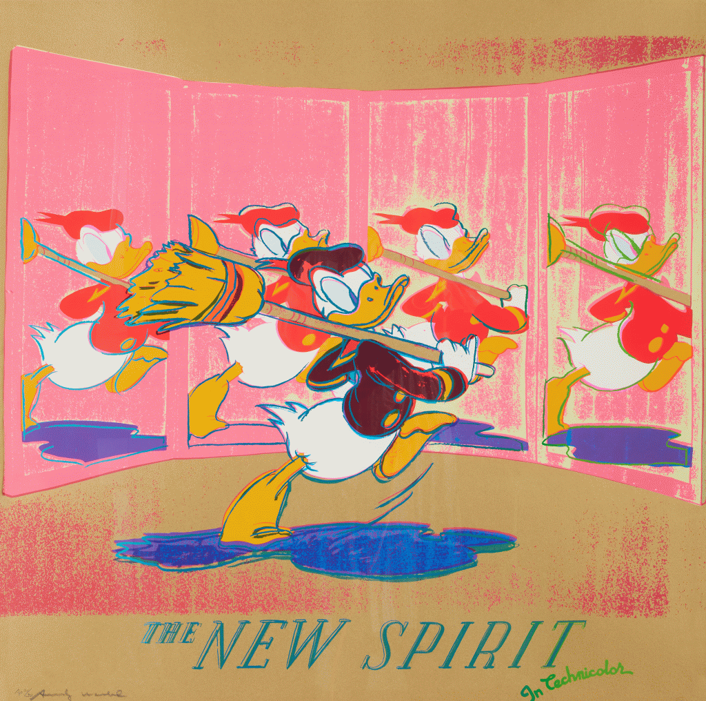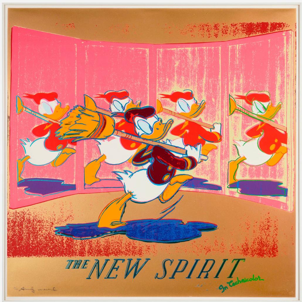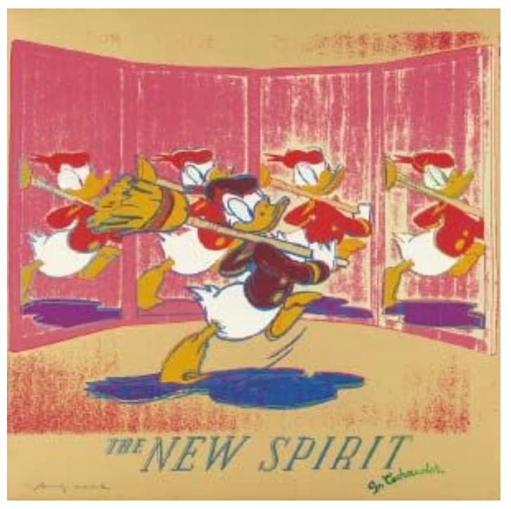 A fascinating dialogue is formed when screenprint, originally a commercial printing technique, is utilized to portray symbols of commerce. By the time Ads was published in 1985, Warhol had mastered the medium and the technical complexity of these prints is astonishing. For example, The New Spirit (Donald Duck) employed over a dozen screens and multiple colors including neon and metallic hues. The inherently flat quality of a screenprint is counterbalanced in these prints with an almost theatrical quality, such as the haunting Chanel perfume bottle floating on an ombré background. The project was an ideal intersection of propaganda and proliferation wherein logos produced by the culture of the era were in turn recreated in multiple forms so that they could reach the largest audience in the same manner that an advertisement is crafted with the hope that it will be widely broadcast.