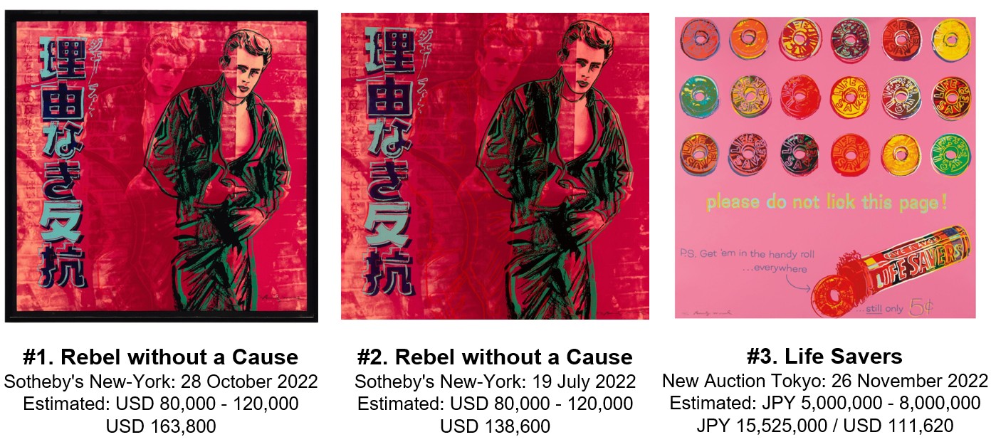 | 2023 | Sold Twice Average Price: USD 120,834 181/190: CAD 168,750 (USD 127,325) @ Waddington’s Toronto on 29 June 2023 69/190: USD 114,300 @ Sotheby’s New-York on 19 April 2023 Rebel without a Cause (TP 23/30): USD 222,250 @ Phillips New-York on 26 October 2023 |