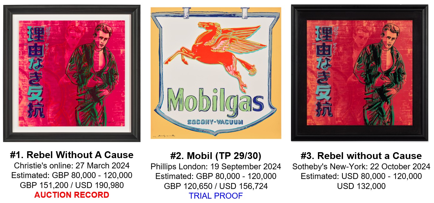 | 2024 | Sold Twice Average Price: USD 161,490 182/190: Auction Record Price GBP 151,200 (USD 190,980) @ Christie’s online on 27 March 2024 74/190: USD 132,000 @ Sotheby’s New-York on 22 October 2024 No Trial Proof sold at Auction in 2024 |