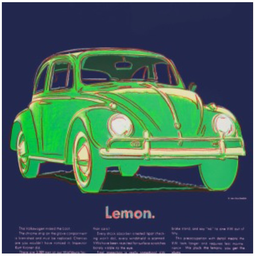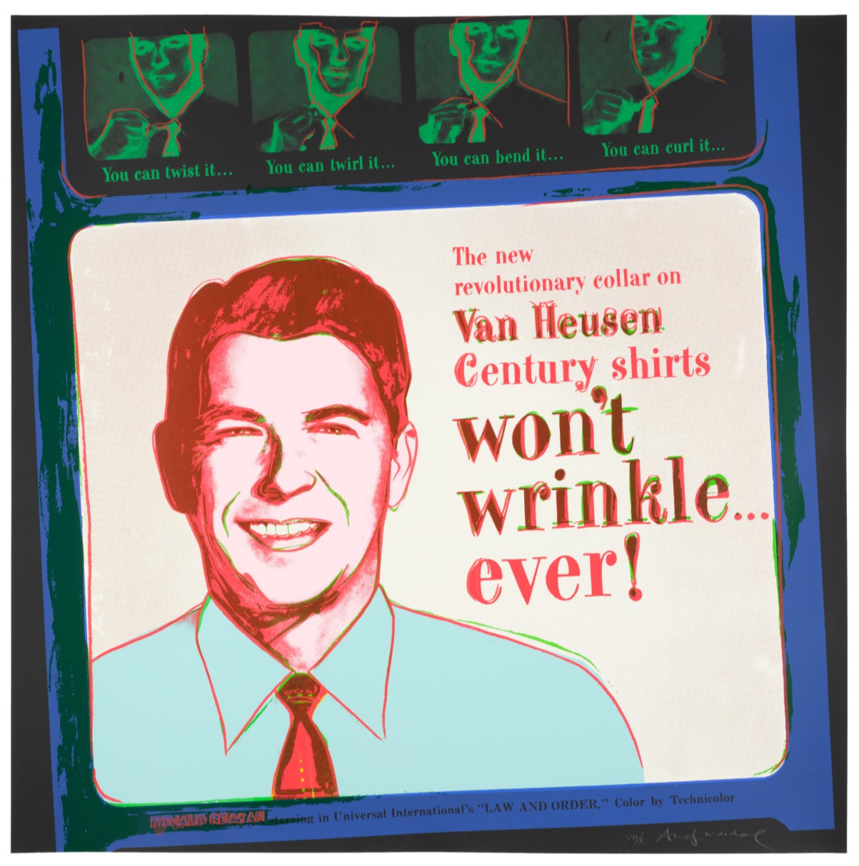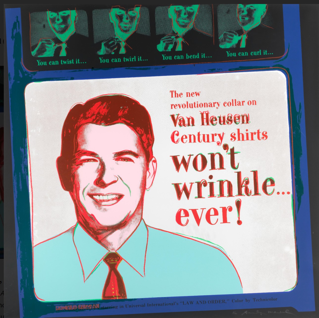 The power of advertising is a concept often discussed – why does it hold our interest; how can it be influential? For one, we are instantly attracted to the element of nostalgia, within the portfolio both James Dean and Judy Garland are portrayed, both having been beloved movie stars who died tragically, harkening back to Warhol’s early Death and Disaster series and his fascination with the potential for fame to meet a heartbreaking end. Van Heusen is an intriguing collision of the past and present as it features Ronald Reagan, the actor as the ambassador for a man’s shirt company, yet at the time of the portfolio’s publication, he was president of the United States. Another draw for the consumer is the portrayal of strength or dominance and what could signify success more blatantly than the emblems of corporate titans such as Mobil or Paramount? Each image, or each AD, appropriates a product (Life Savers), a corporate logo (Macintosh) or a famous face (Judy Garland); opulence (Chanel) mixes with utility (Volkswagen) and reminiscence (Rebel Without a Cause). To recognize these advertisements as a means of capturing the consumer’s attention at the same time they are being mythologized, elevated from banal commercial to high art, is the ultimate irony on which Warhol, a brand now himself, built an entire career.