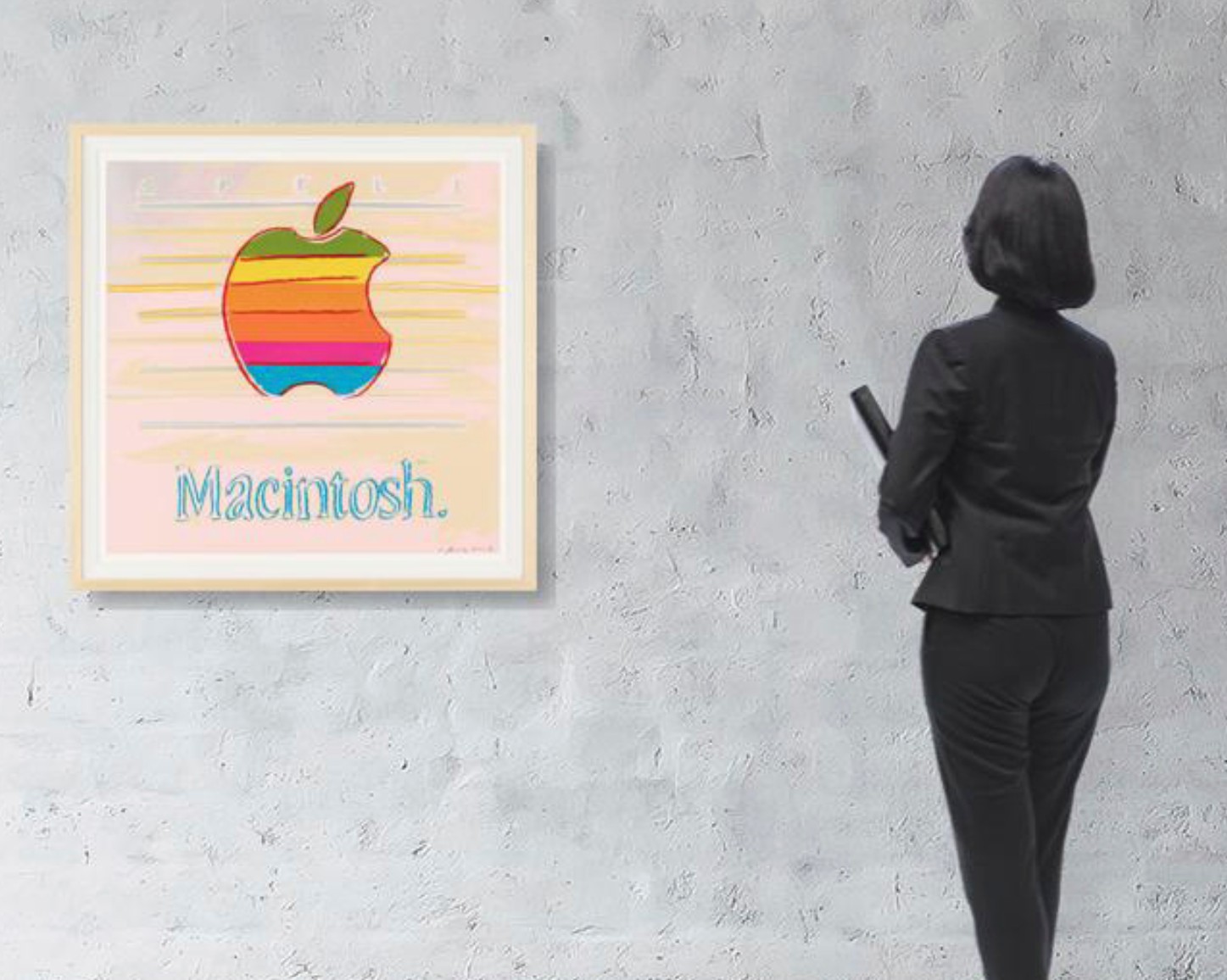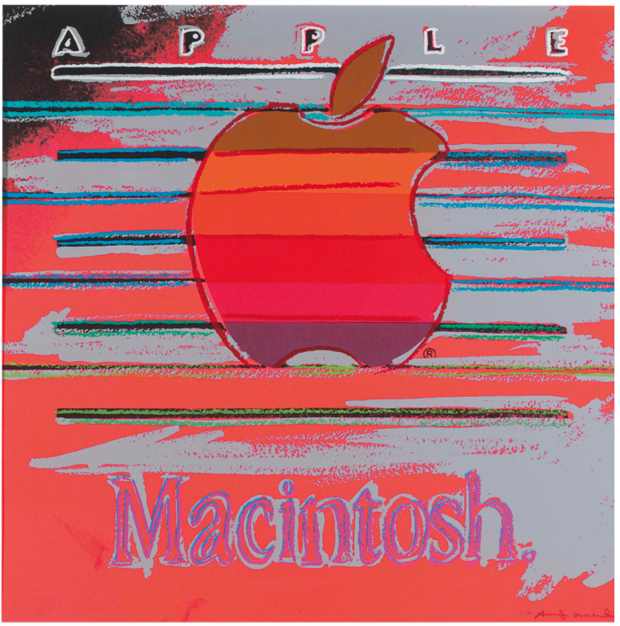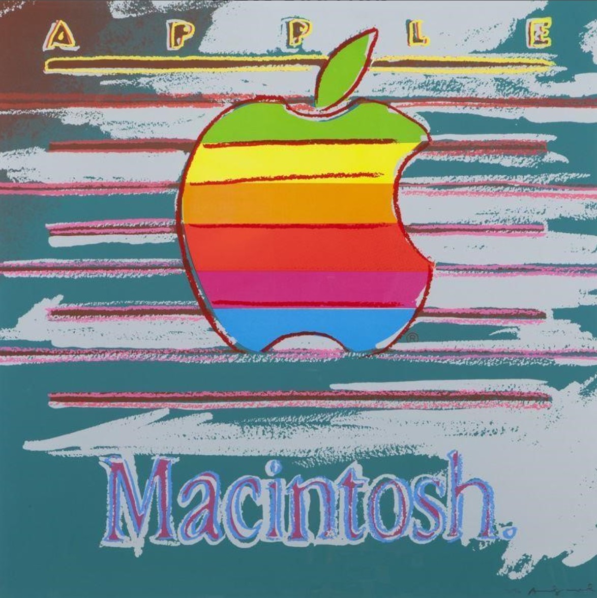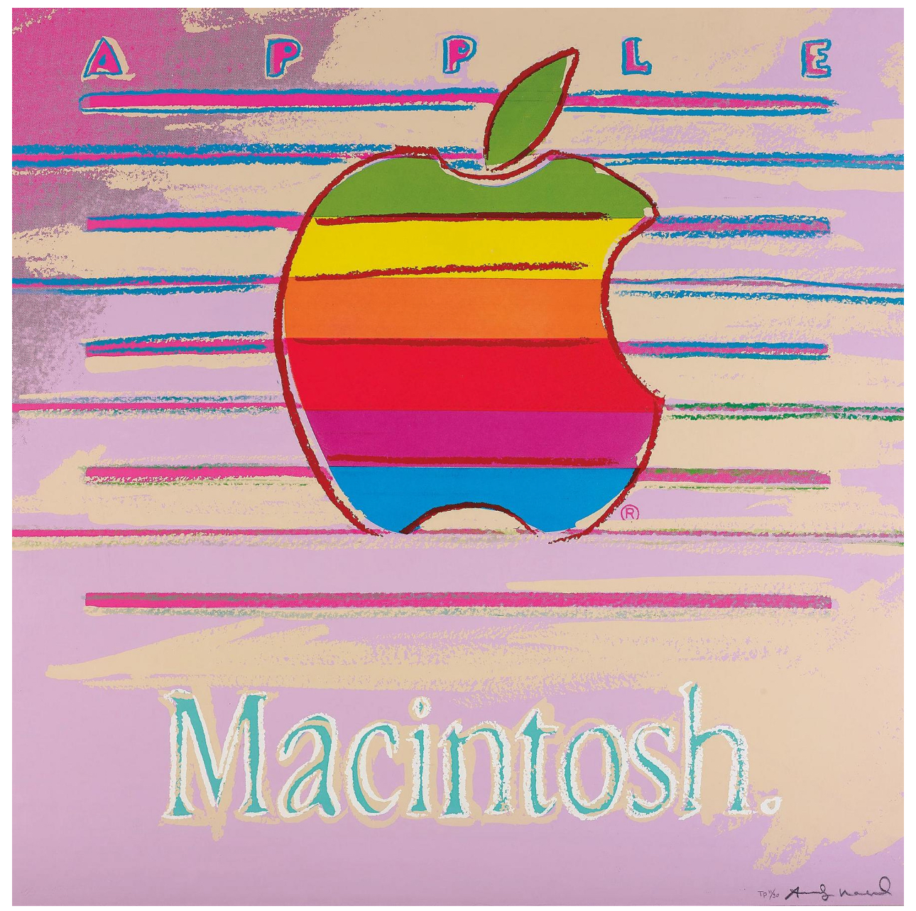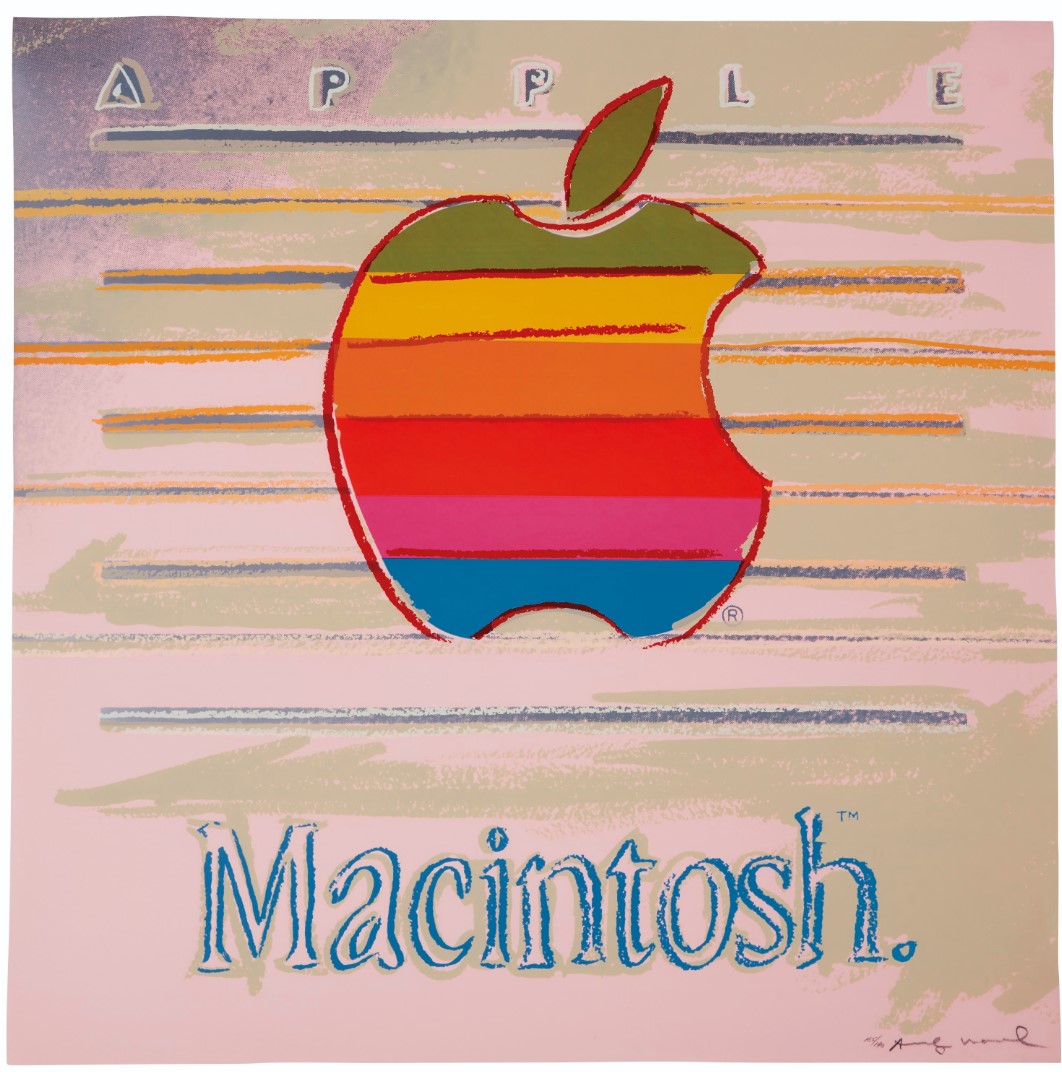 Apple features the multicolored, striped Apple Macintosh logo, rendered against a pastel pink backdrop. Printed on Lenox Museum Board, the logo is framed by the brand’s name, Apple Macintosh, drawing explicit attention to the association between this logo and global consumerism. The vivid colors in this print reflect Warhol’s celebration of American consumer culture and his transformation of the everyday into art, which led to a blurring of the boundaries between high and low culture. Indeed, this print is emblematic of how Warhol turned mass media imagery into art. The bold color in this print, achieved by multiple screens and a layering of paint, is accompanied by gestural lines, delineating the Apple logo.
