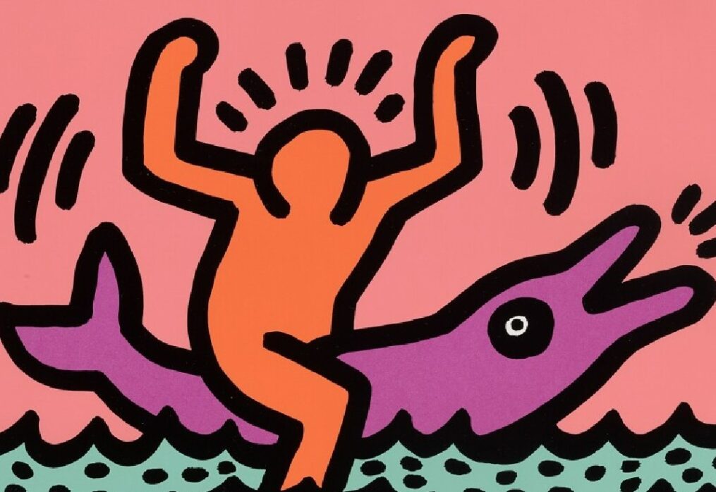Pop Shop V is notable for its combination of pink, red and turquoise as well as its subject matter. Here, swimming dolphins, walking dolphins, androgynous figures and a winged angel play out a joyful scene over four boxes in a style that is reminiscent of comics or cartoons. Boldly outlined in black, the figures recall … Continue reading Pop Shop V & Quad V, 1989