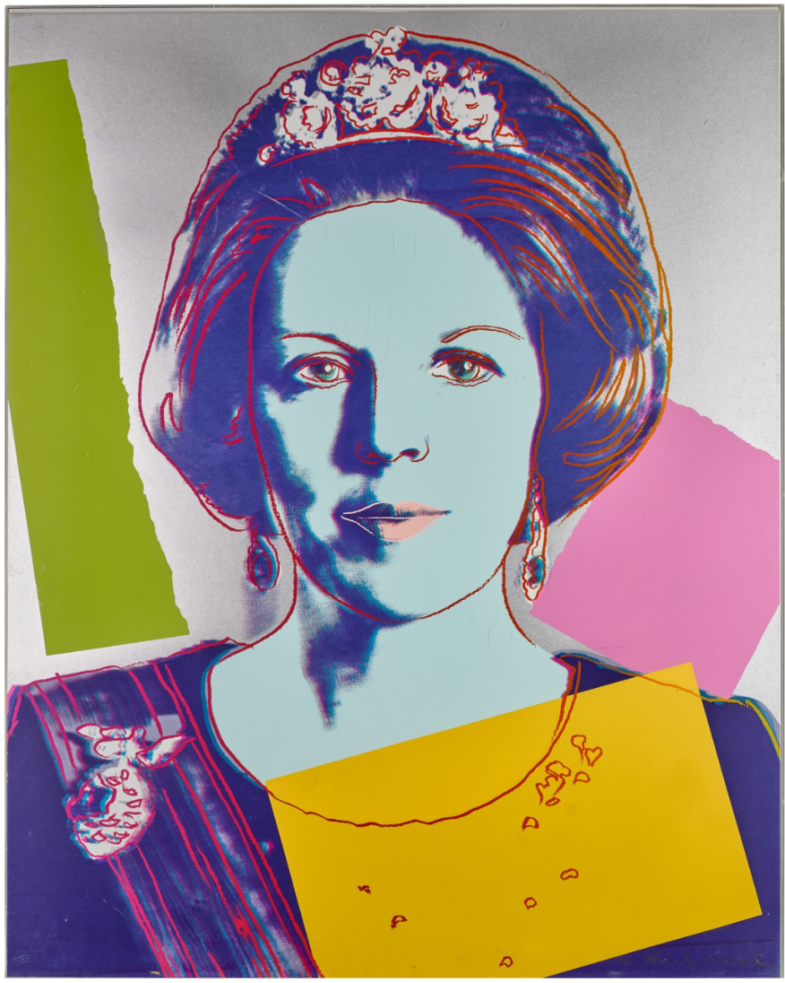 Her Royal Highness Princess Beatrix reigned as Queen of the Netherlands from 1980, until she abdicated in favor of her eldest son, the current King Willem-Alexander, in 2013. Beatrix comes from a line of reigning queens, succeeding her mother, Queen Juliana (reigned 1948-1980), who in turn succeeded Queen Wilhelmina (reigned 1890-1948), Beatrix’s maternal grandmother. Warhol’s screen-print appropriates an official portrait of Queen Beatrix taken during the celebrations for her inauguration.