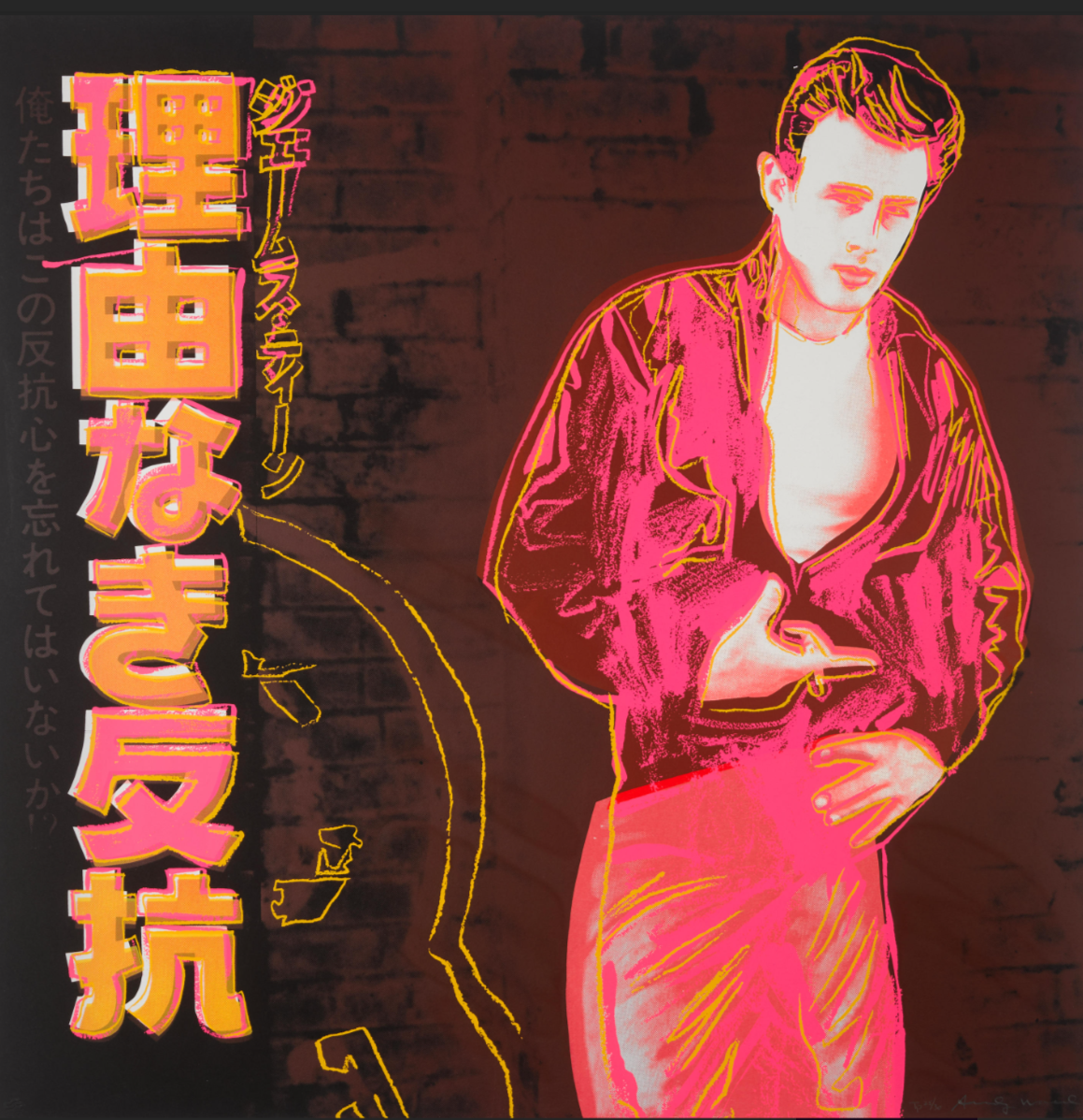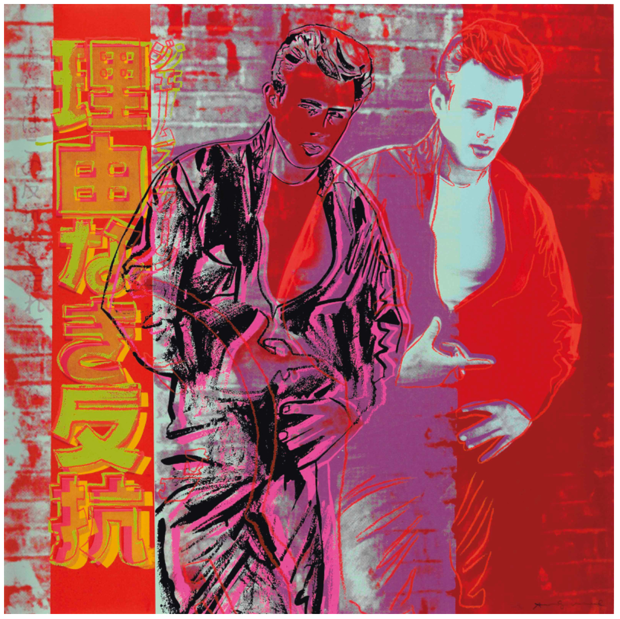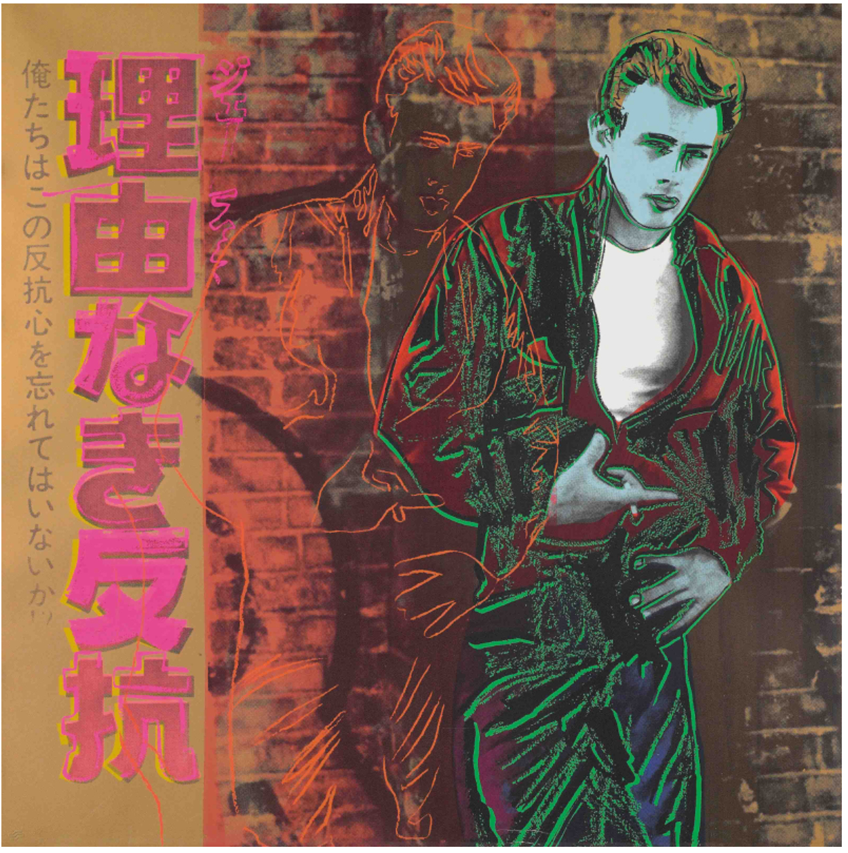 In Rebel Without A Cause (James Dean), Andy Warhol illustrates further his passion for and interest in popular culture. This print of a Japanese film poster for the 1950s film, Rebel Without a Cause, depicts James Dean as the troublemaking teenager, Jim Stark. Printed on Lenox Museum Board, this image contains an element of nostalgia, harking back to the 1950s, the era in which Warhol rose to fame. The image is rendered in unlikely colors, with bold black and green gestural lines delineating Dean’s body against a vibrant red backdrop. Dean dominates the right side of the print with a repetition of the actor appearing faintly in the center of the print. The left of the composition shows the film’s title in duotone blue Japanese script.