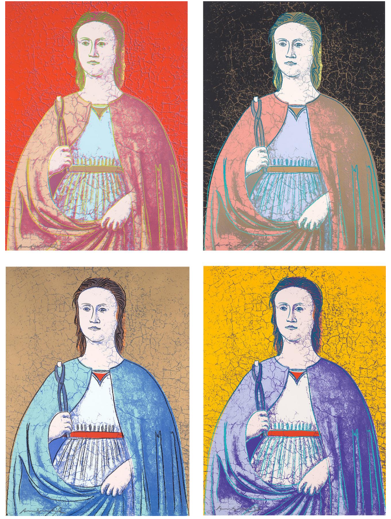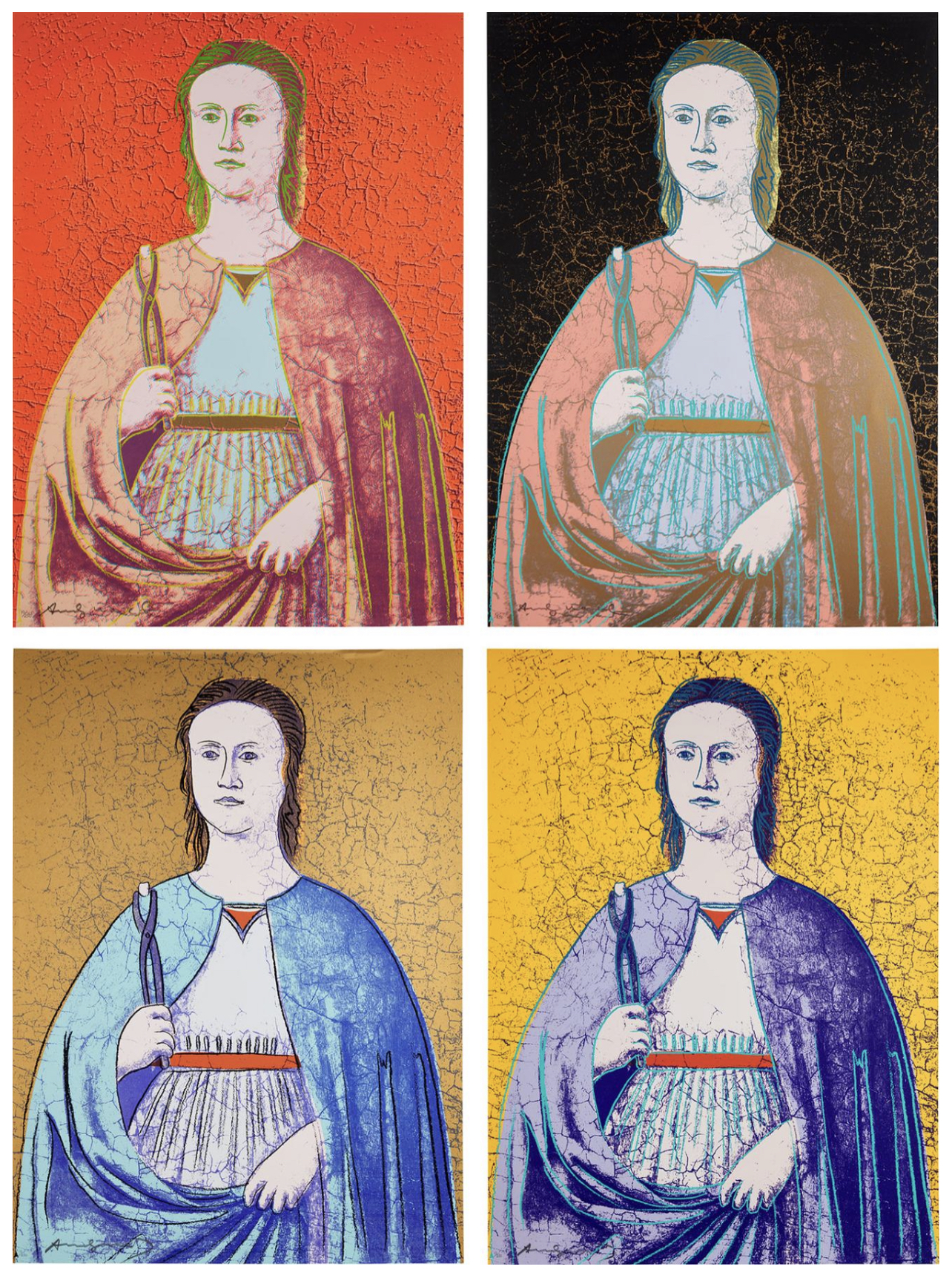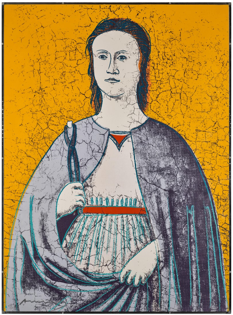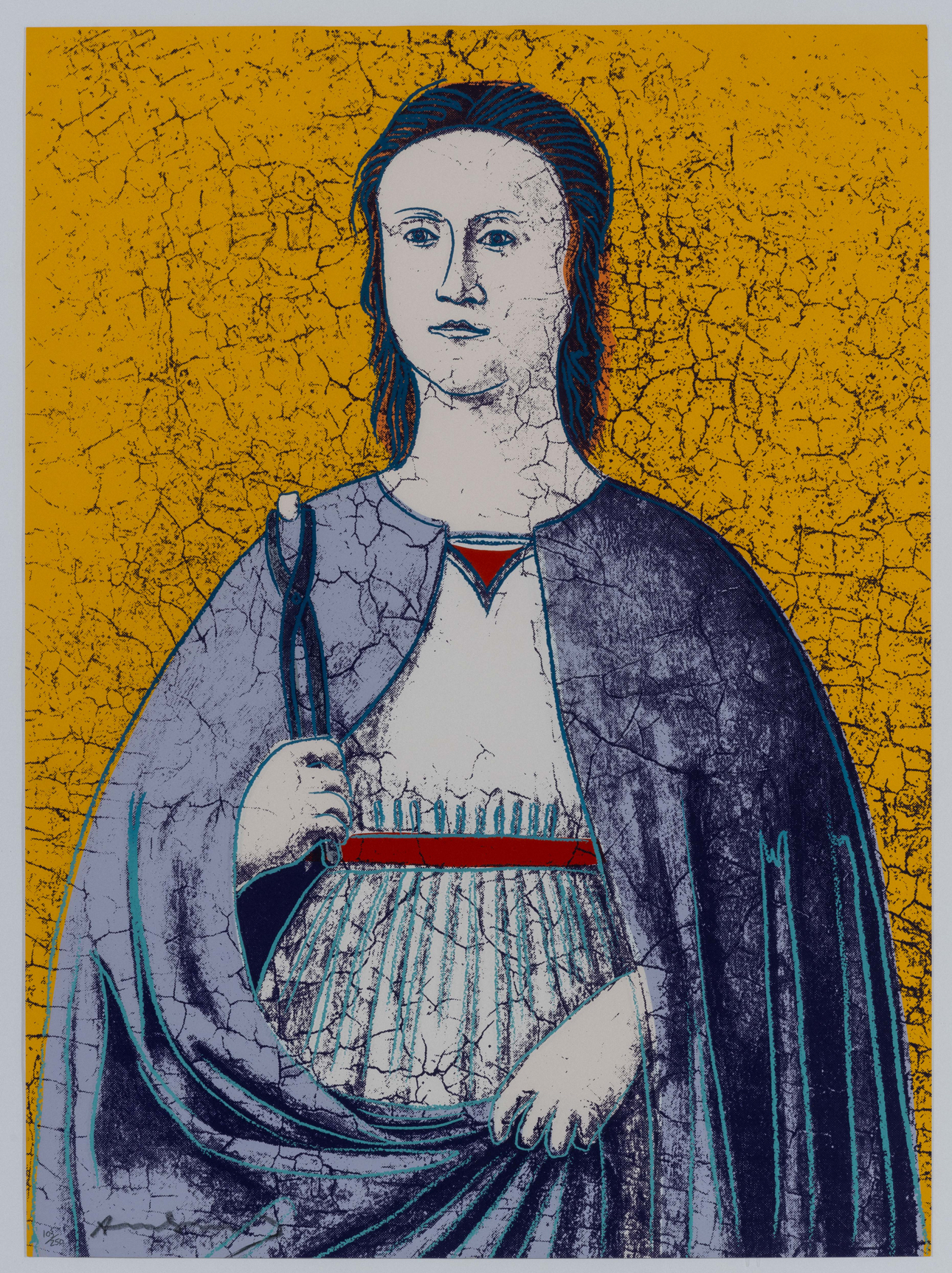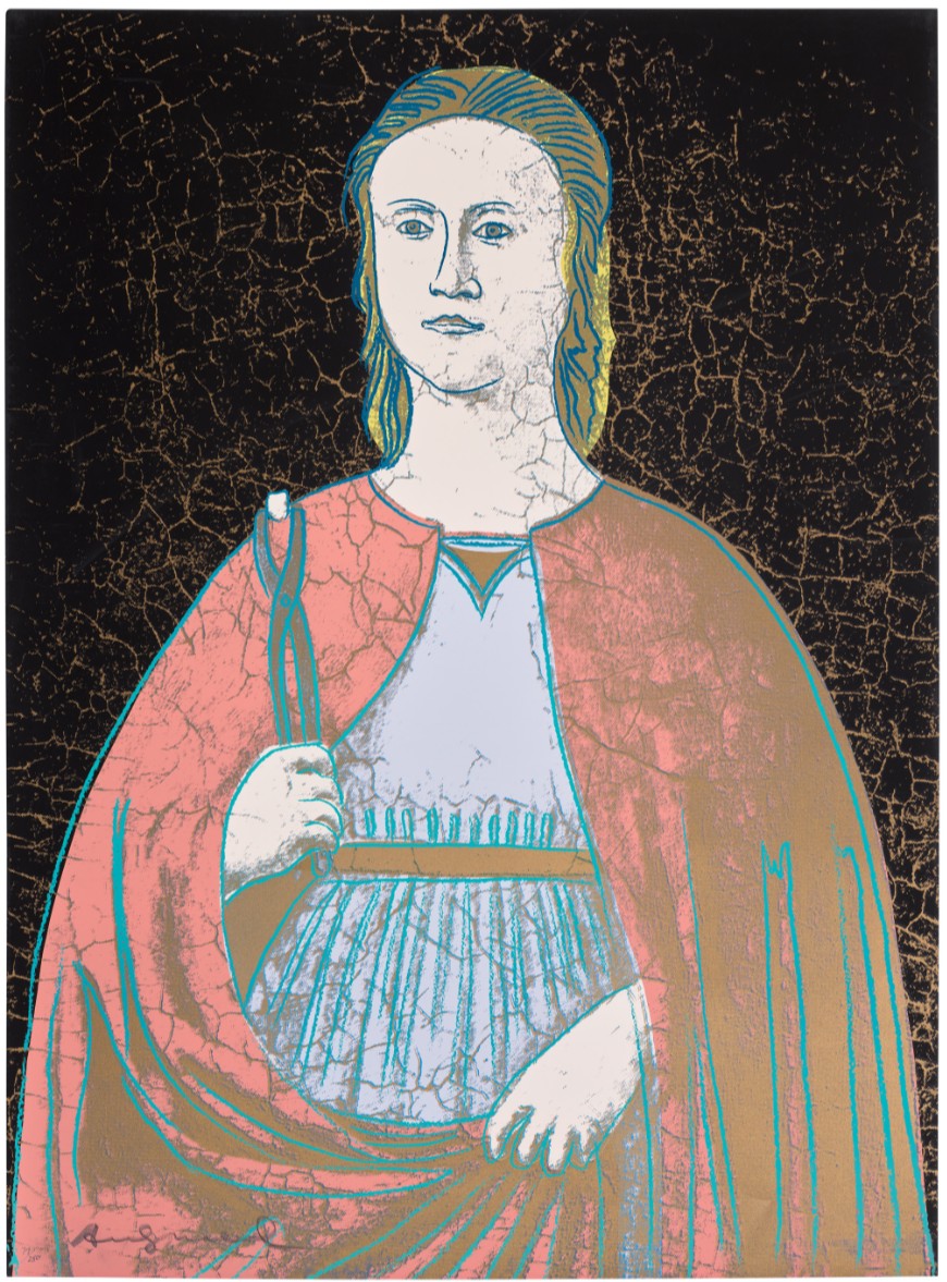Warhol’s choice to lift his subject matter from a Renaissance masterpiece aligns with other artworks he was producing in the 1980s. His 1984 series Details of Renaissance Paintings took works by Sandro Botticelli, Leonardo da Vinci and Paulo Uccello as their subject matter, transforming them for the modern day through using tightly cropped details and flat colors. In doing so, he likens the recognizability of these masterpieces to the prominence of celebrity images in modern society, exploring the idea of the icon across centuries. In Saint Apollonia, Warhol retains more of the source image’s original detail than in his other appropriations of Renaissance paintings. Rather than reducing the image of Apollonia to flat blocks of color, Warhol keeps the cracked effect of the tempera in della Francesca’s work. The image is not cropped drastically either, but simply reproduced as a commodity. By directly appropriating della Francesca’s imagery, Warhol challenges the concept of originality and commercializes the religious icon using his Pop Art aesthetic.