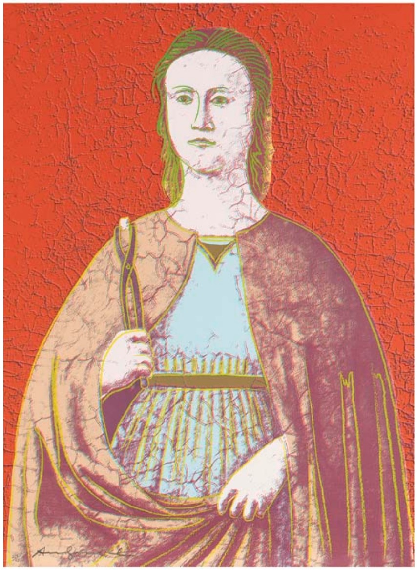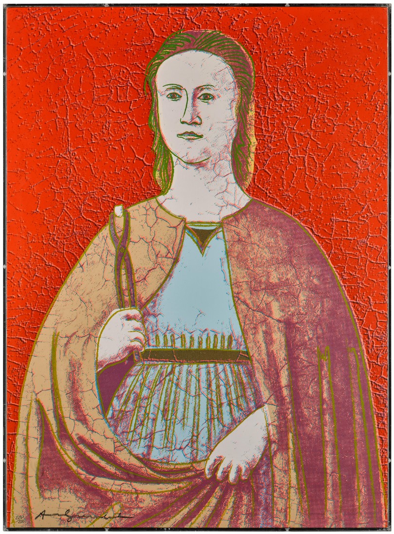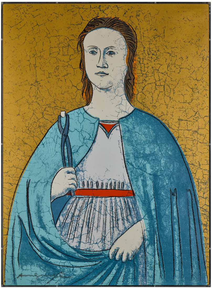 Famed for his depictions of branded consumer goods and 20th century celebrities, in Saint Apollonia Warhol appropriates his subject matter from a 15th century painting attributed to Piero della Francesca. Originally conceived as an altarpiece, della Francesca’s painting commemorates the ecclesiastical tale of Saint Apollonia, who was captured by the Alexandrians during a siege circa 248 AD. Tortured for her Christian beliefs, her teeth were extracted using the plyers she is depicted holding in both Warhol and della Francesca’s images. Threatened with being burnt at the stake unless she uttered blasphemous words against Christ, Apollonia made the ultimate sacrifice for her religious beliefs and threw herself into the fire.