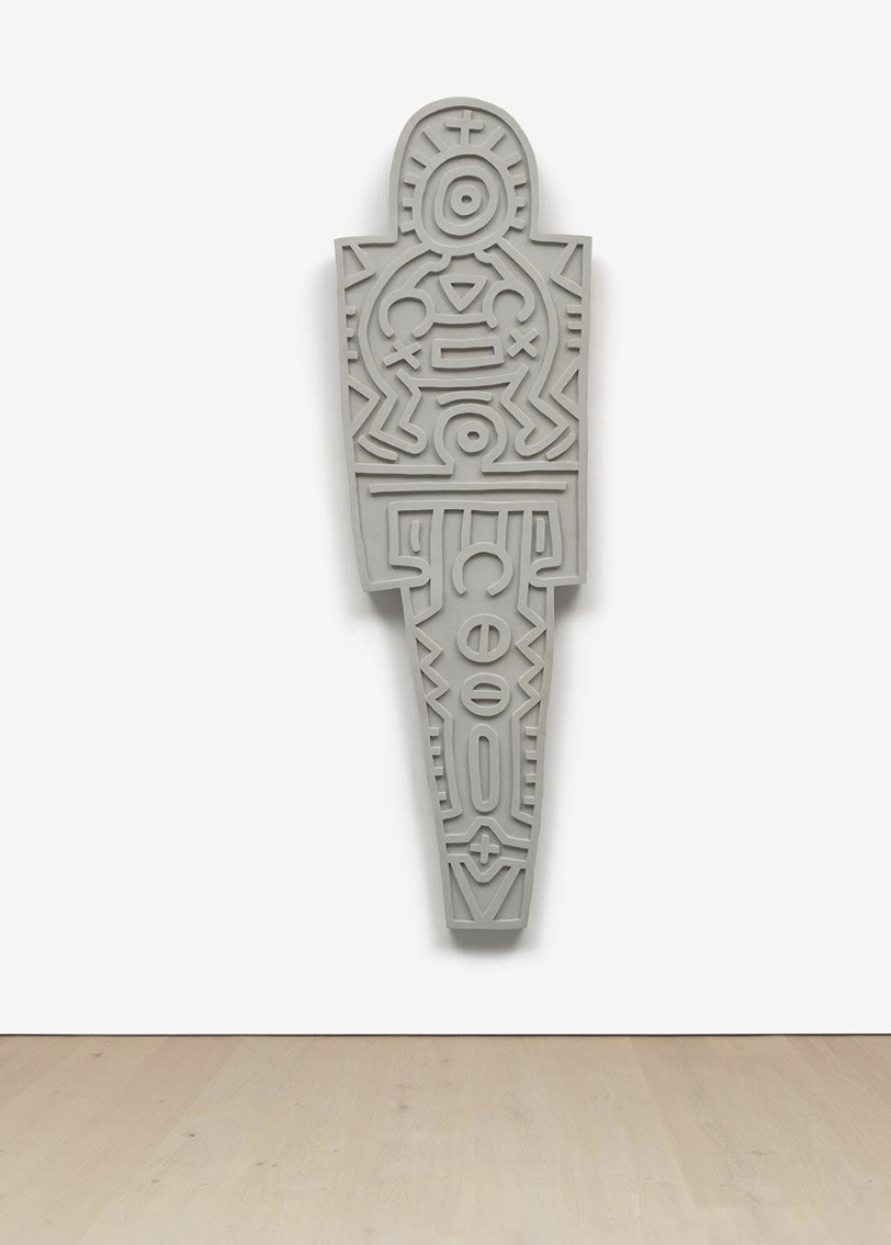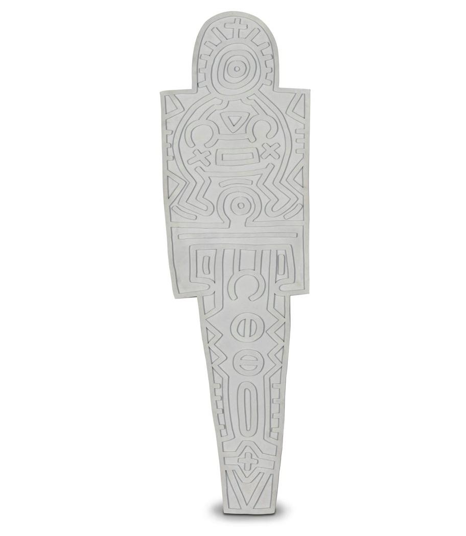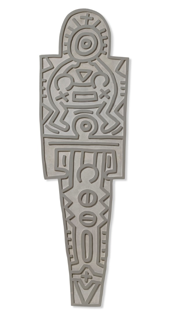 For Keith Haring, who had been drawn to the imagery of ancient and primitive cultures throughout his career, the symbolic spiritualism of a totemic object made it the perfect form for his own idiosyncratic visual lexicon of signs and symbols. Made the same year as the artist was diagnosed with AIDS, the sarcophagus shape recognizes man’s mortality but hints at an embalmed, immortal afterlife. Within the confines of the concrete sarcophagus outlines, Haring’s energetic and busy figures are pushing the boundaries in which they’ve been encased. Jumping and reaching toward the sun, the two figures at the top of Totem are living, striving for that which we all chase. Reflective of Haring’s own history, challenging societal norms, Totem captures the vitality of life but reminds us of its impermanence.