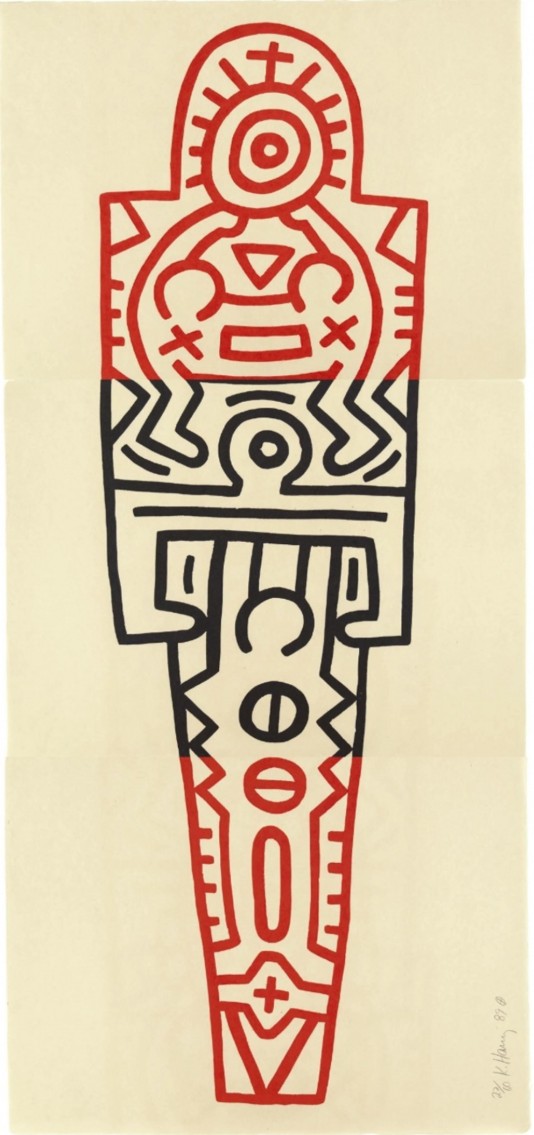 The most recognized print edition is a large-scale, three-part woodcut on Japanese paper. It features a single, vertically oriented, human-like figure composed of Haring’s iconic “matchstick” men and symbols in a symmetrical pattern, primarily in red and black ink. This edition is signed and numbered in an edition of 60.