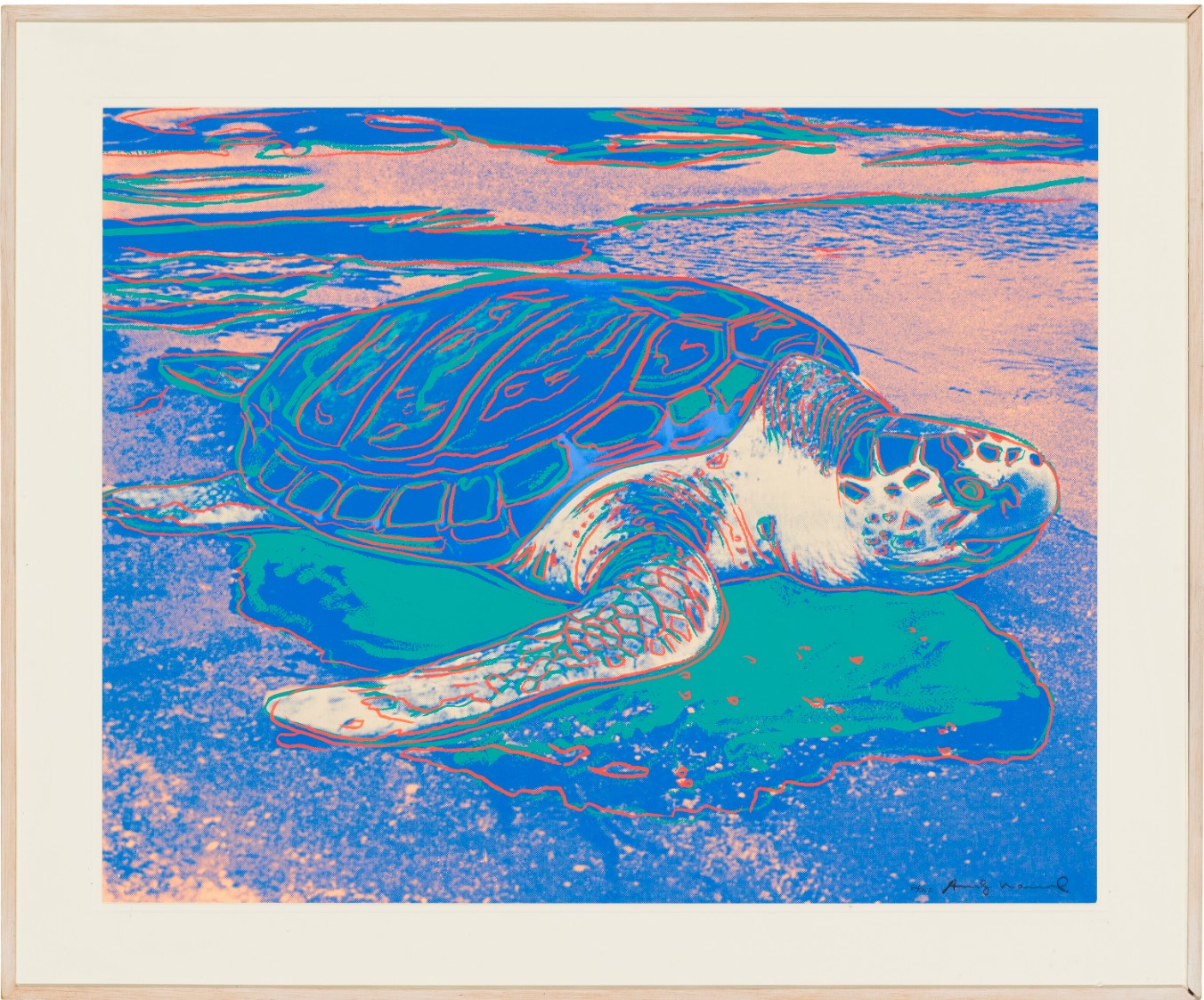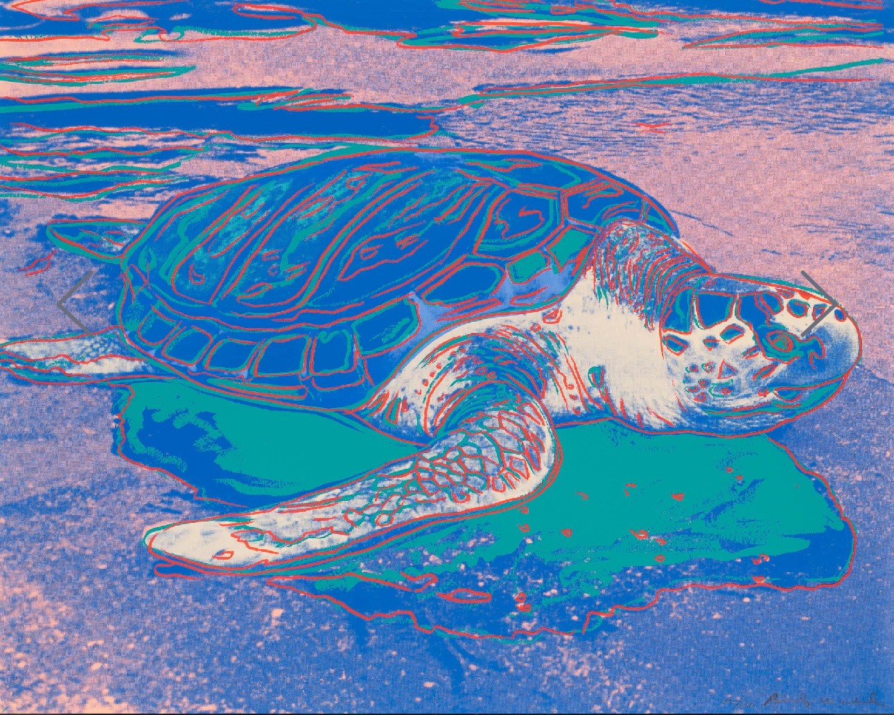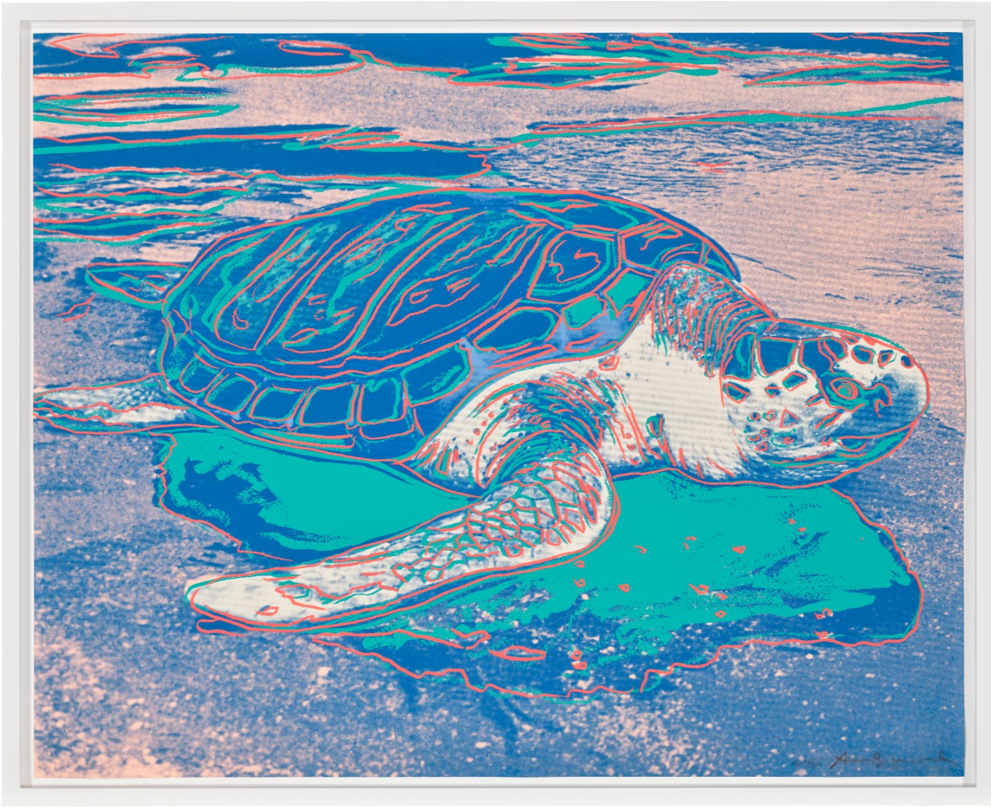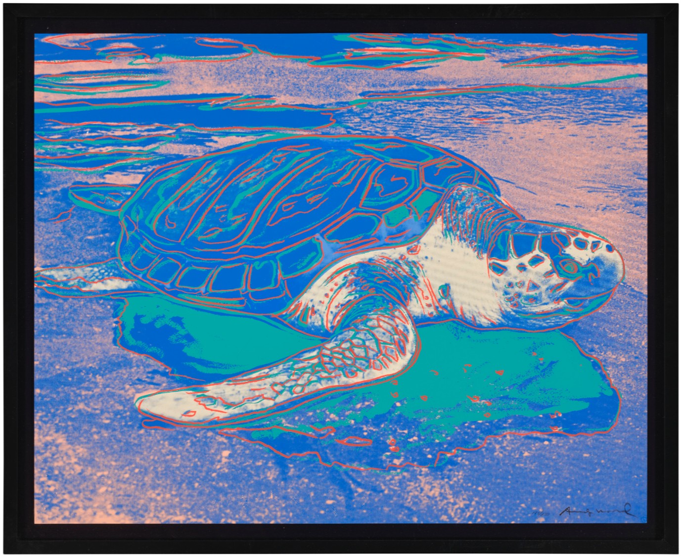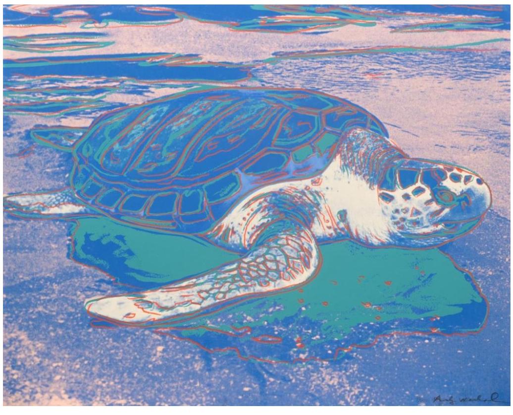 Within the broader spectrum of Andy Warhol’s oeuvre, Turtle finds resonance with his Endangered Species series created two years earlier. Similarly to Turtle, in this body of work Warhol turned his iconic pop sensibility toward the natural world, showcasing the lively nobility of ten animals listed in the Endangered Species Act of 1973, such as the African Elephant, Siberian Tiger, and San Francisco Silverspot Butterfly. By placing these animals in the same spotlight he often reserved for celebrities, Warhol helped raise awareness of these endangered animals and raise funds for conservation. His strong affinity for animals is felt in Turtle, which captures the majesty of this ancient sea creature and presents it in its natural habitat, as opposed to captivity.