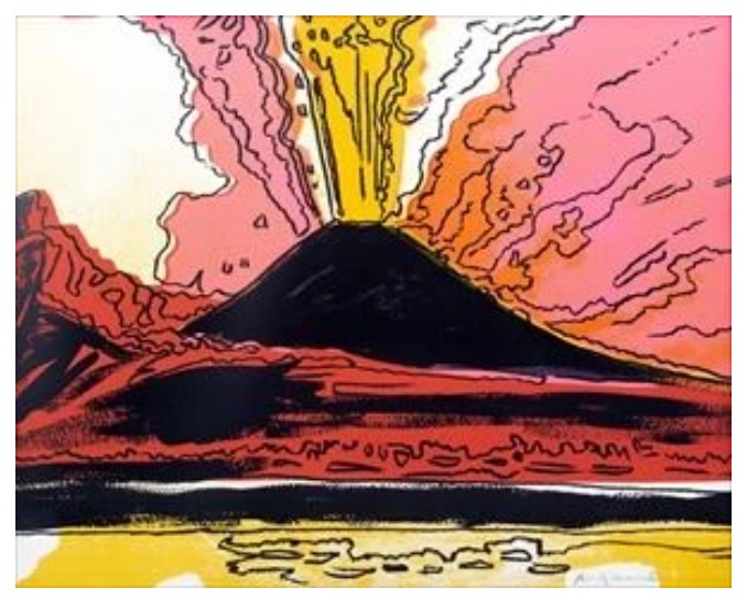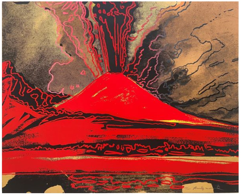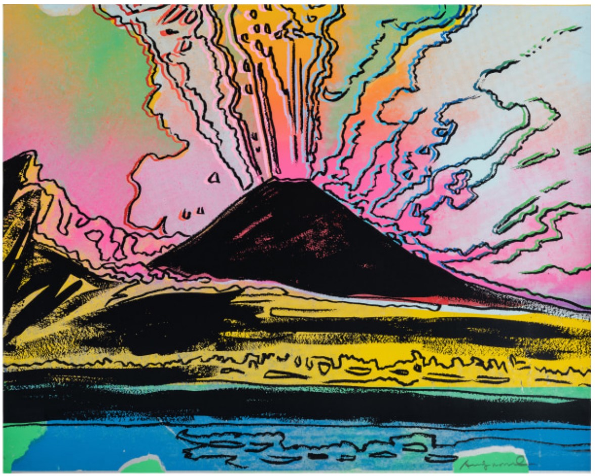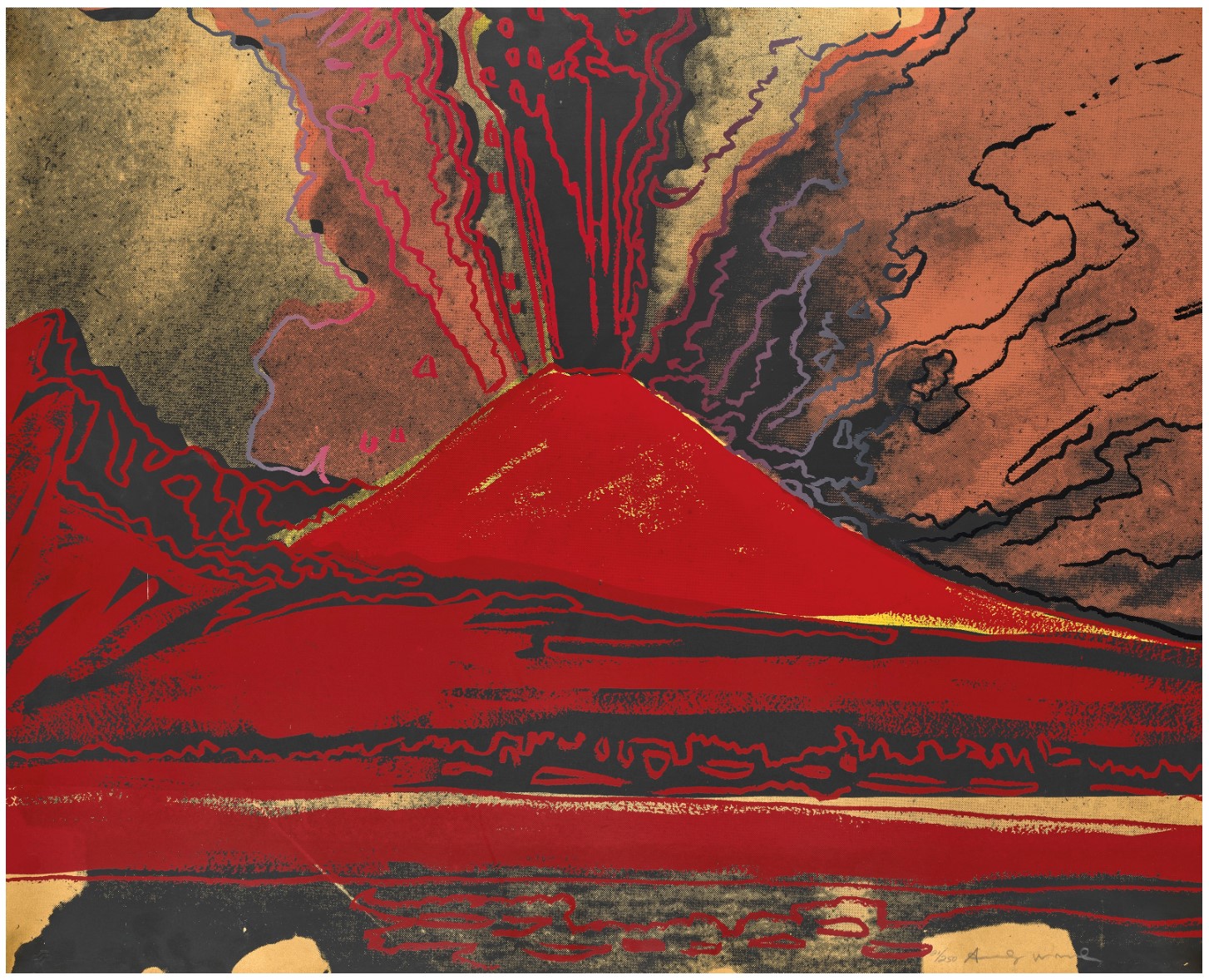 Using color fields of bright red, contrasted against black and multicolored lines to show the eruption, Warhol creates a powerful image that combines his two most renowned themes: the legacy of art history and the enduring presence of death. Reconsidering the grave display of death in his powerful images of electric chairs, car crashes, and suicides in the early 1960s, Vesuvius embodies this sense of impending doom and destruction in a more vivacious and dramatic style.