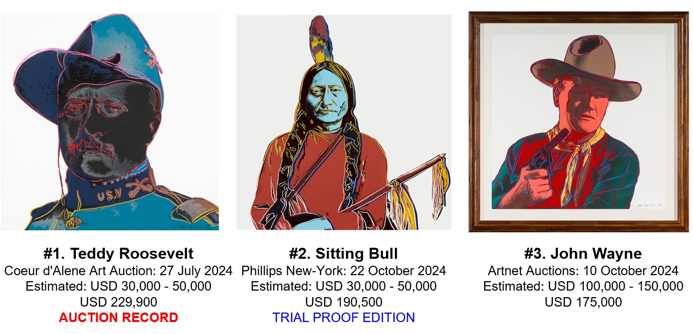 | 2024 | Sold Twice Average Price: USD 162,950 Auction Record Price: USD 229,900 (236/250) @ Coeur d’Alene Art Auction on 27 July 2024 70/250: USD 96,000 @ Lone Star Art Auction on 12 October 2024 No Trial Proof sold at Auction in 2024 |