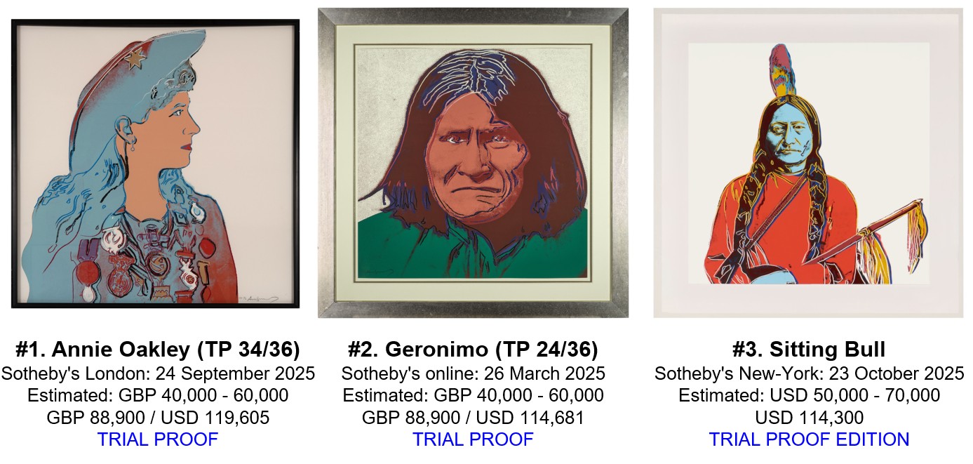 The second highest price of 2025 has been achieved by a Trial Proof of Geronimo. Geronimo (TP 24/36) sold at Sotheby’s online, on 26 March 2025 for GBP 88,900 (USD 114,680). A regular edition of Geronimo also sold at auction in 2025, at Christie’s, in New-York, on 16 April 2025 for USD 47,880).